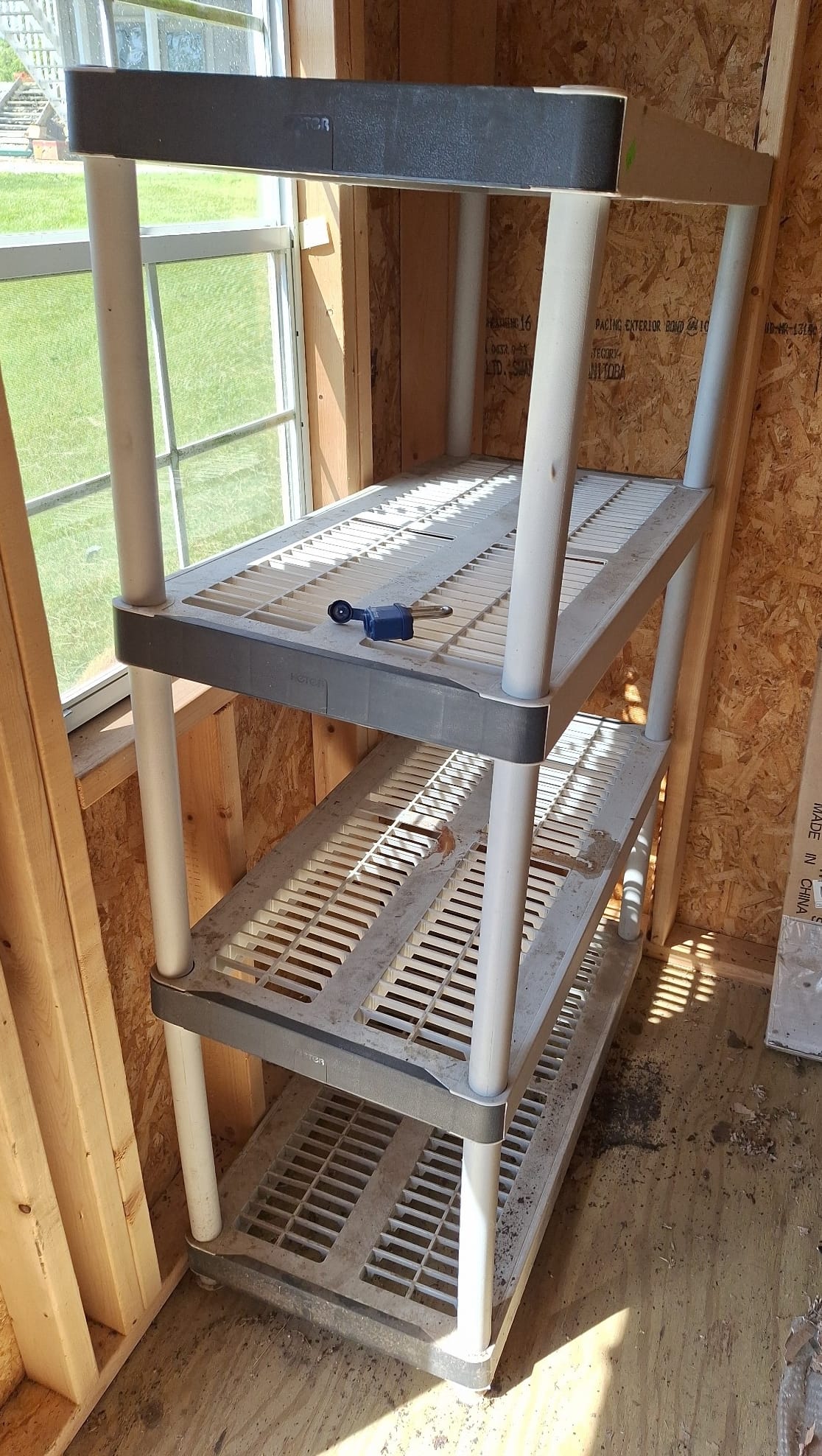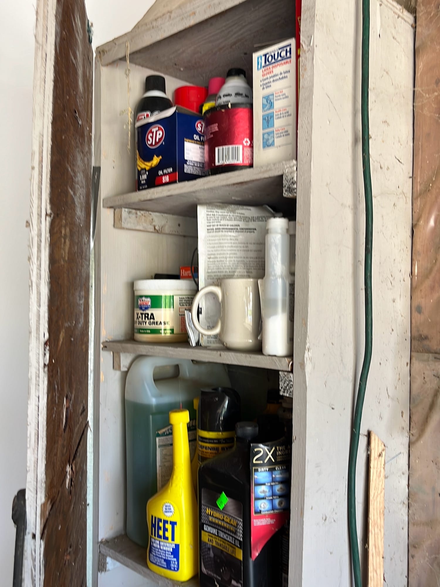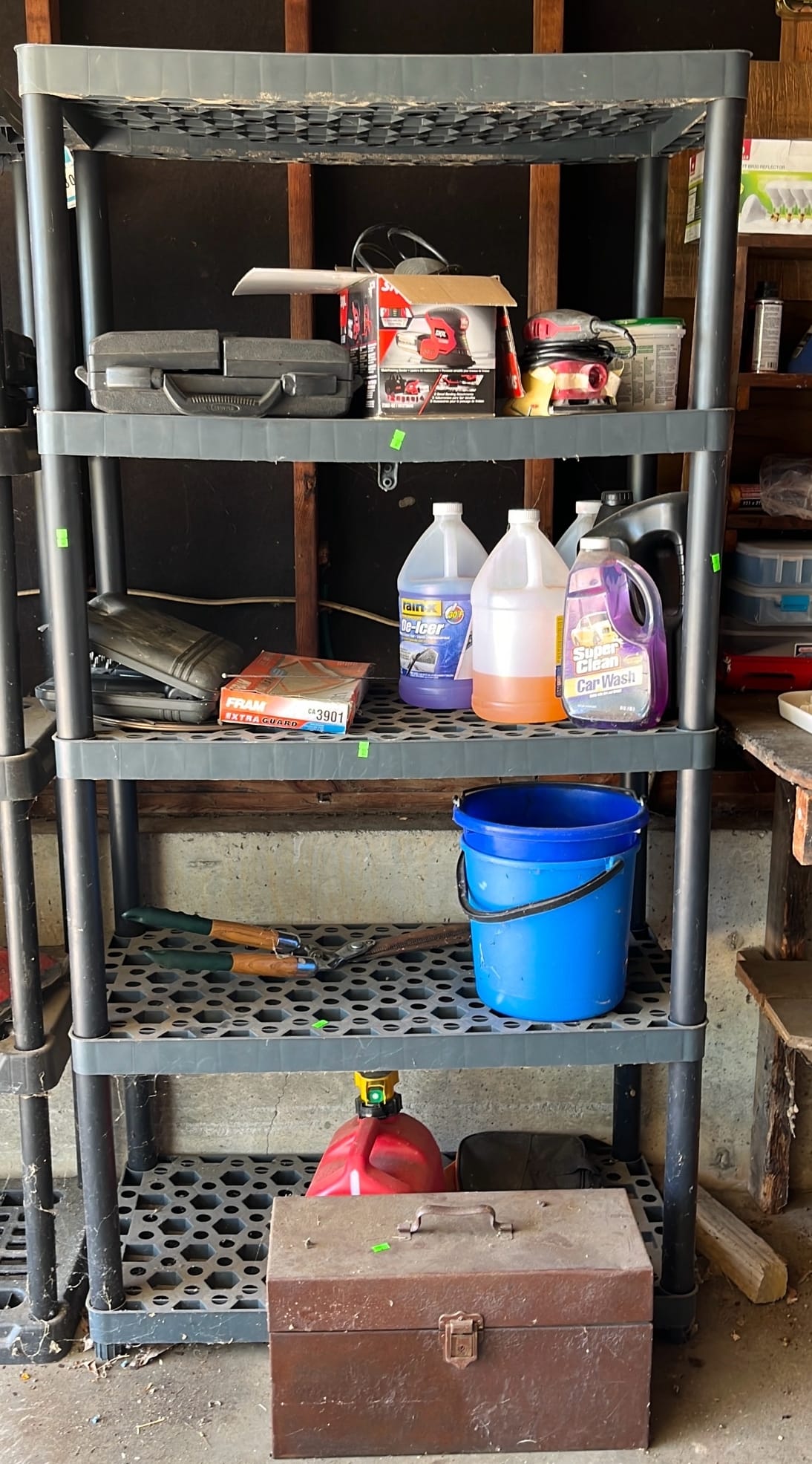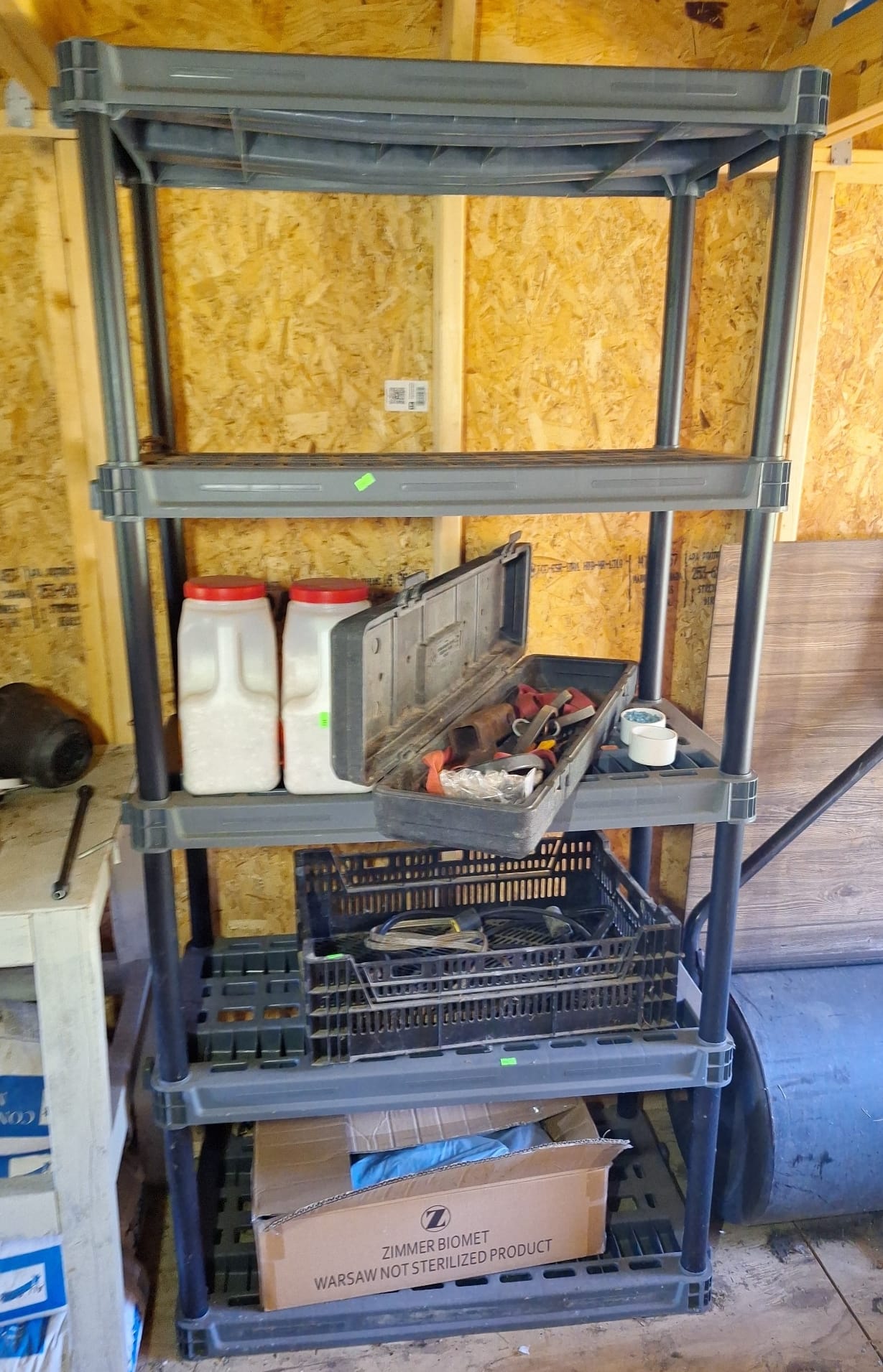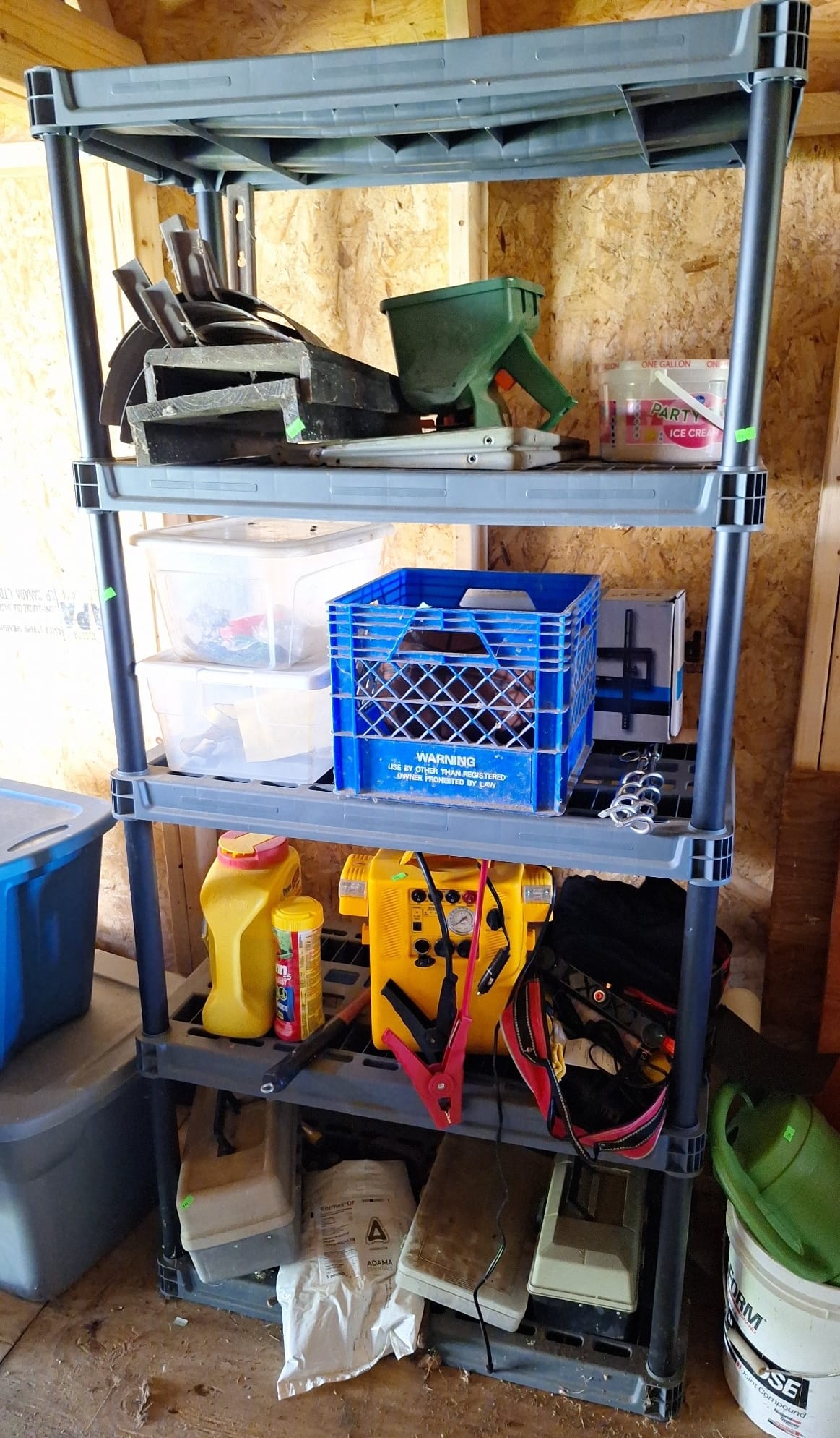 714 Plastic shelf 36x17x74, Ice melt, Rain jackets, Bungee cords