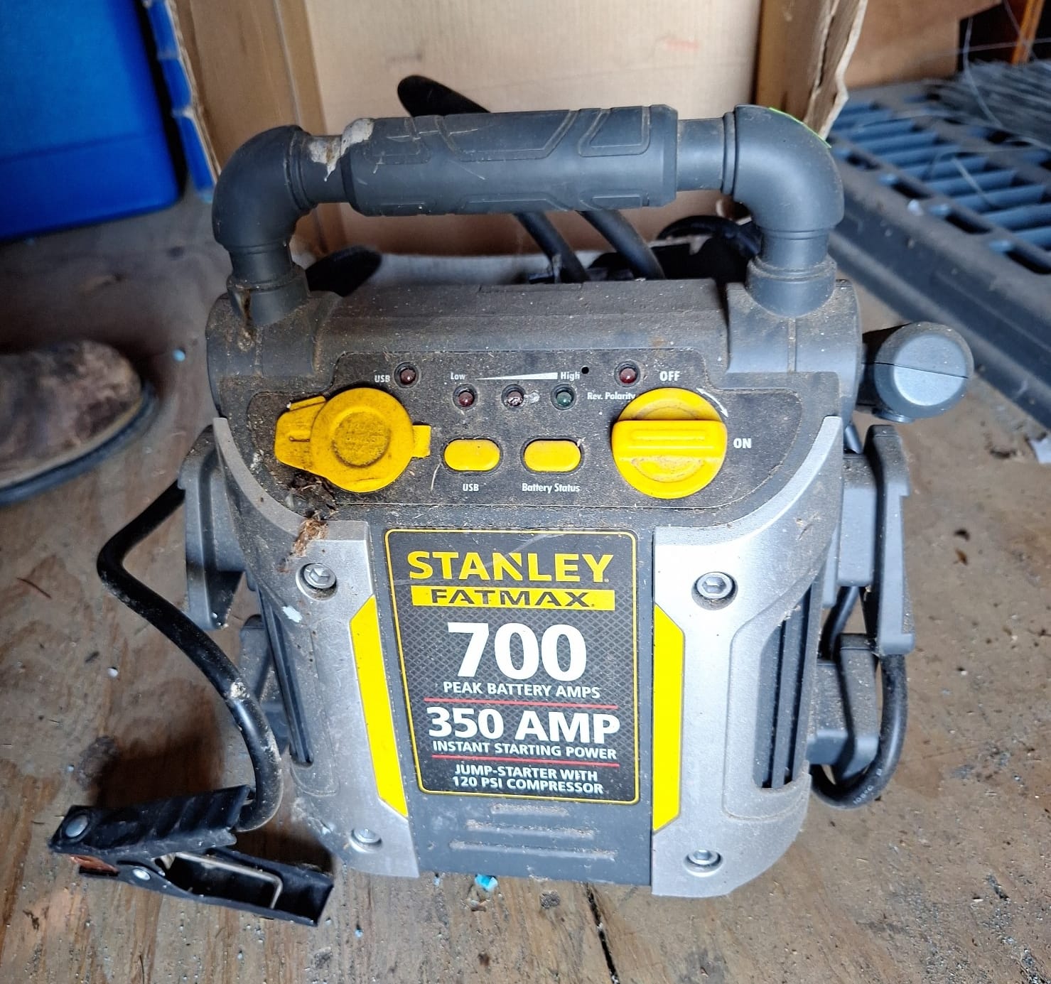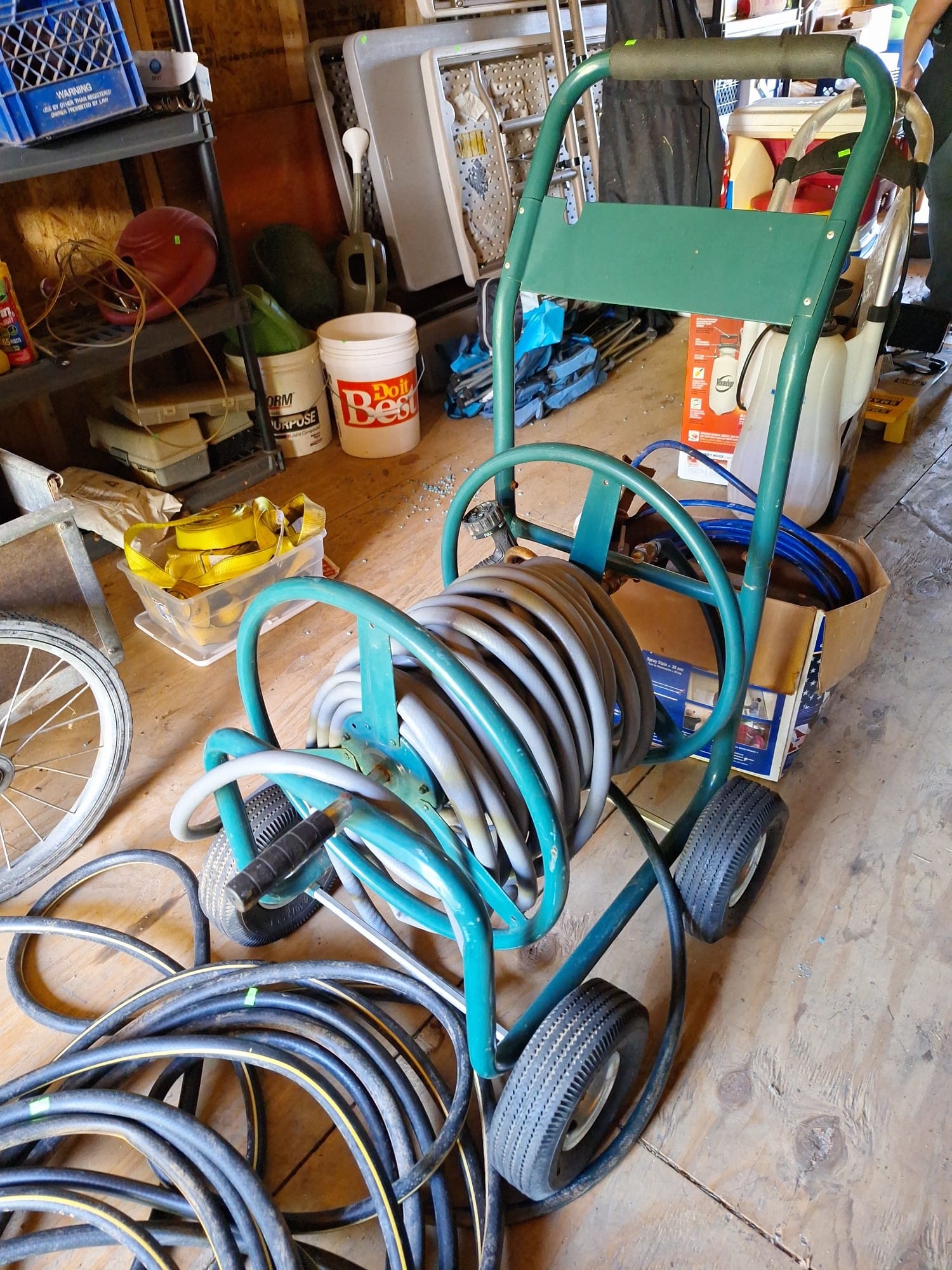 741 Plastic shelf 36x17x74, hose racks, battery charger, contents of shelf