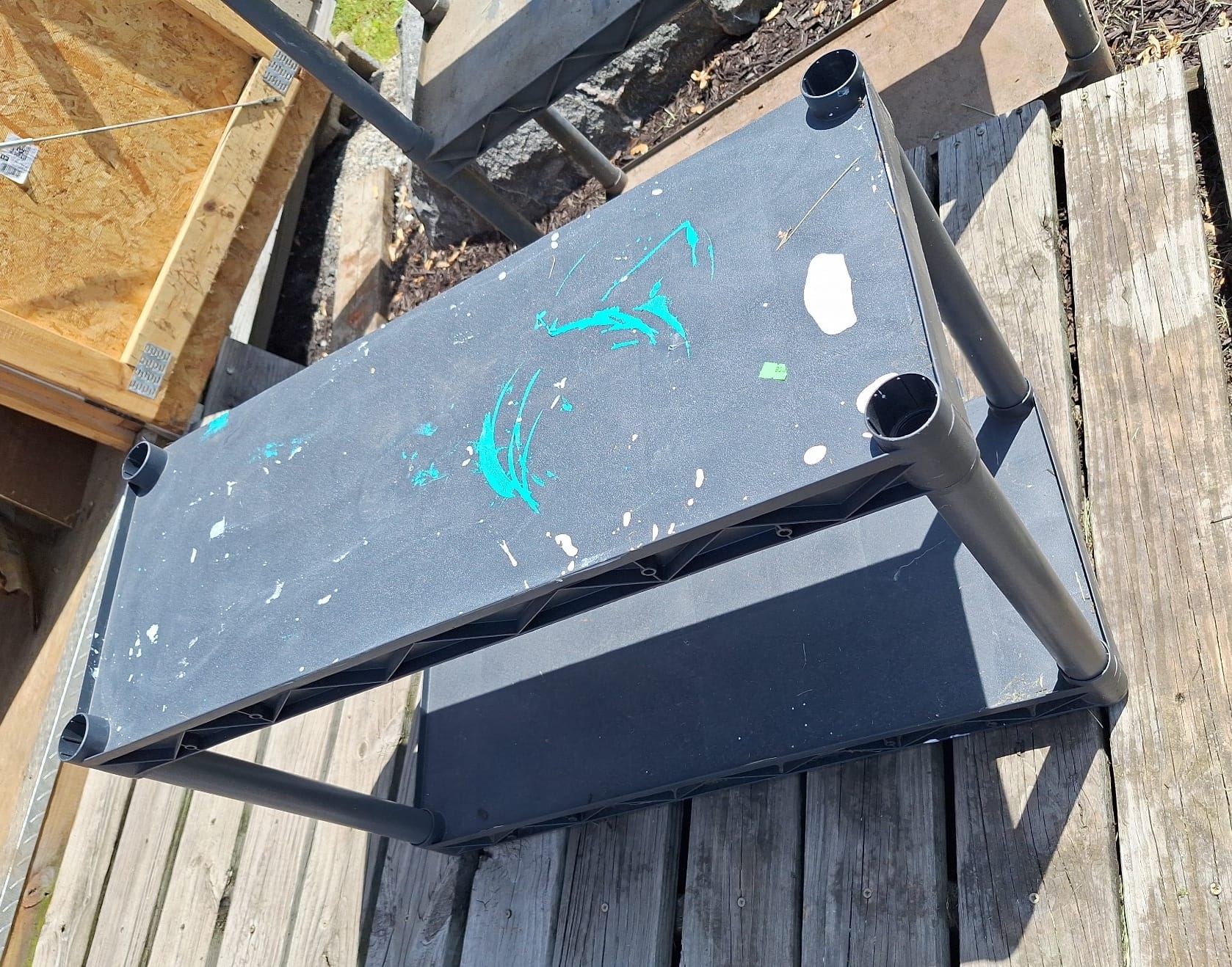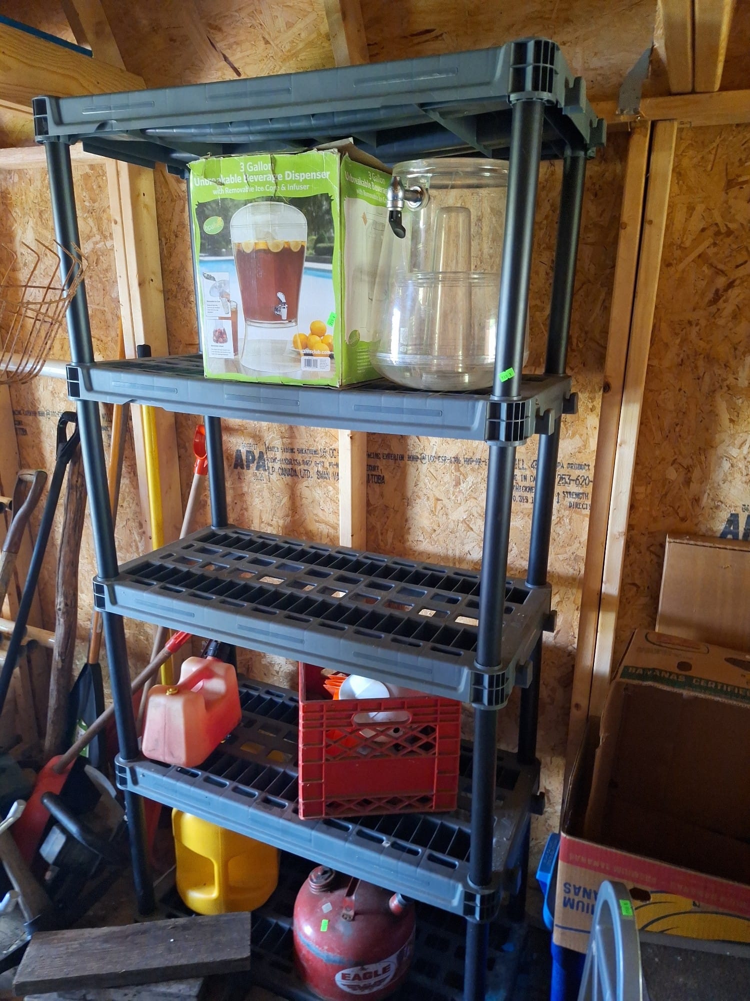 719 Plastic shelf 36x17x74, drink dispenser, gas cans, milk crate