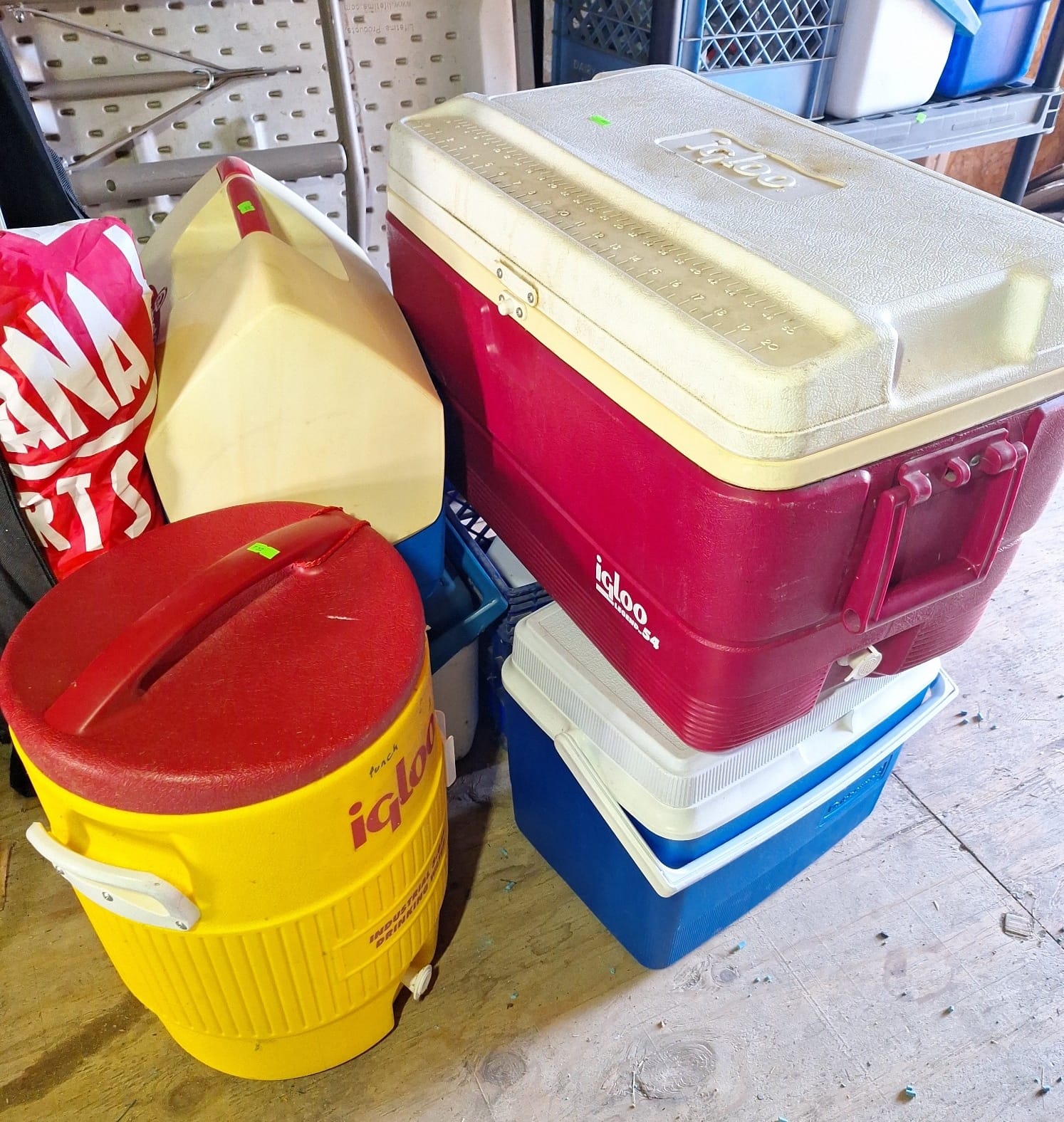 732 Cooler assortment - Igloo, Rubbermaid, 5gal drinking water dispenser