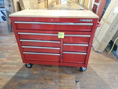 183 Husky Tool cabinet with wood top, paintloss on front, has keys and liners with powerstrip, on casters, soft close drawers 42x18x37"