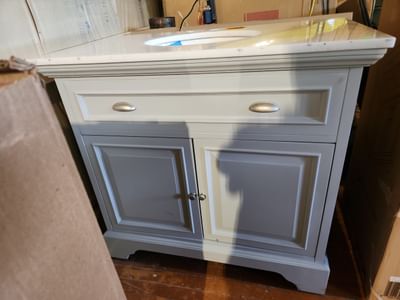 108 Glacier Bay vanity combo pearl gray, small crack on top 30.5x18.7x35"