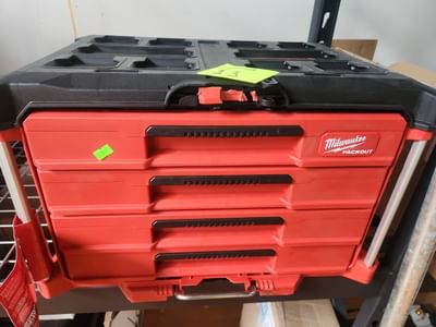 182 Milwaukee tool cabinet LOCKED, NO KEYS on casters with powerstrip 46x22x38.5"