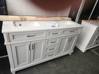 902 Double vanity Talmore, sky Grey soft close drawers with backslash 60"