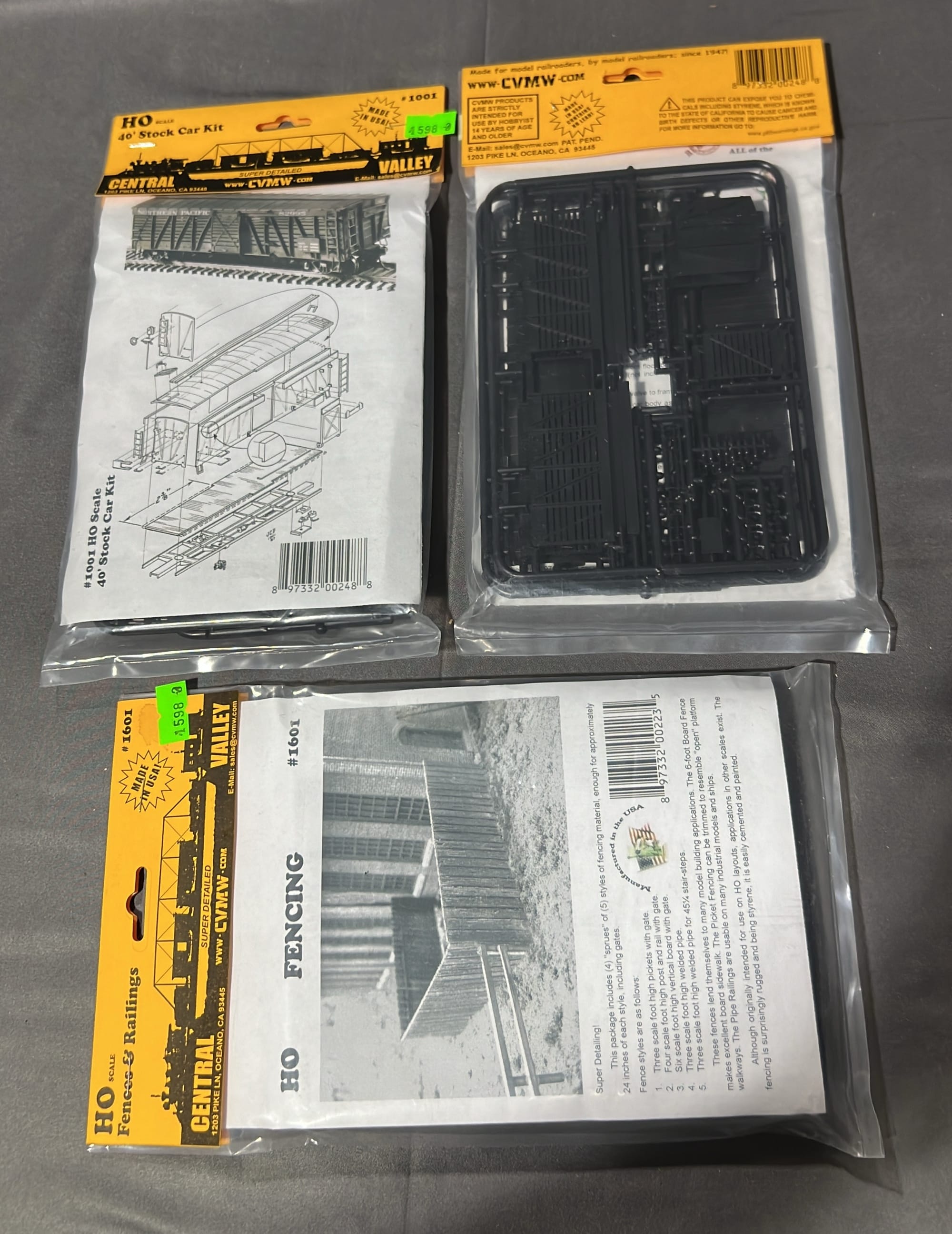 1598 Two - Central HO Scale 40’ Stock Car Kits NIP & HO Scale Fences & Railings NIP