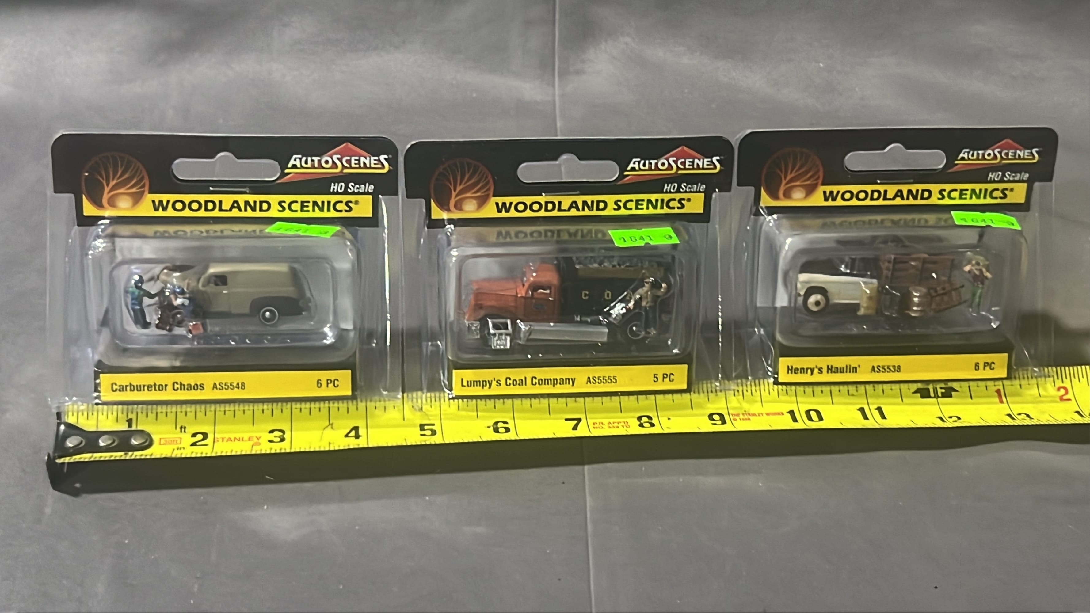 1641 Three - Auto Scenes Woodland Scenics HO Scale NIP - Carburetor Chaos • Lumpy’s Coal Company • Henry’s Haulin