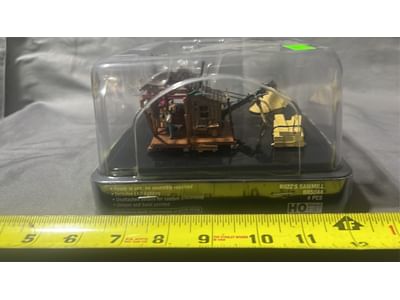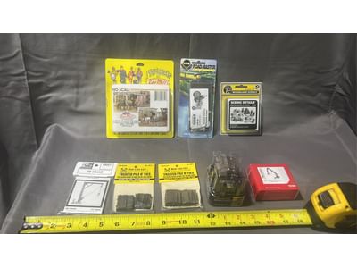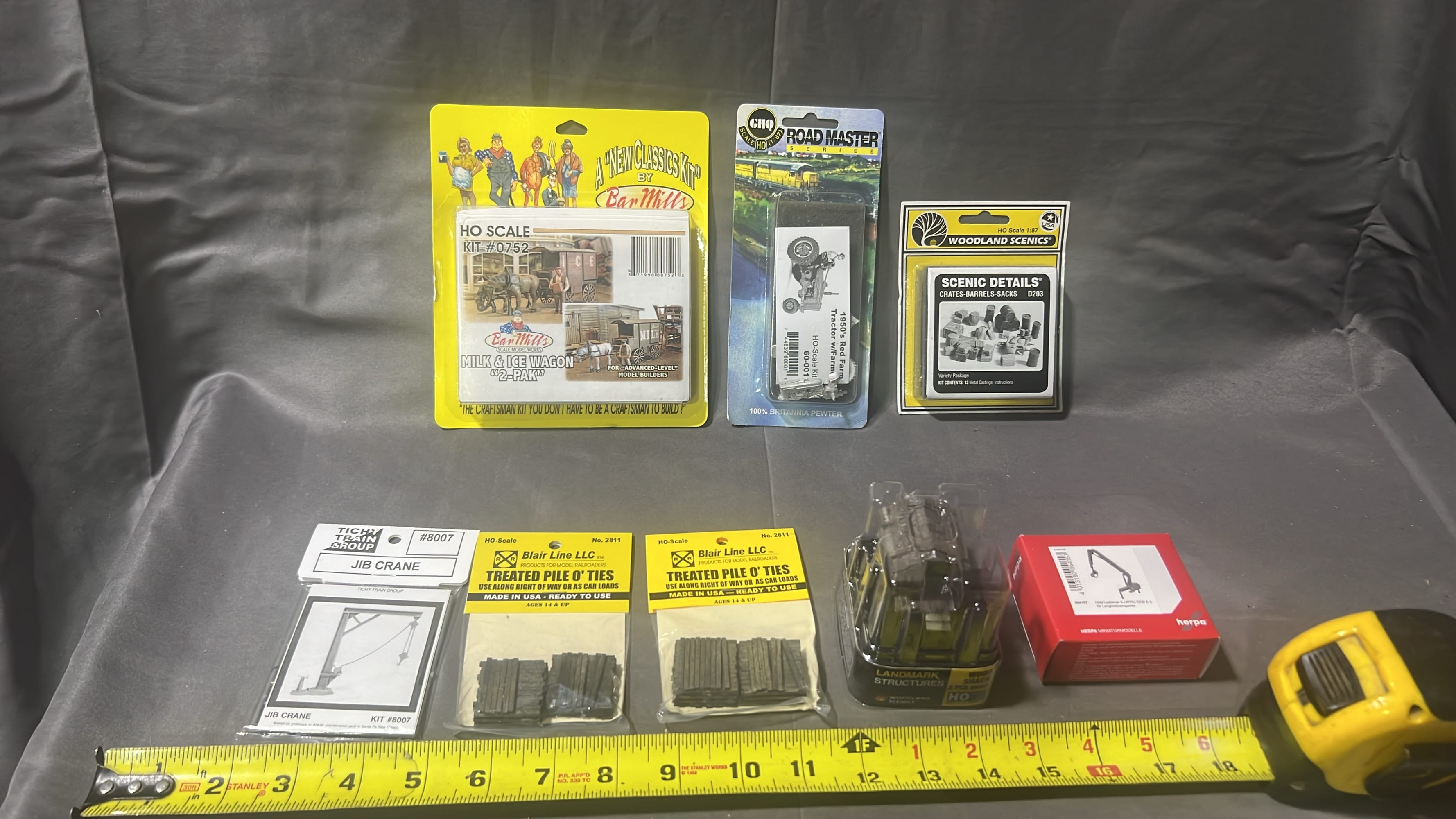 1650 Landmark Structures Woodland Scenics Wood Shack HO Scale 1:87 NIP • (2) Blair Line LLC Treated Pile O’ Ties • Woodland Scenics Details HO Scale 1:87 NIP • A “New Classics Kit” Milk & Ice Wagon HO Scale • RoadMaster Series HO 1:87 1950’s Red Farm Tractor w/ Farmer Pewter NIP • Herpa Hiab Ladekran X-Hipro NIB • Tichy Train Group Jib Crane NIP