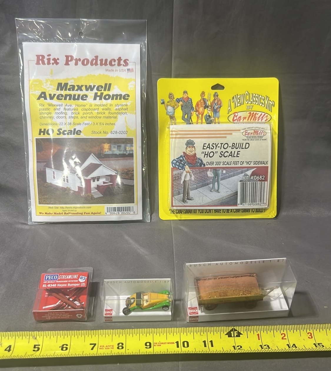 1651 New Classic Kits Easy-To-Build “HO” Scale NIP • Busch Miniature Car & Wagon NIP •Peco Streamline HO Scale SL-8340 Hayes Bumper NIP • Rix Products Maxwell Avenue Home HO Scale NIP