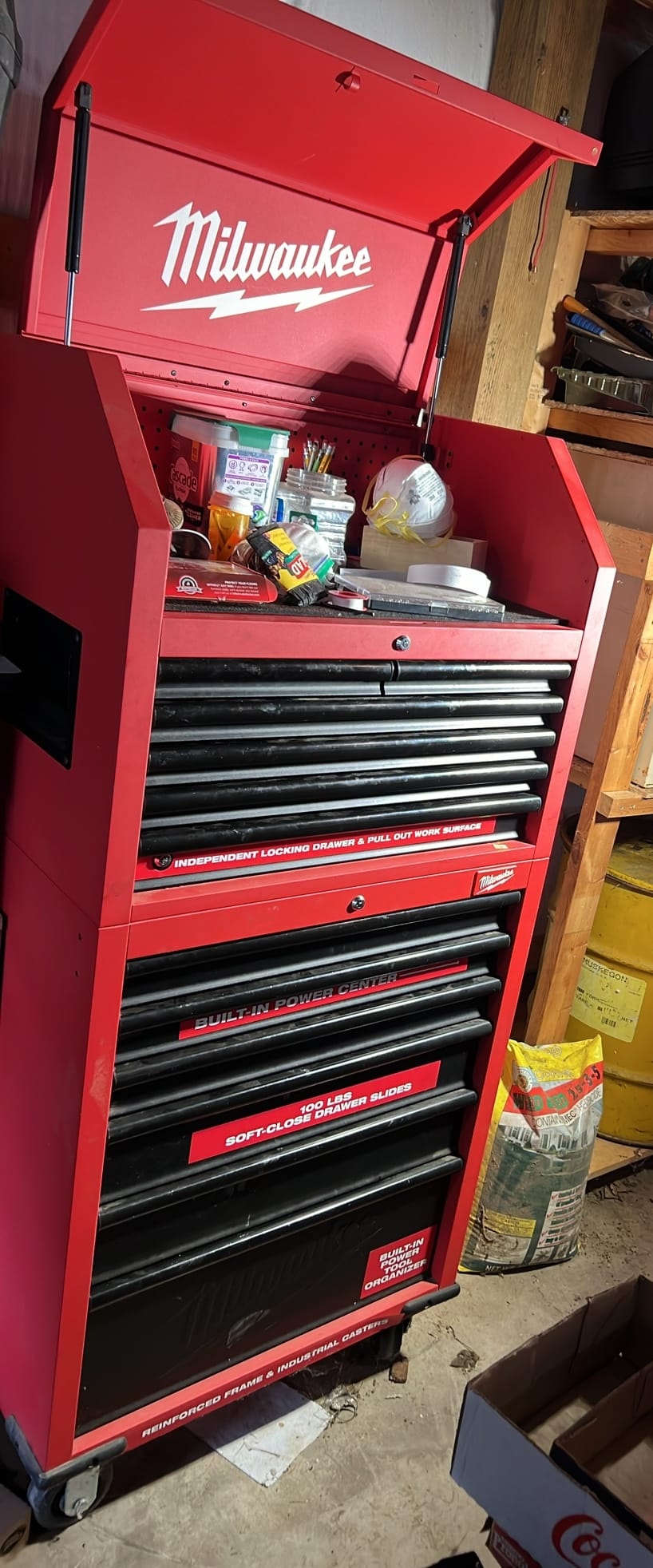 19 Milwaukee 30 Steel Storage chest and Rolling Steel Storage cabinet ,30”x18”x 67” , has power strip , contents included ,see pictures