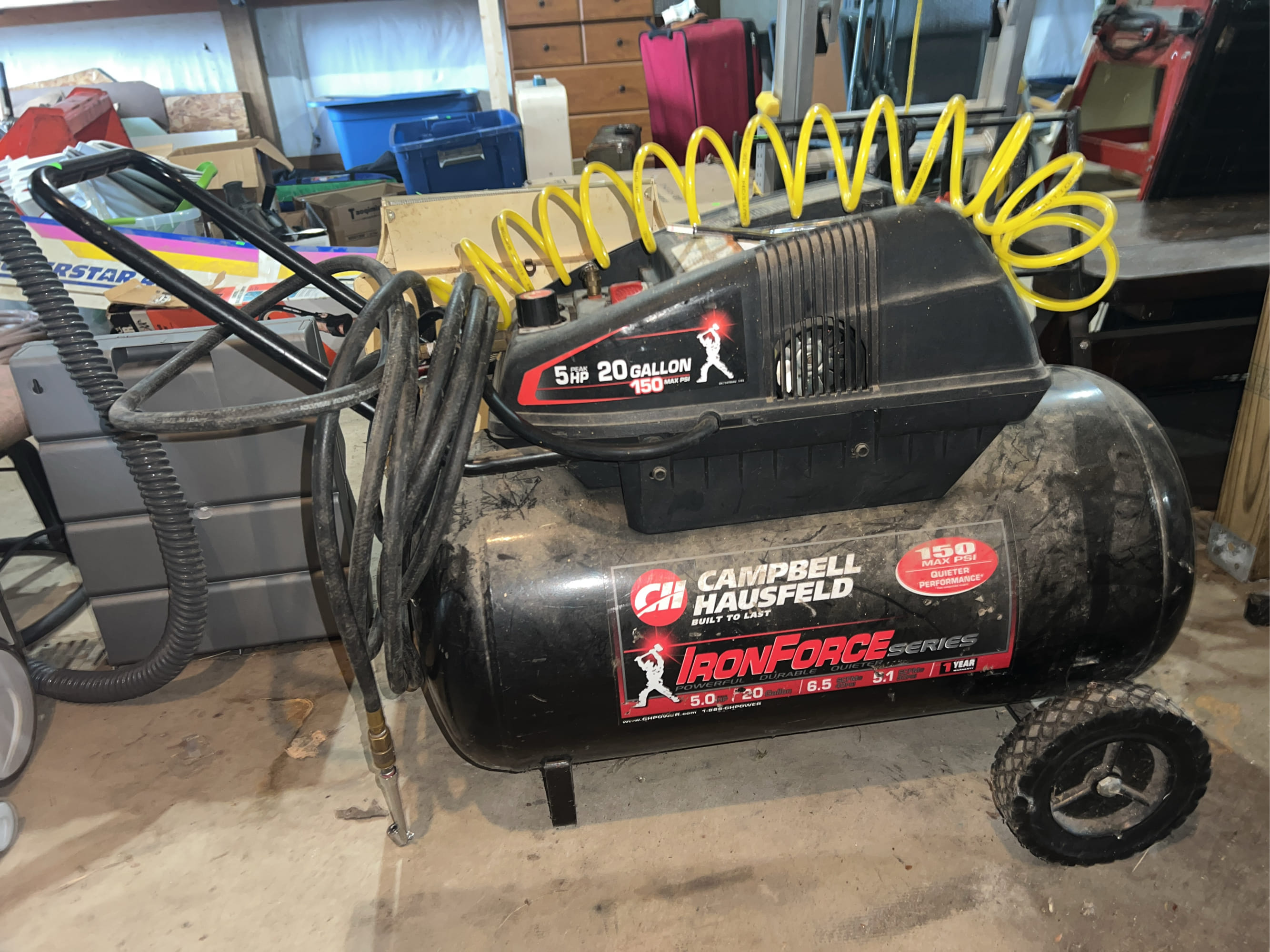 22 Campbell Hausfeld 5 HP Air Compressor with Gauges & Hose • Model #WL651100AJ • 20 Gallon • 150 PSI