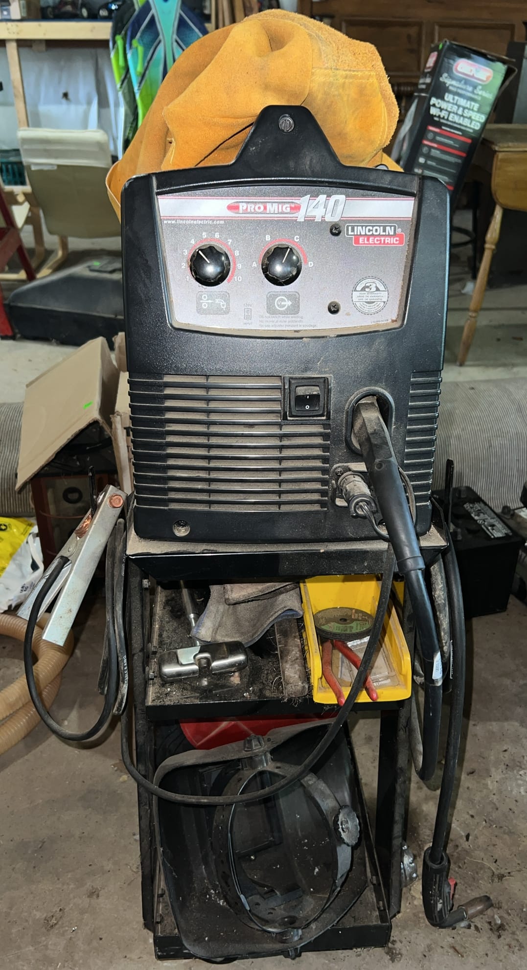 23 Lincoln Pro Mig Welder 140 on Cart 11”x28”x17.5” with Tank • Helmet • Leather Welders Apron • accessories • Serial #M3120106242
