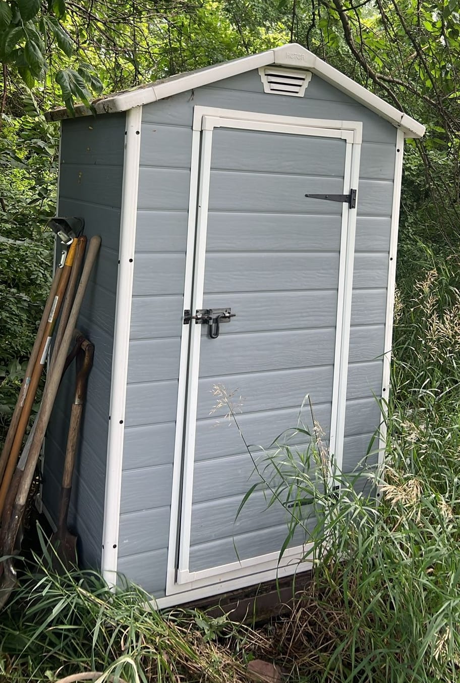 28 Keter Plastic Shed ,35”x45”x78”,contents not included, small hole on back does not go clear through to inside