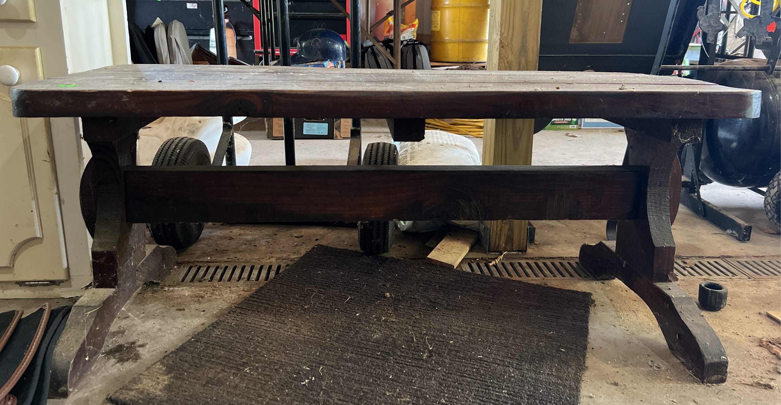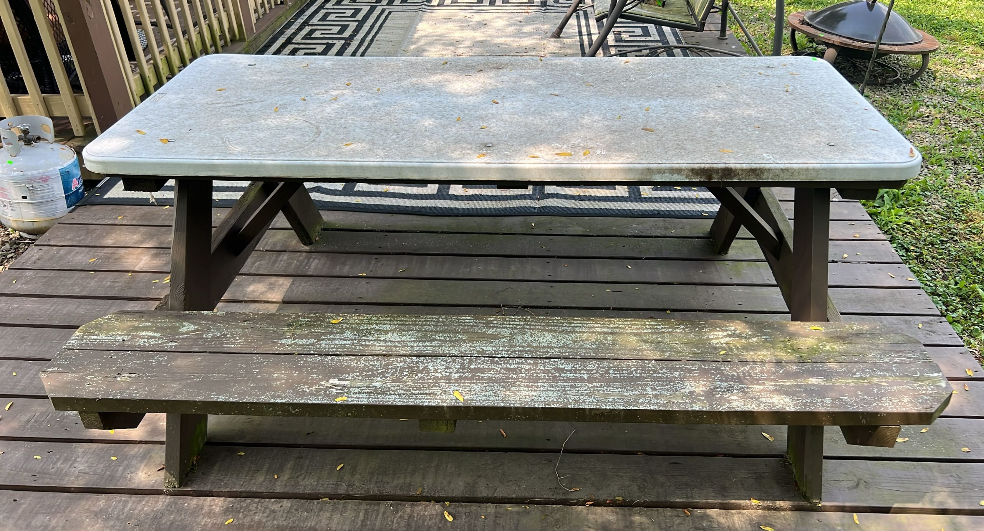 895 Wood Picnic table,needs repair ,with plastic top, 58.5”x78.5”x 29”