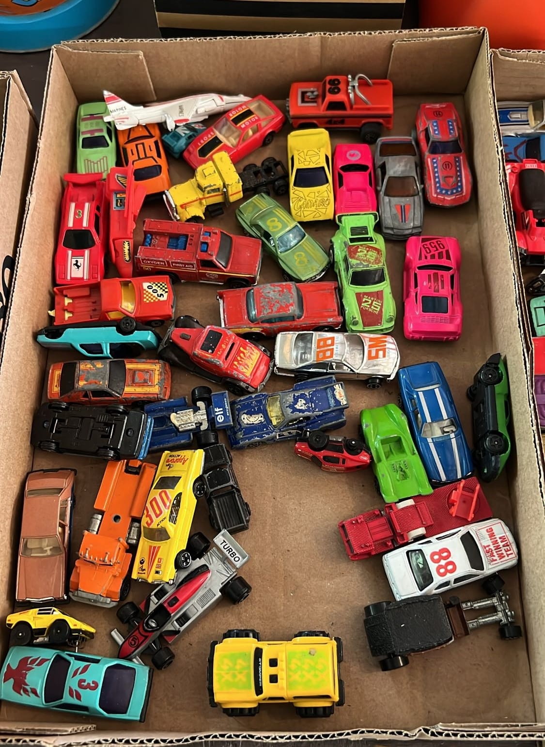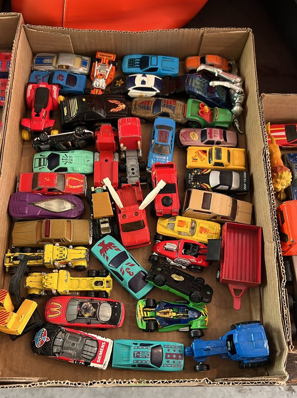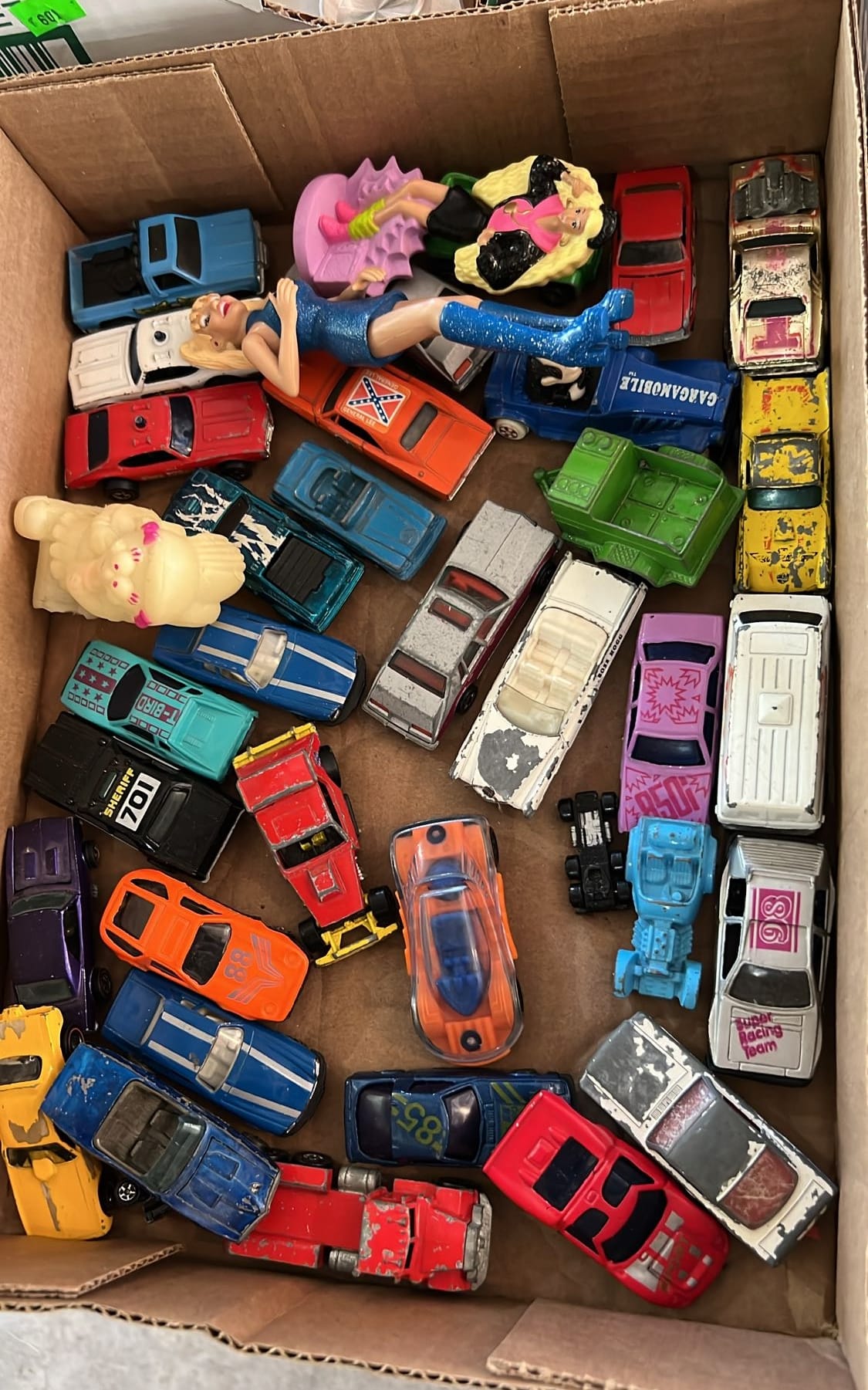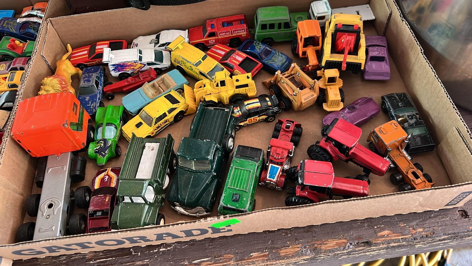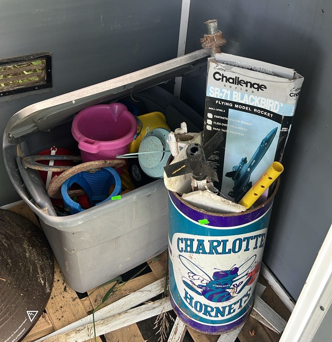 876 Toy assortment in tote with lid , Charlotte Hornets trash can ,19.5”and contents ,see pictures