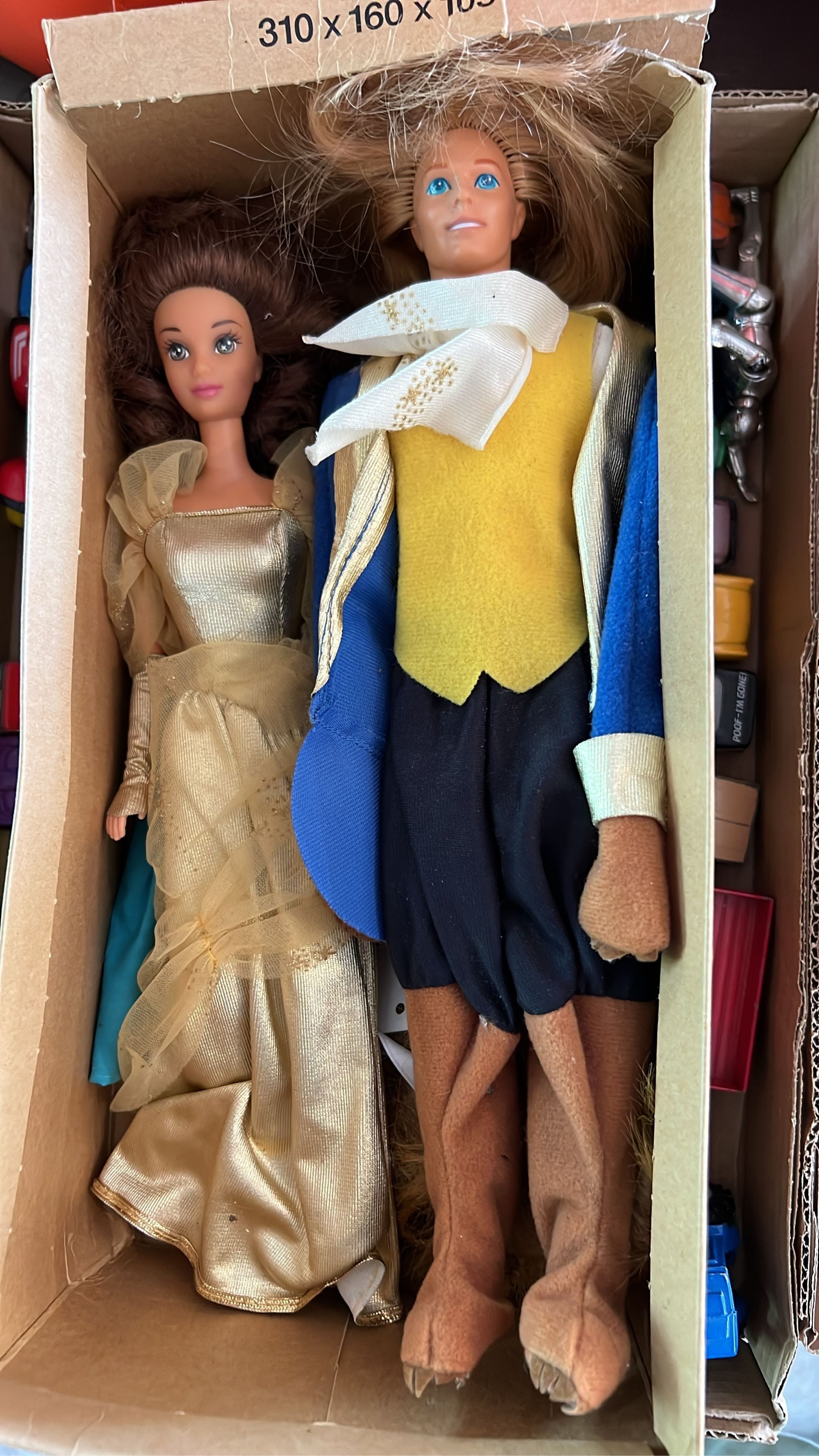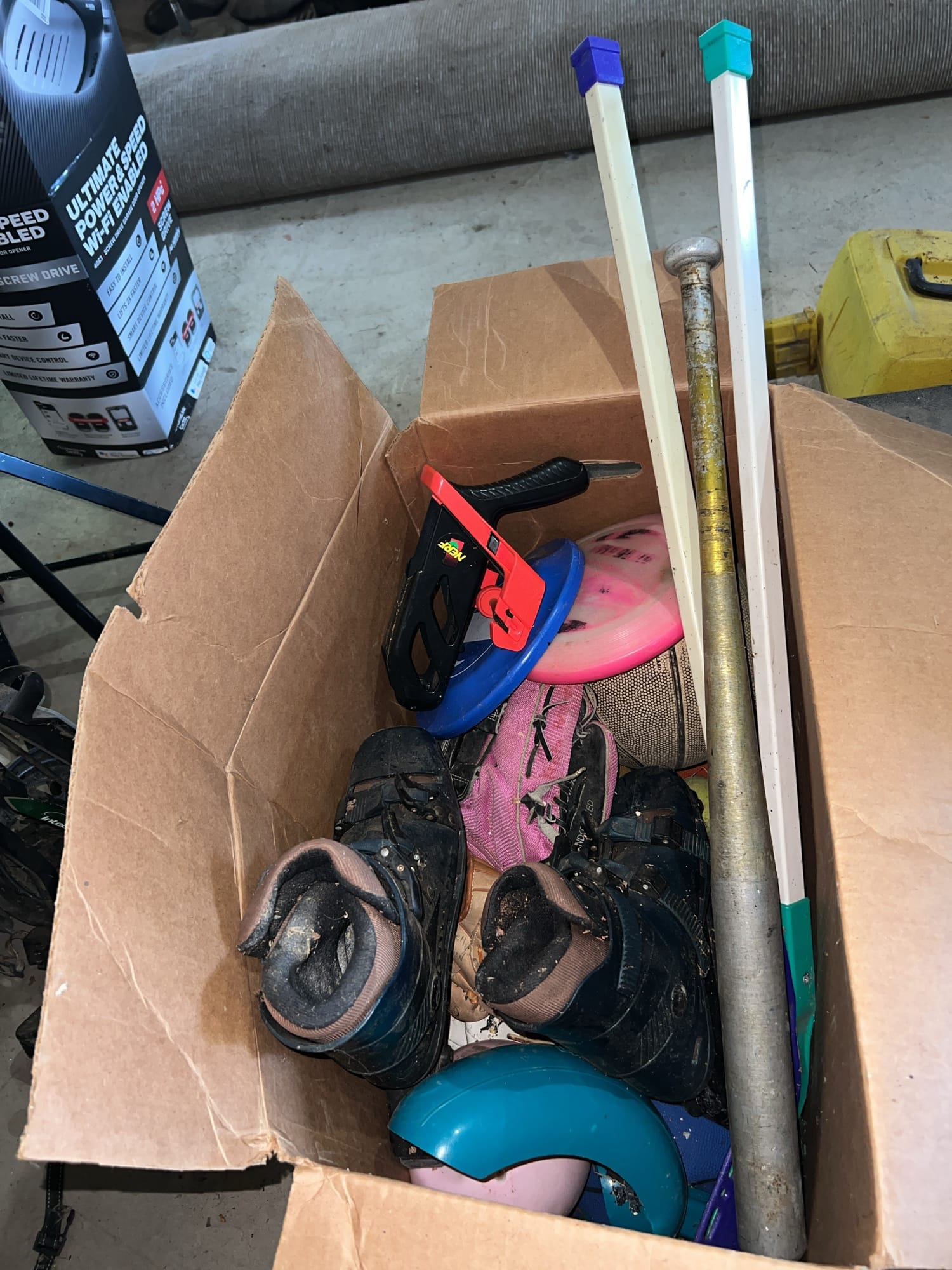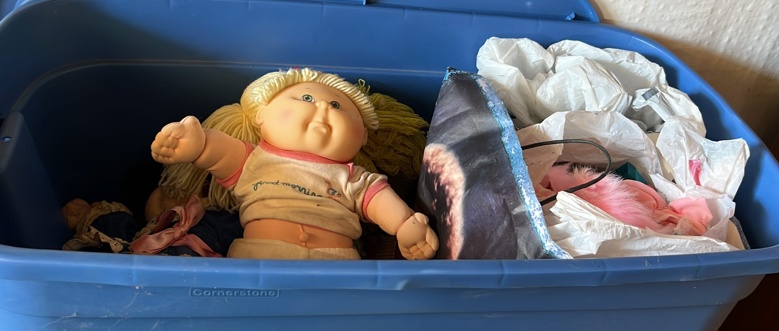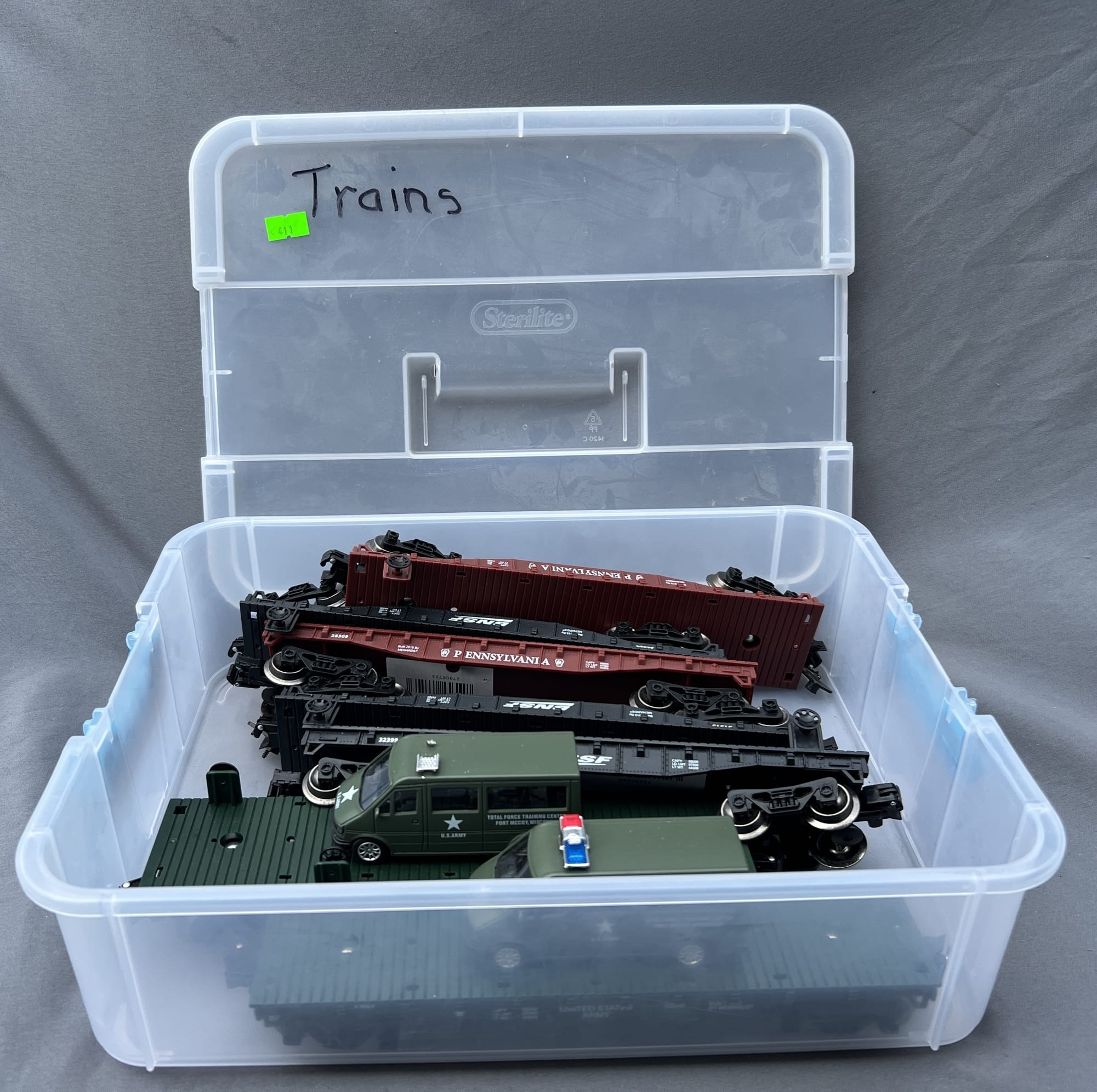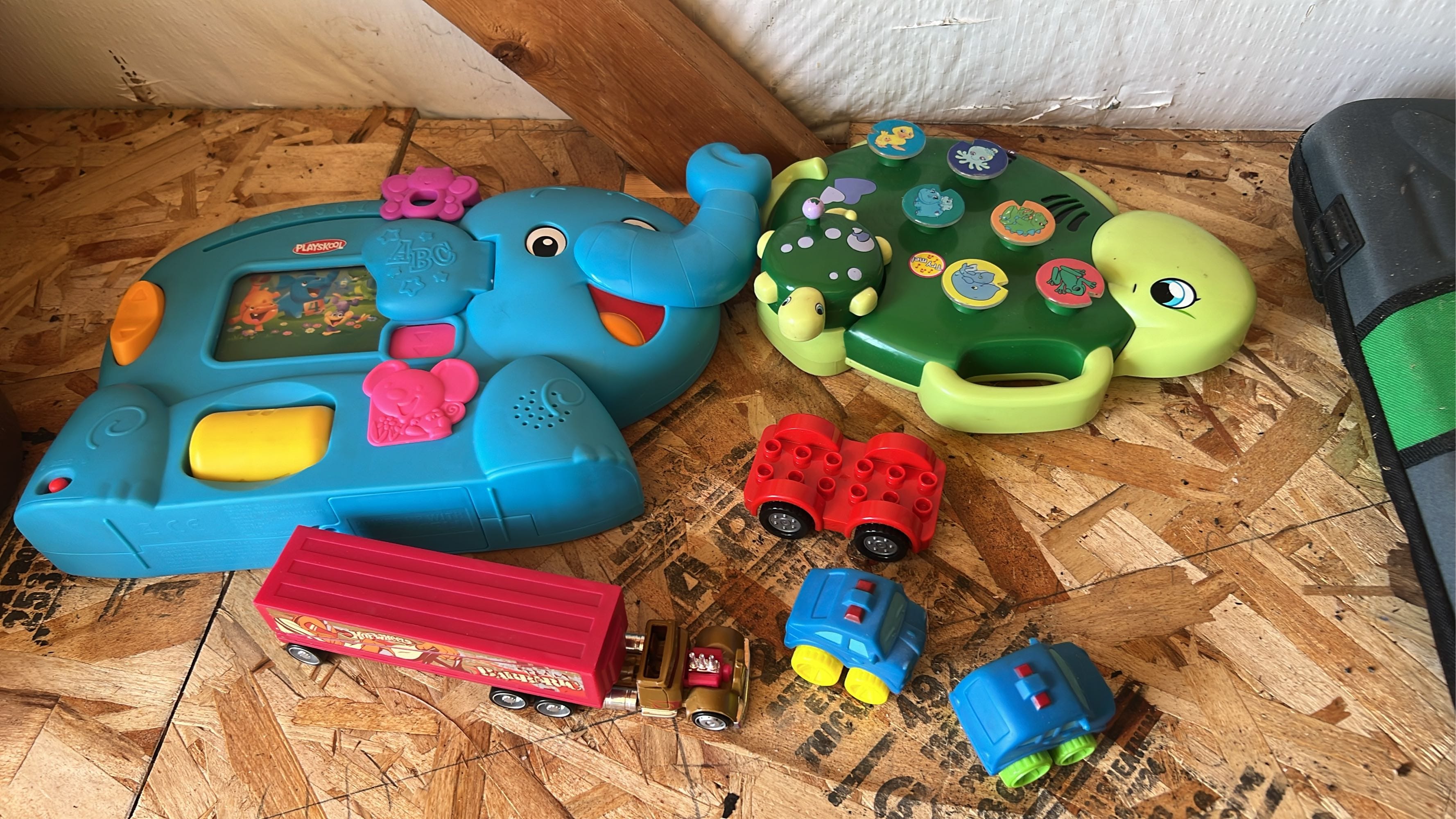876 Toy assortment in tote with lid , Charlotte Hornets trash can ,19.5”and contents ,see pictures