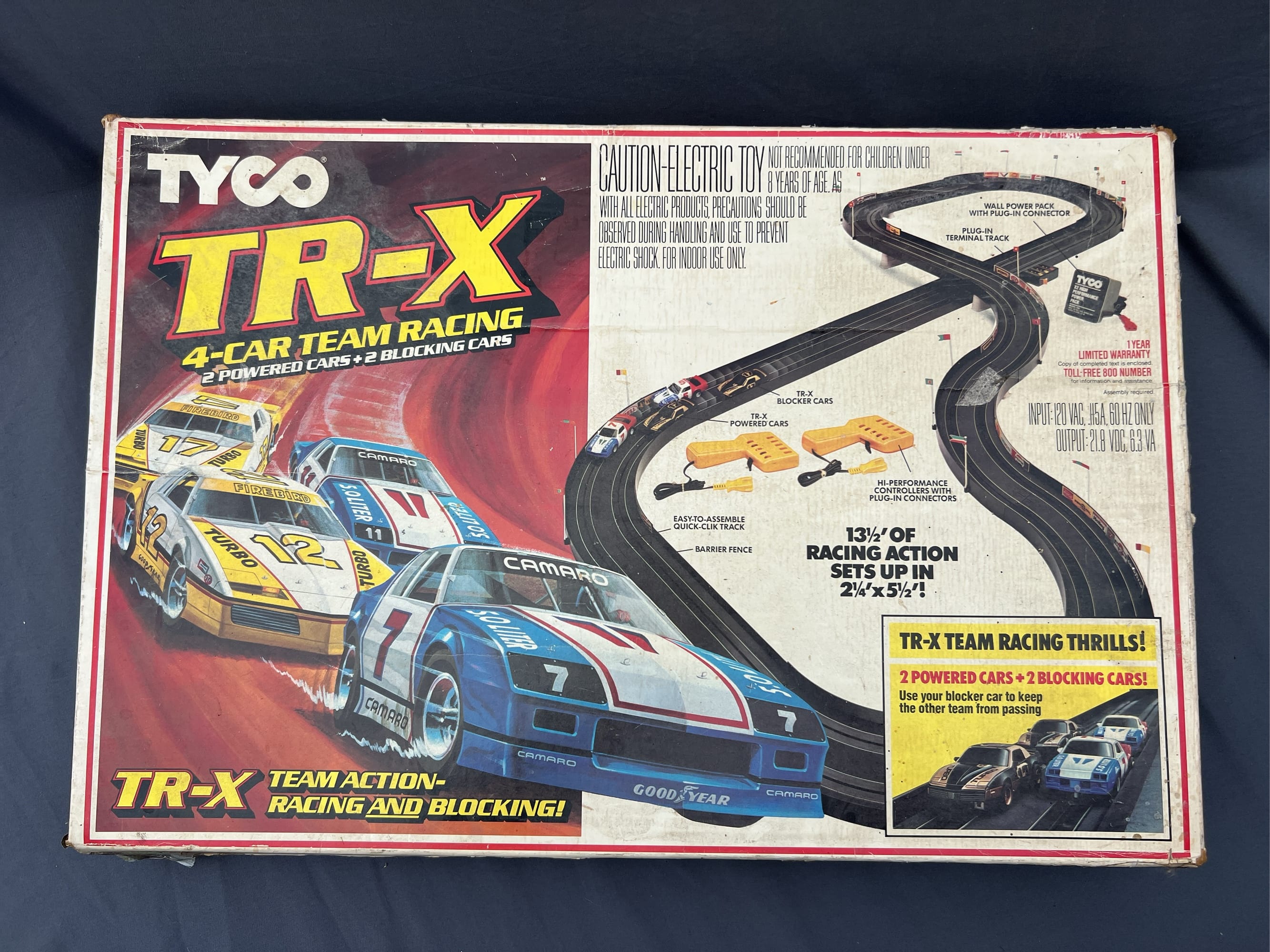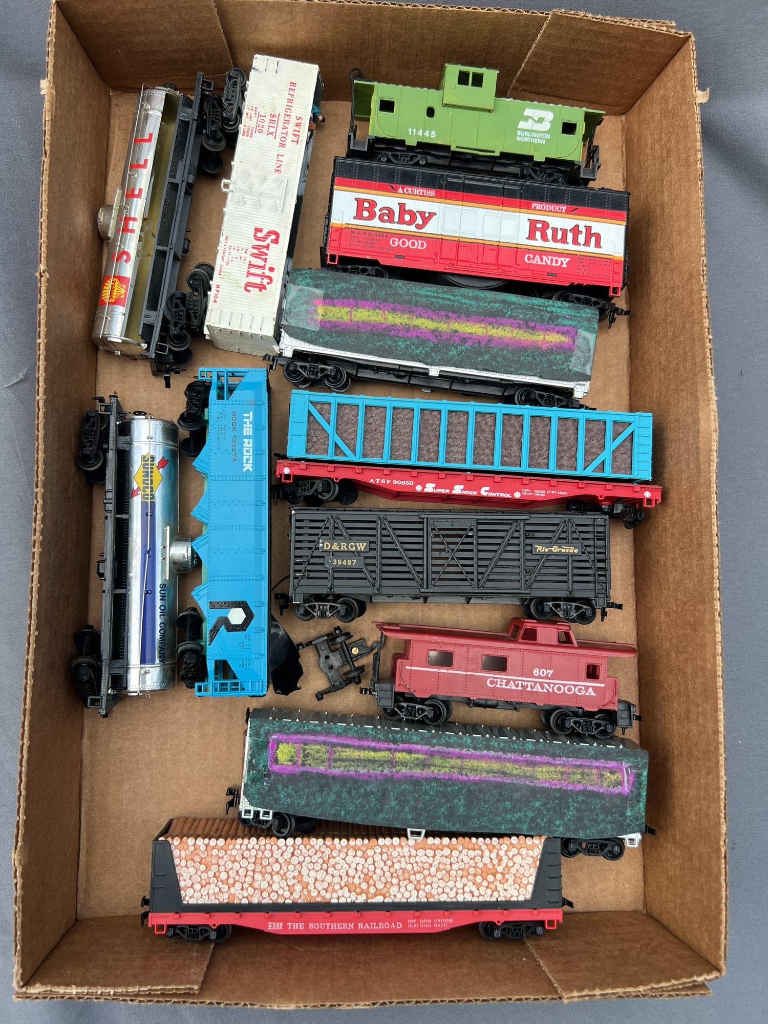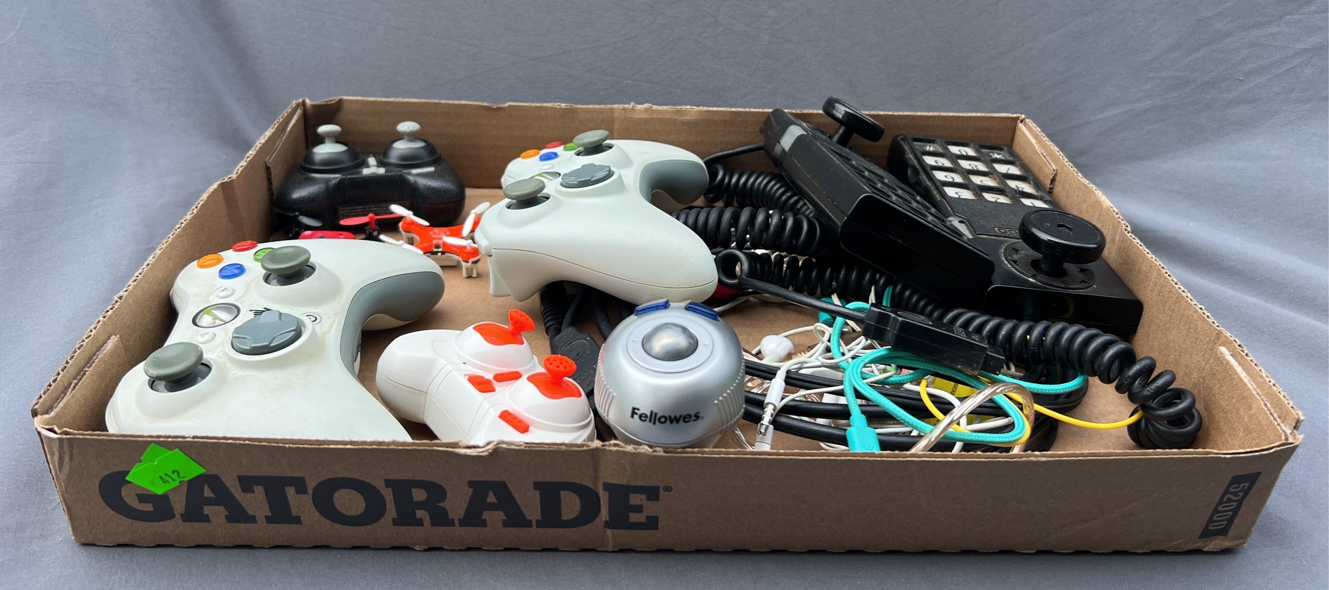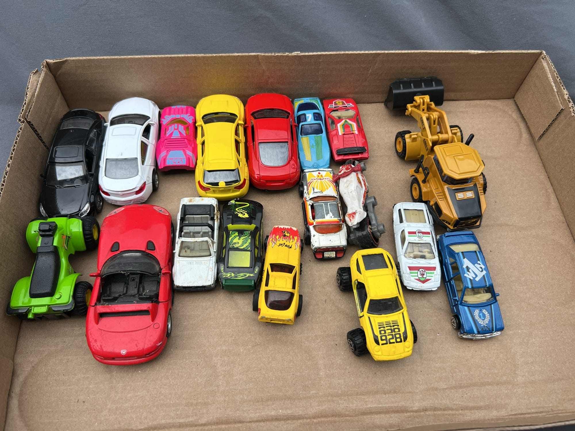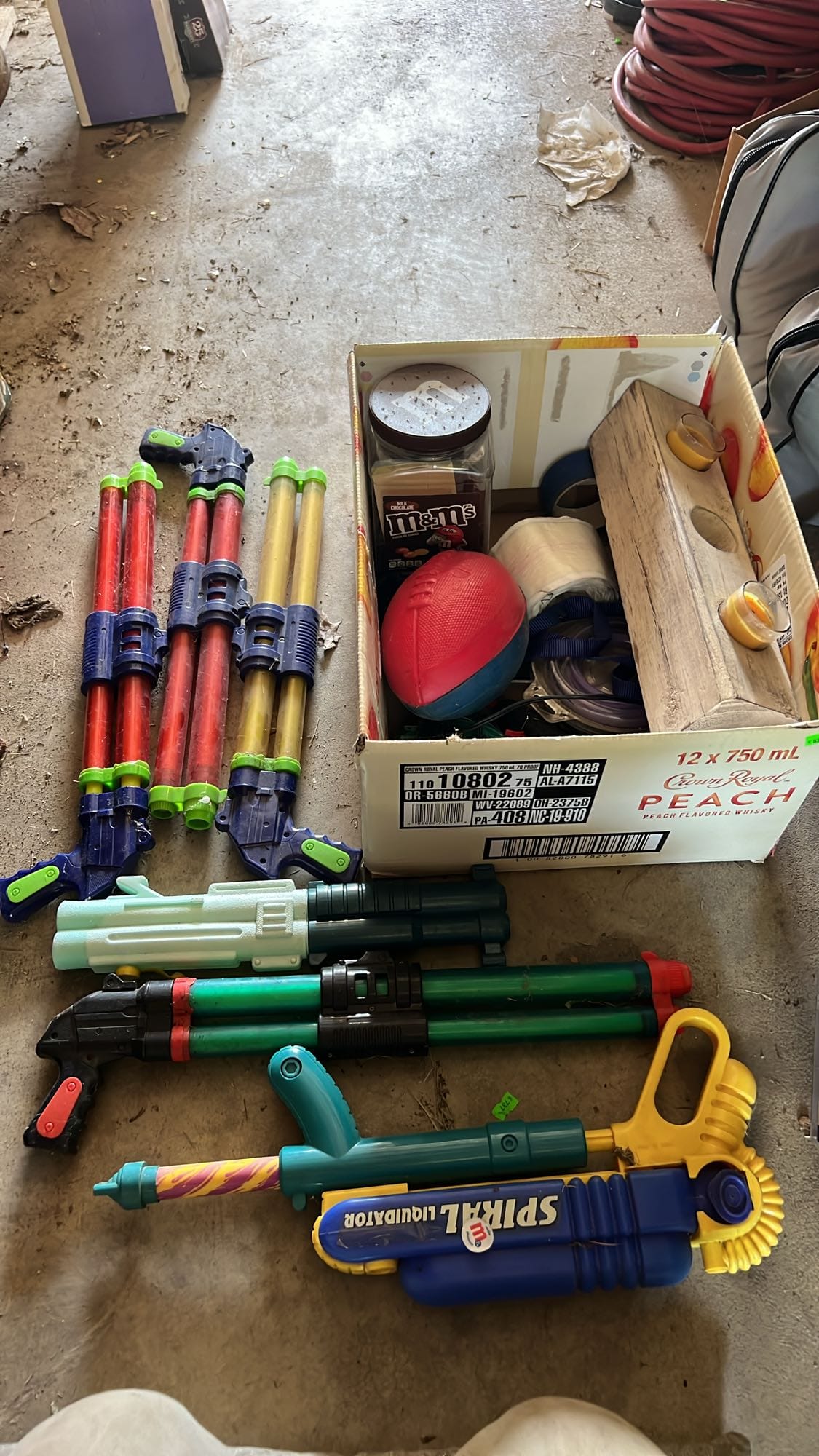 876 Toy assortment in tote with lid , Charlotte Hornets trash can ,19.5”and contents ,see pictures