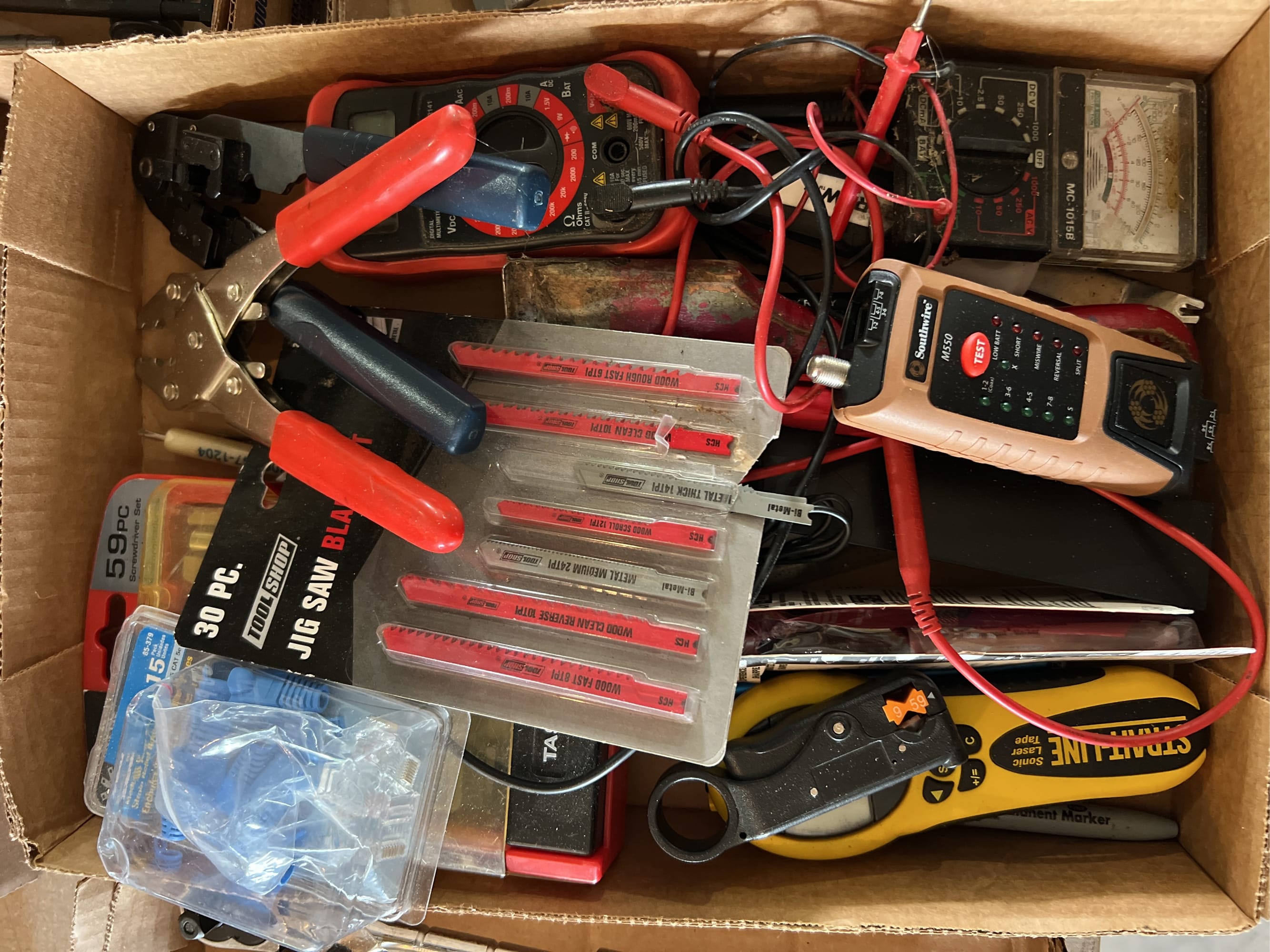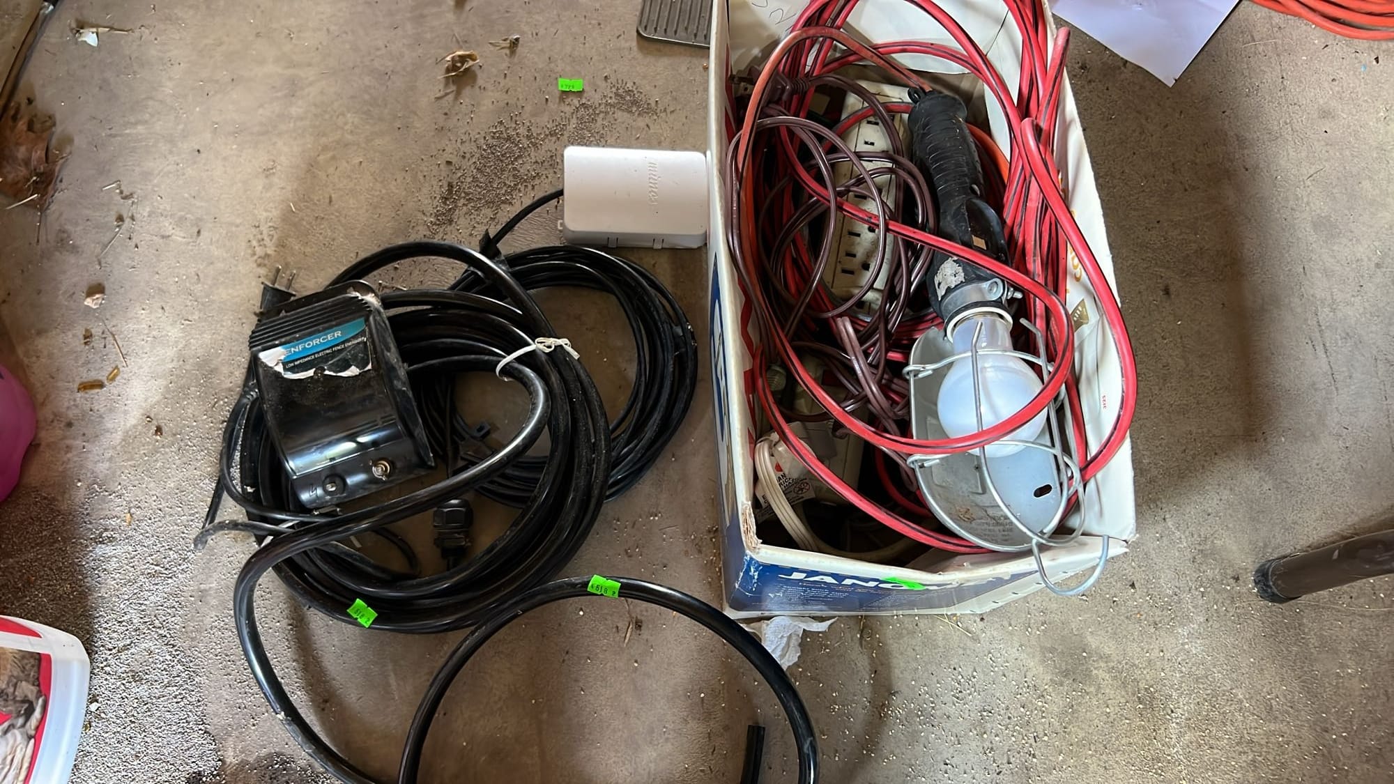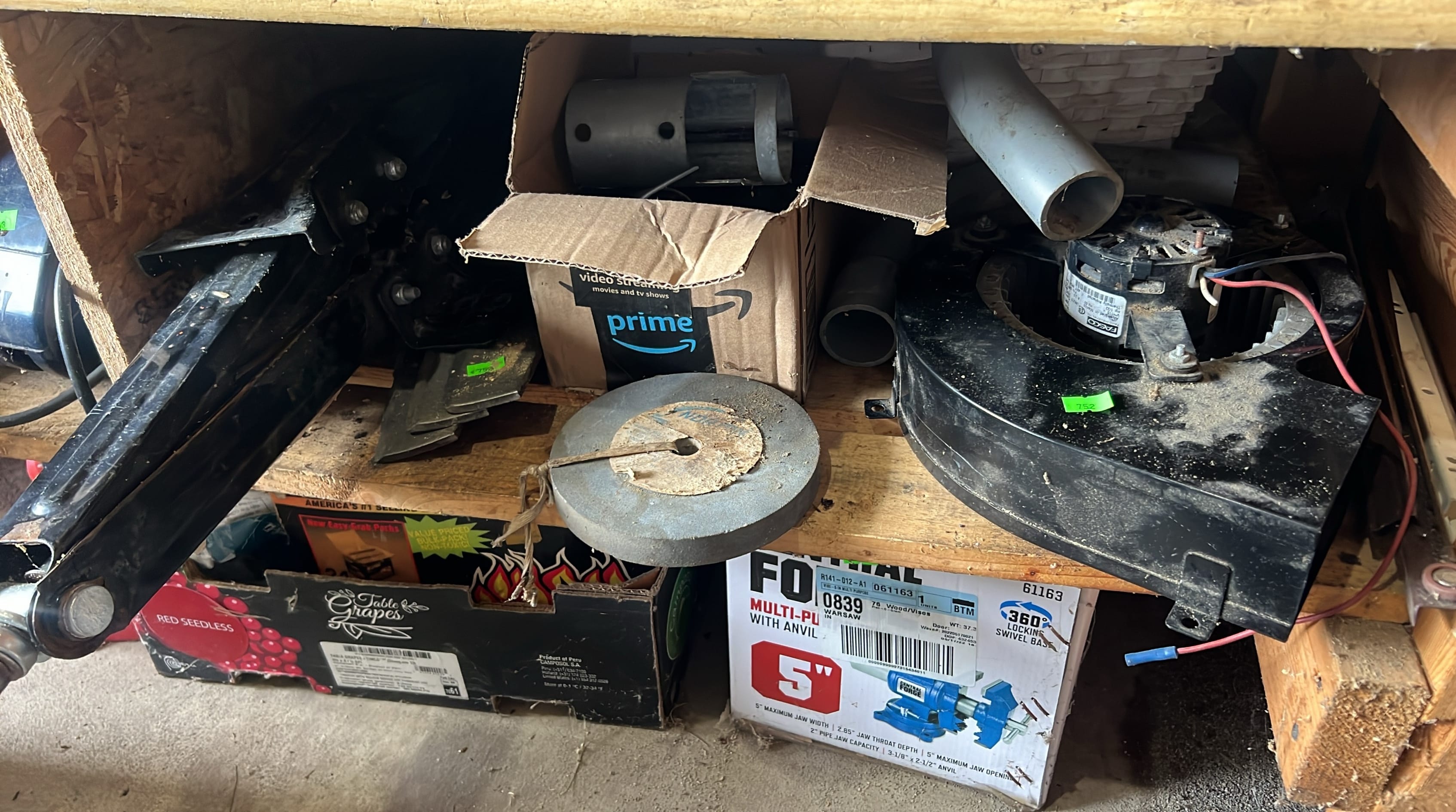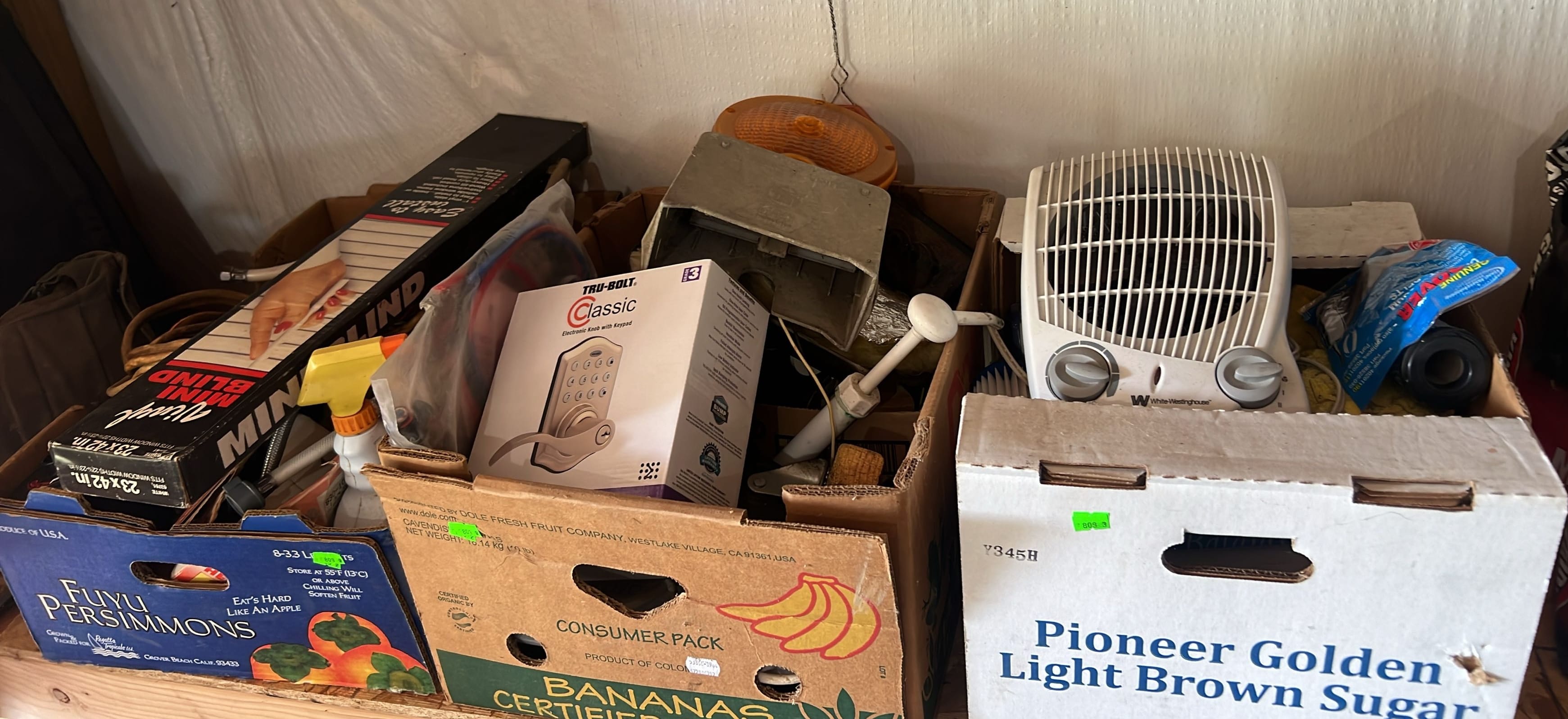 809 Jumper Cables ,1.5 ton Scissor Jack ,mini blind 23”x42”, tru-bolt Classic Electronic knob ,caution light , Westinghouse Air fan ,miscellaneous