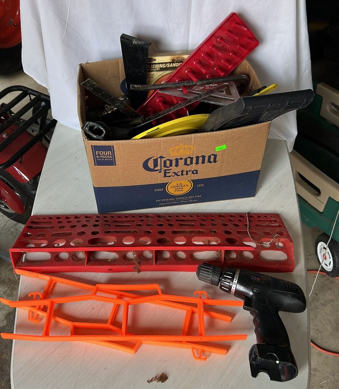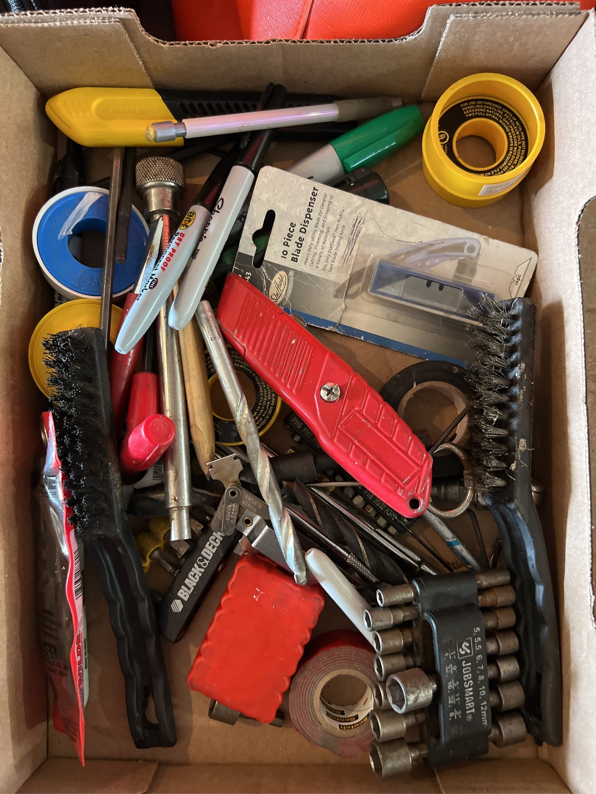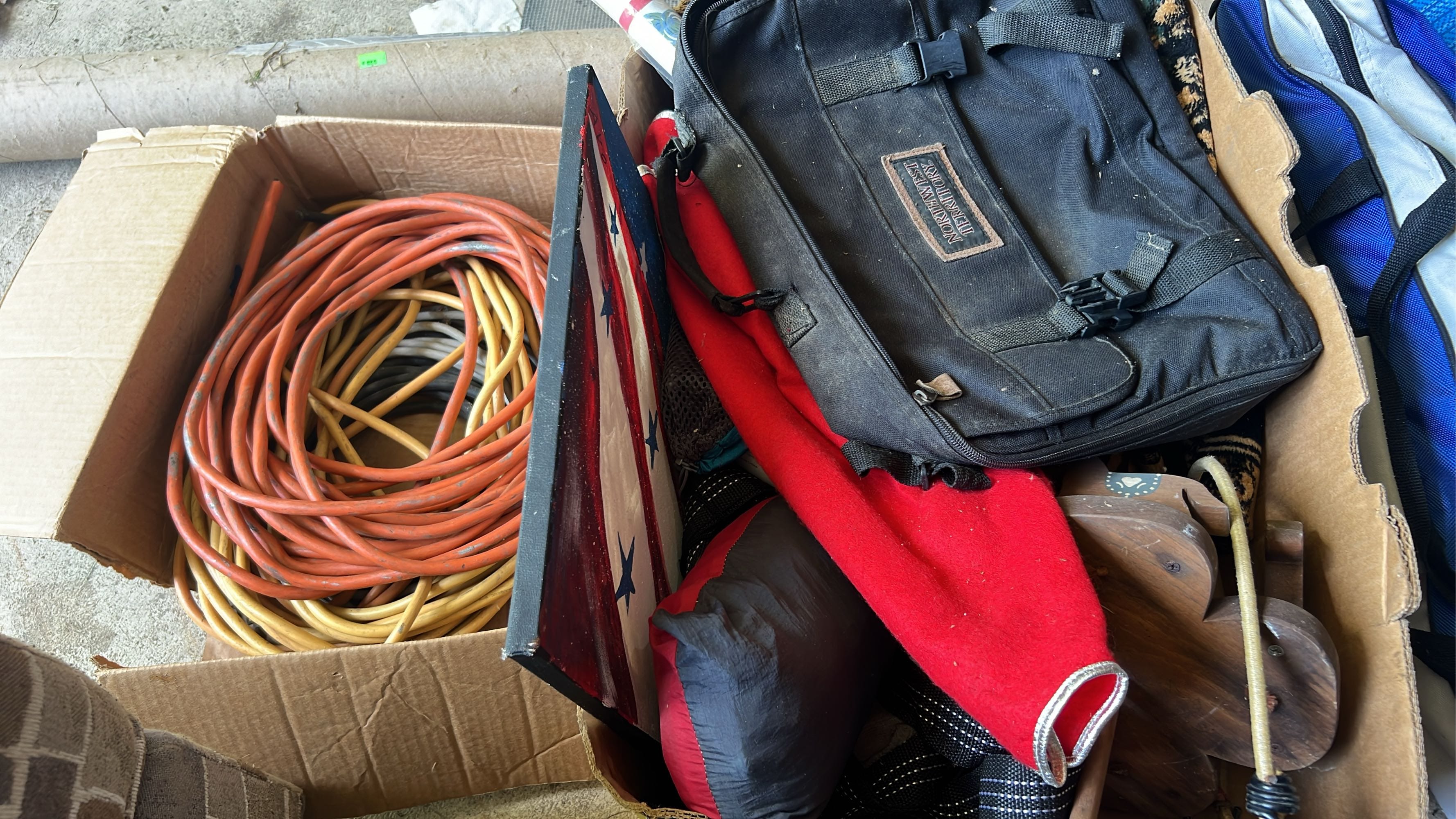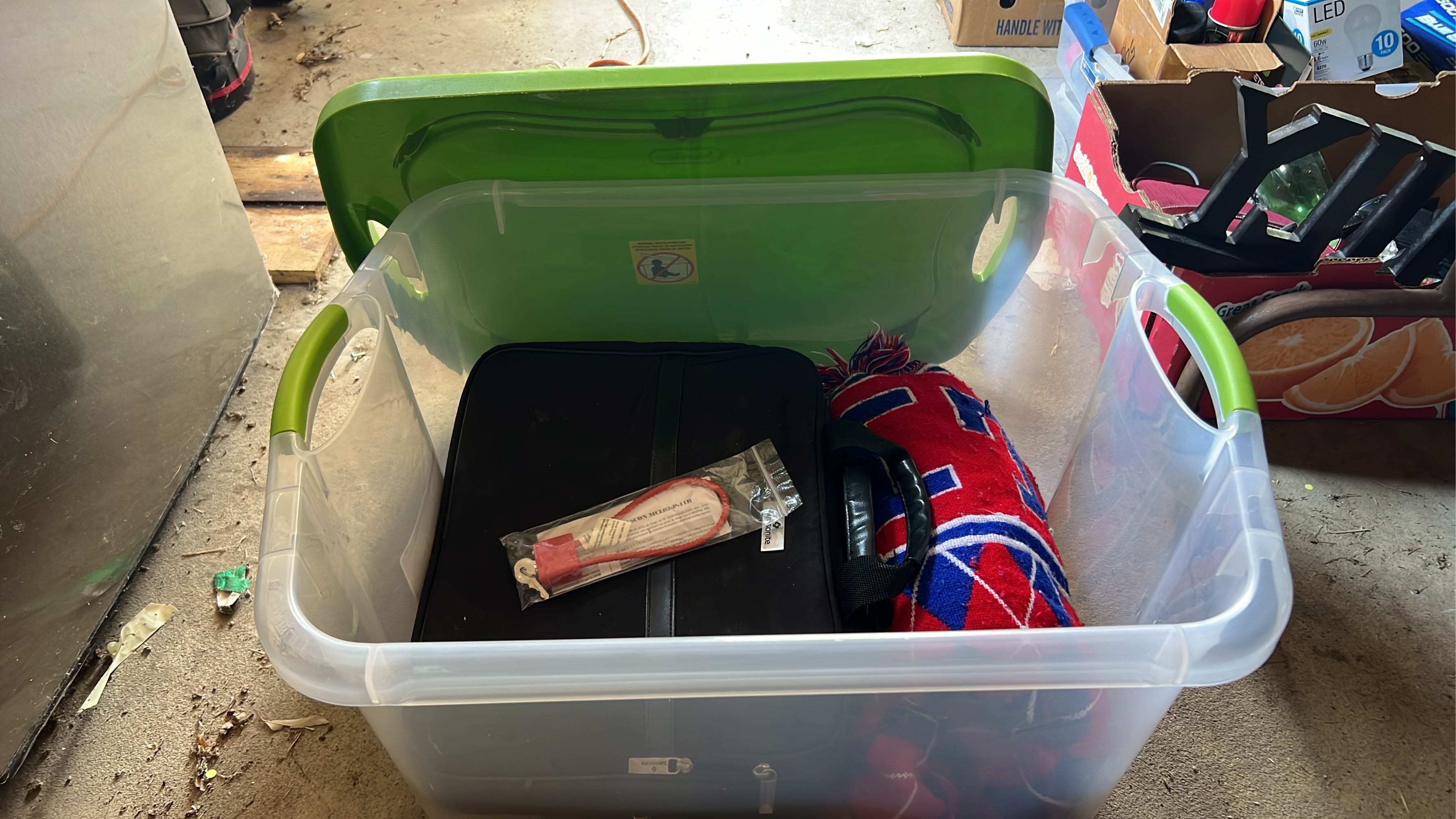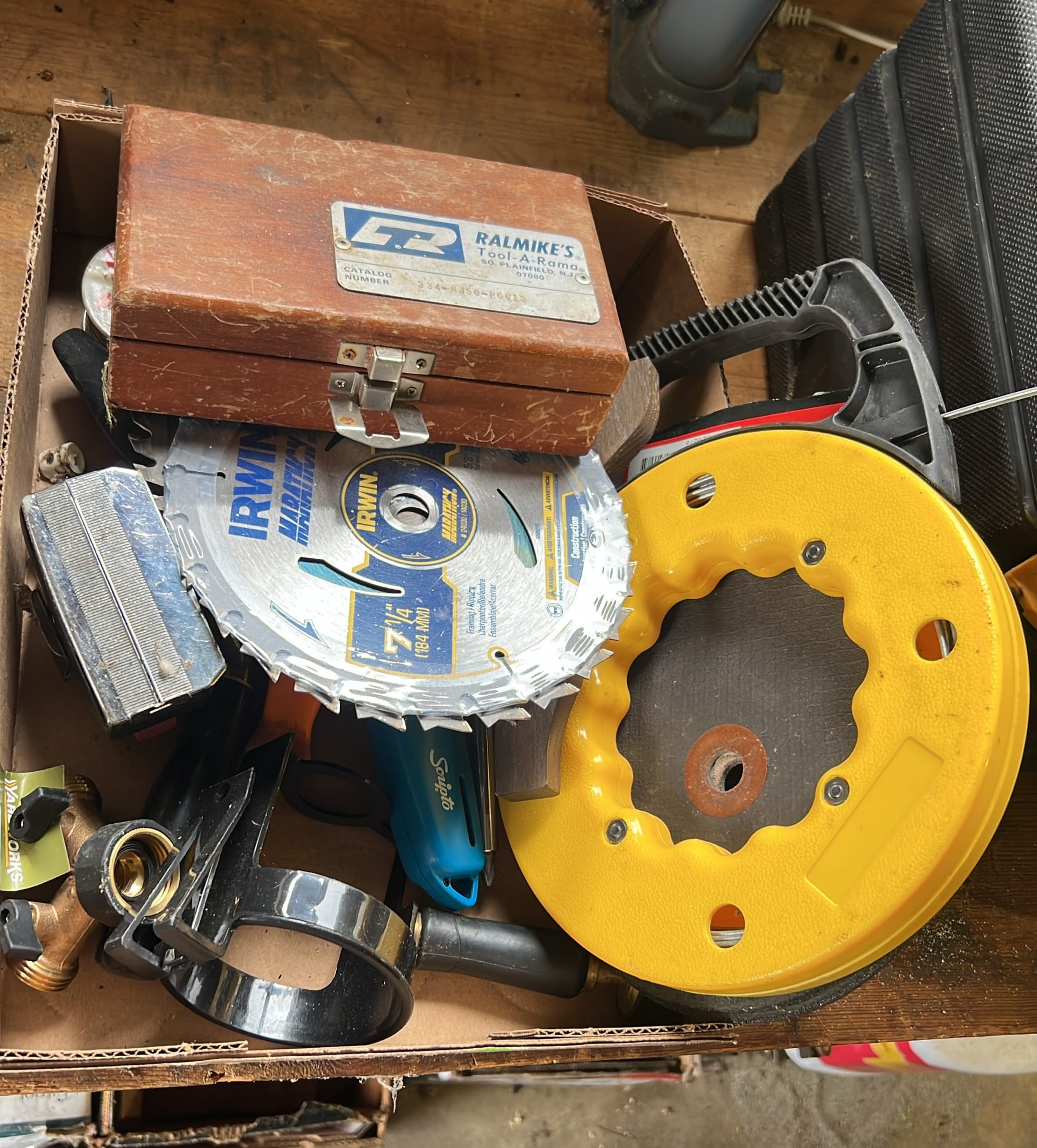 809 Jumper Cables ,1.5 ton Scissor Jack ,mini blind 23”x42”, tru-bolt Classic Electronic knob ,caution light , Westinghouse Air fan ,miscellaneous