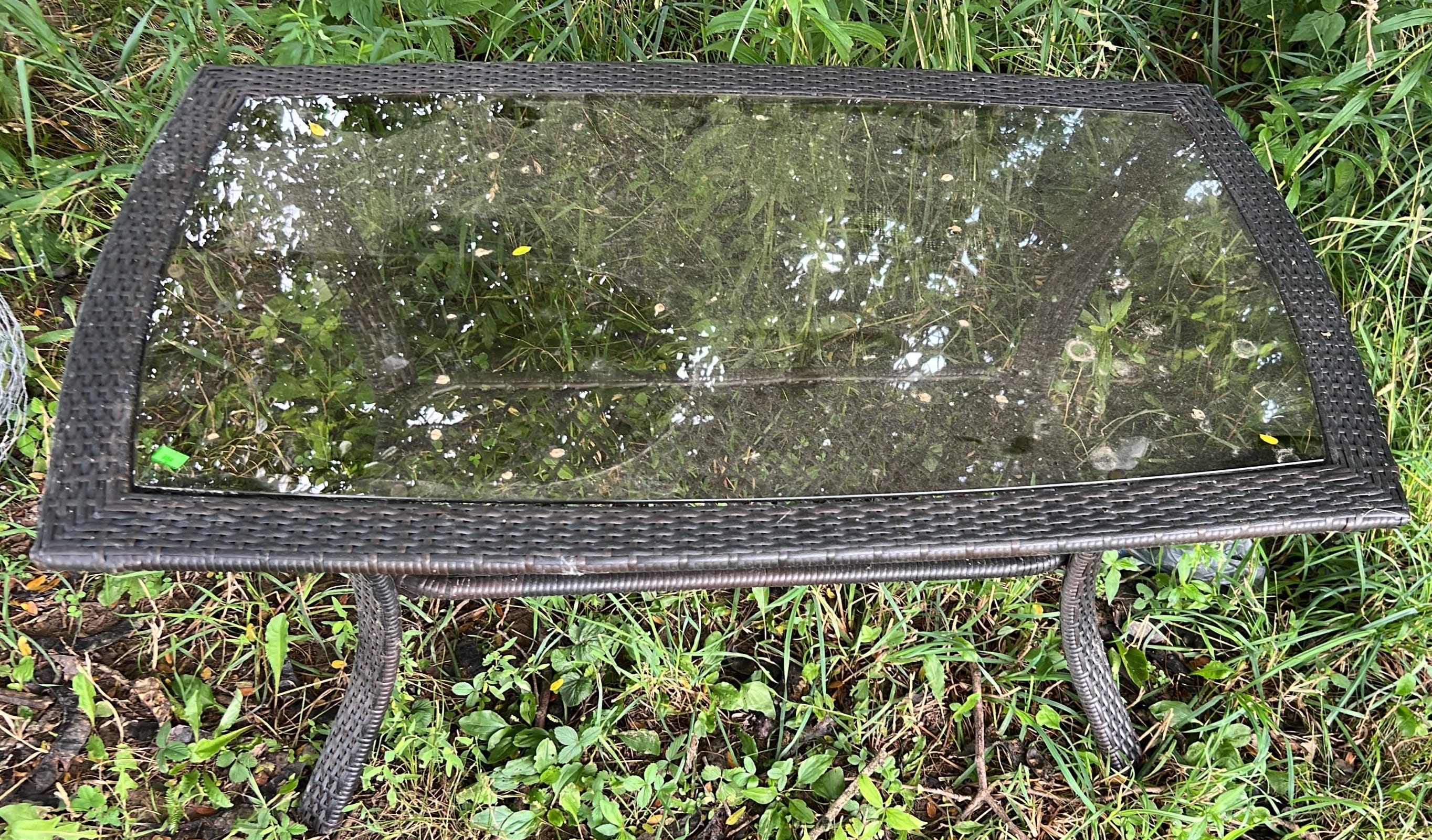 884 Plastic Wicker Patio Table with glass top ,25”x42.5”x 22”