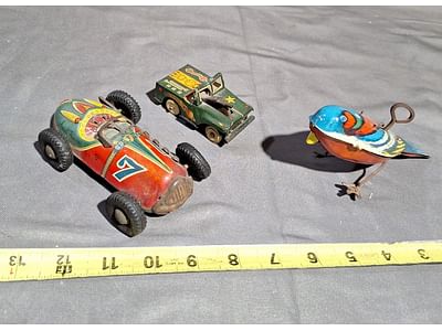 10006 3- Tin toys inc. Wind-up bird, friction racer and jeep toy