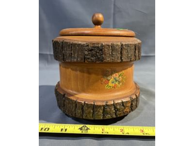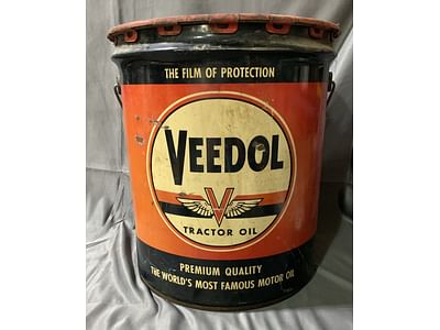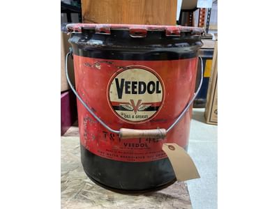 10023 Veedol 5 Gallon Oils & Greases Metal Can with Wood Handle (dents on bottom) 13 1/2”T