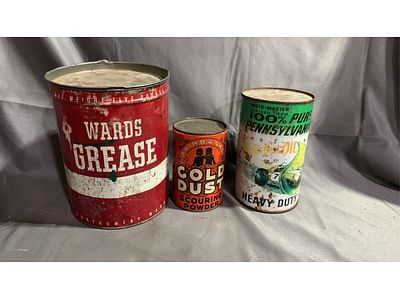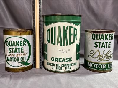10026 3 - Empty Oil and Grease Tins: Quaker State Super Blend Motor Oil, Quaker Grease, Quaker State DeLuxe Motor Oil