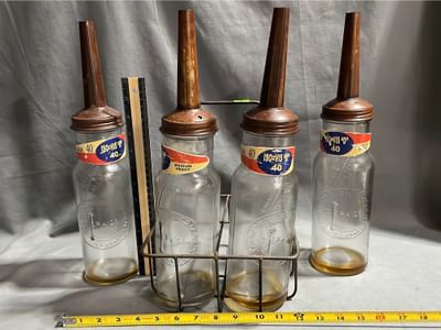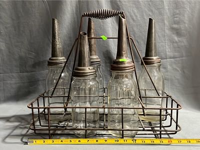 10076 4 - Clear Glass Standard Oil Containers with Metal Spouts in Wire Carrying Rack