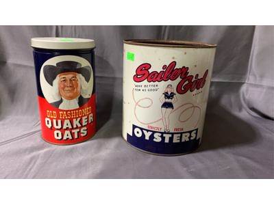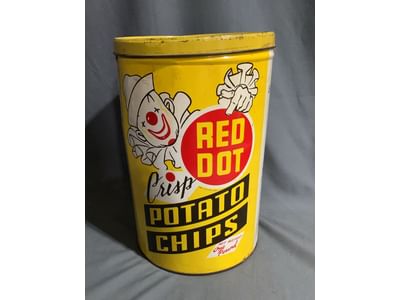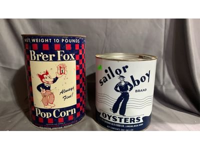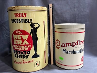 10067 2 - Metal Cans with Lids: “Campfire Marshmallows” and “Truly Digestible, The New Era Scientifically Processed Potato Chips” by Frito-Lay