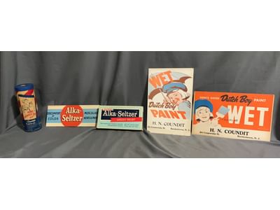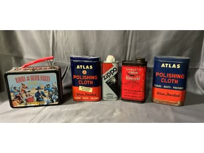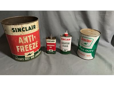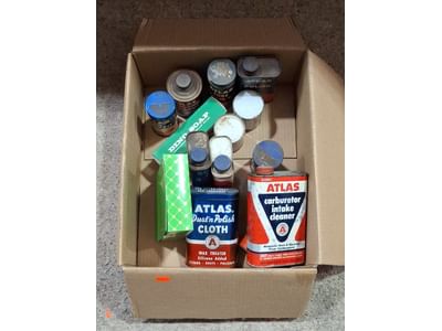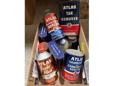10216 Atlas Dust'n Polish Cloth Tin, Sinclair Dino Ornament, Dino Soap, Atlas Carburetor Intake Cleaner Tin, Atlas Tube Repair Kit Tin