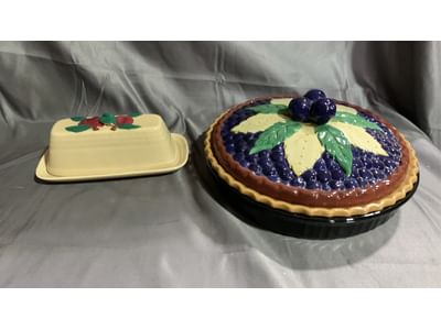 10204 Butter dish, 2 - pie dishes one had blueberry lid 10.5”, 8”