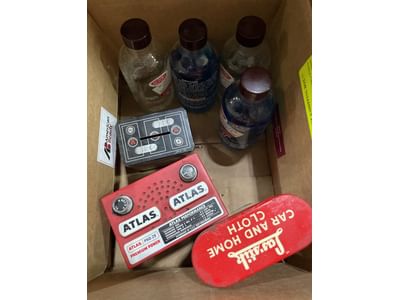 10221 Atlas premium power extra heavy duty battery, Lasstik car & home cloth tin, Atlas tin coin bank, DuPont glass bottles