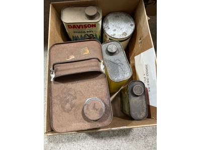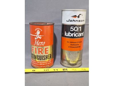 10237 Johnson outboard pint oil can full and Hero fire extinguisher tin full