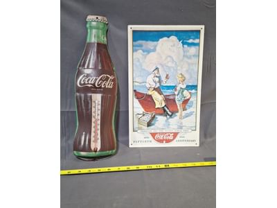 10242 Coca-Cola thermometer 16" and tin anniversary sign 15x9"