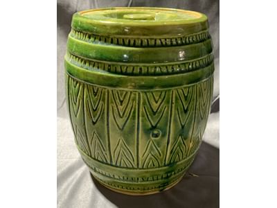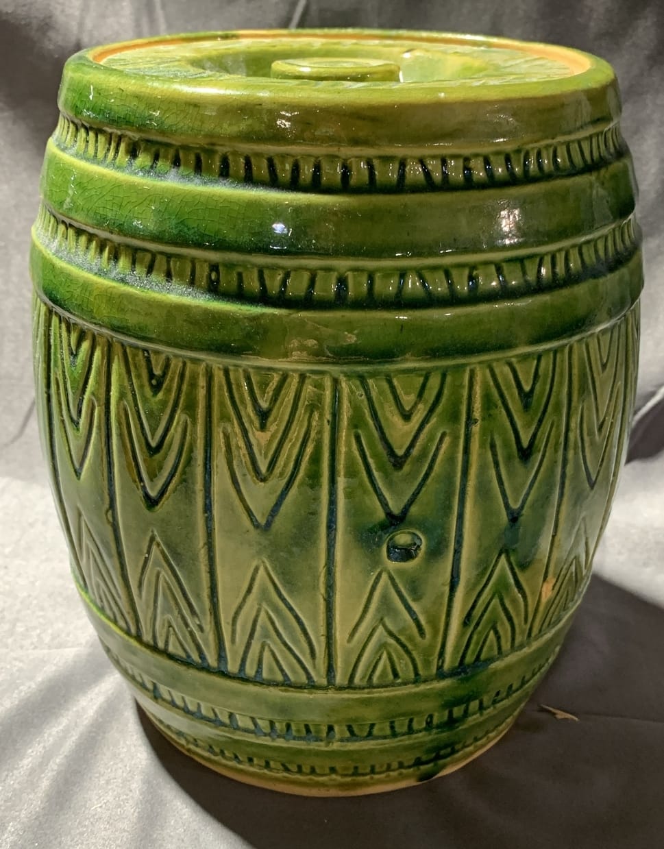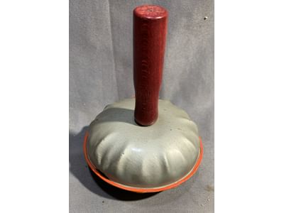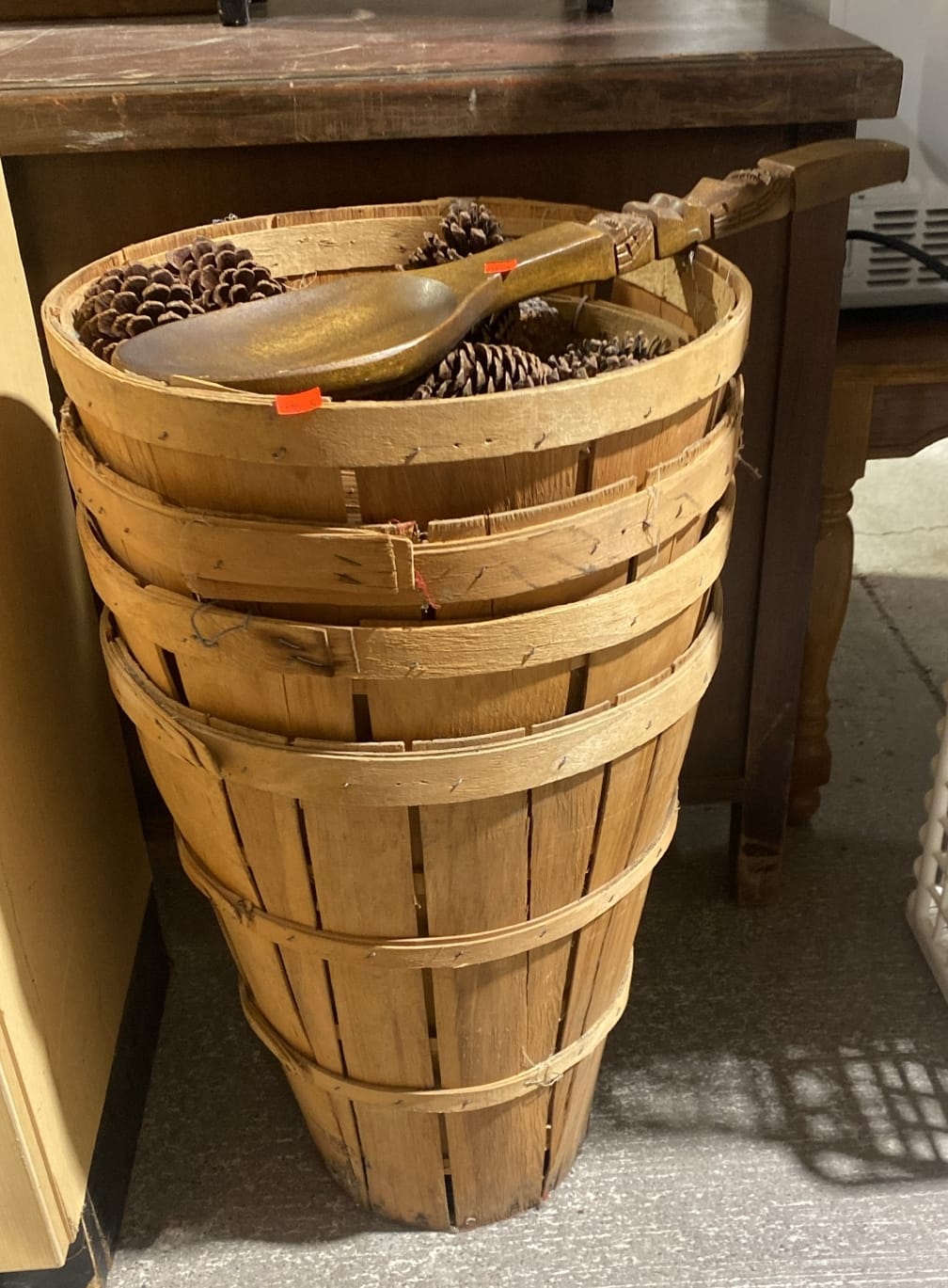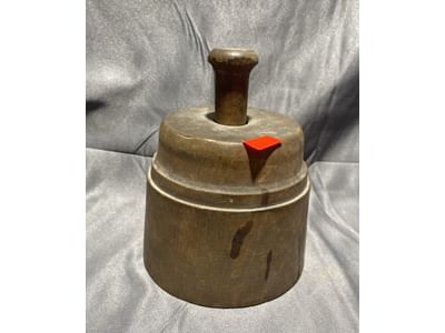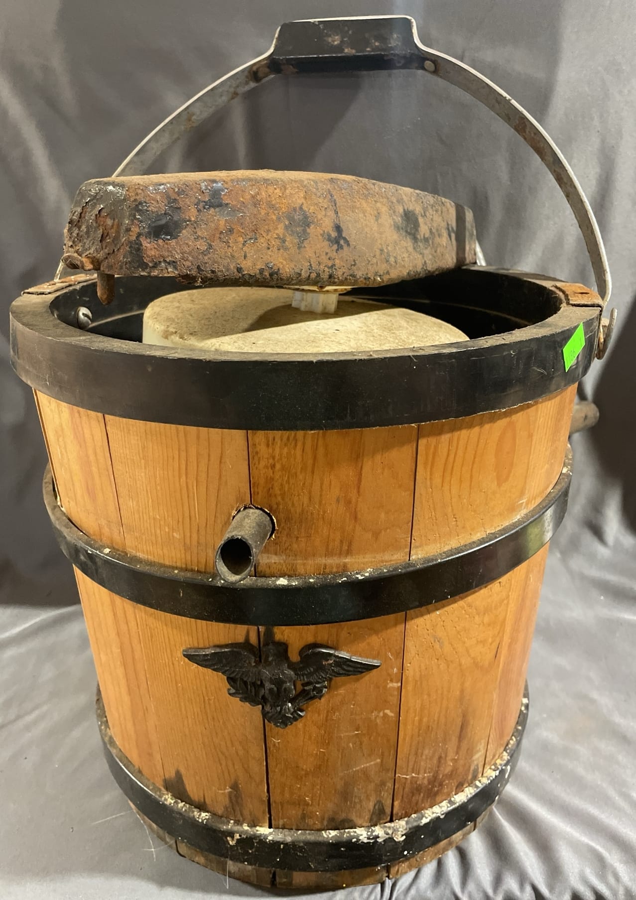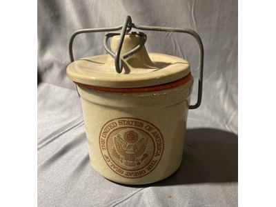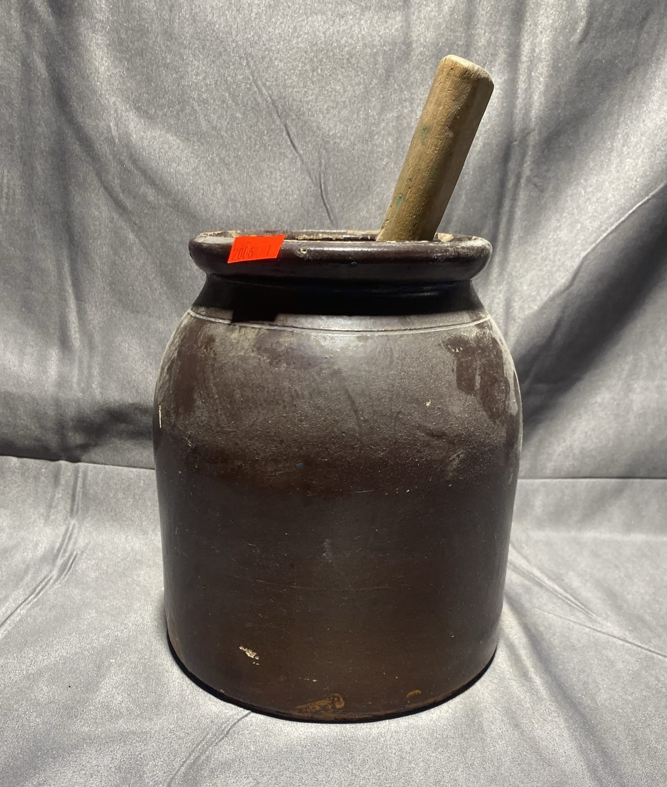 2006 Stoneware Crock W/ Wood Utensil damaged rim 8”