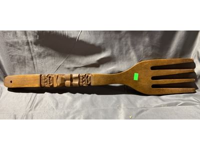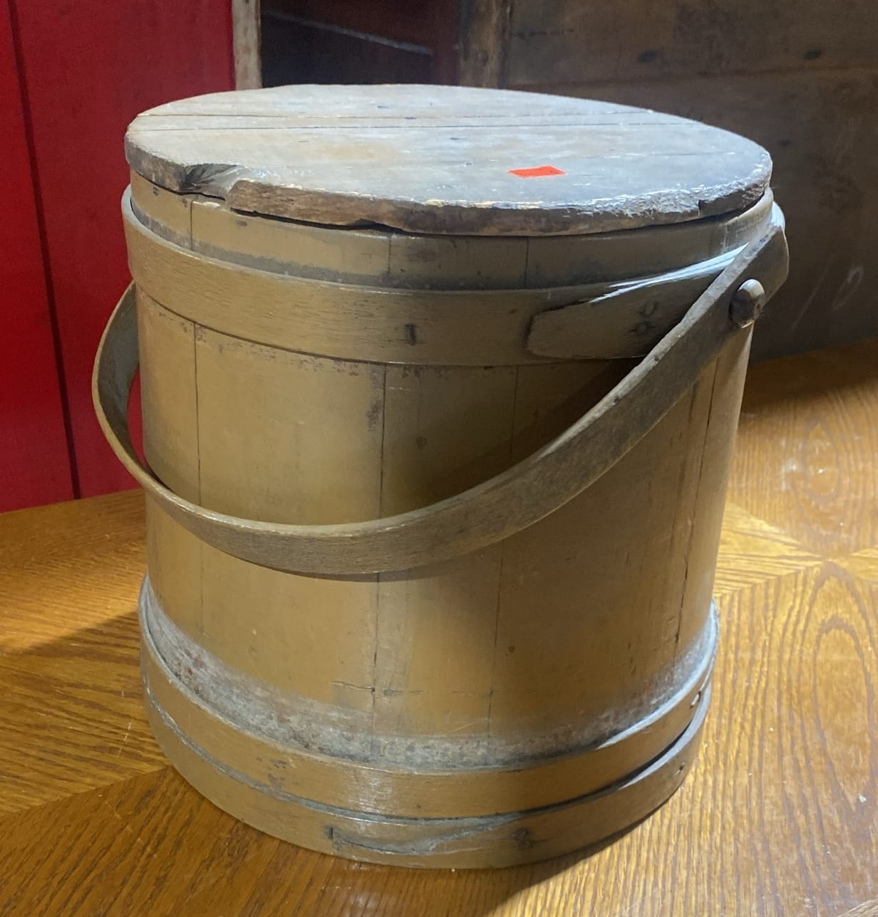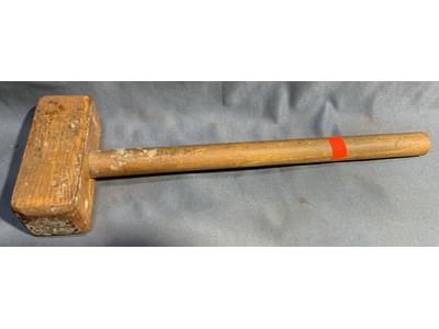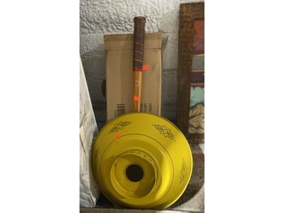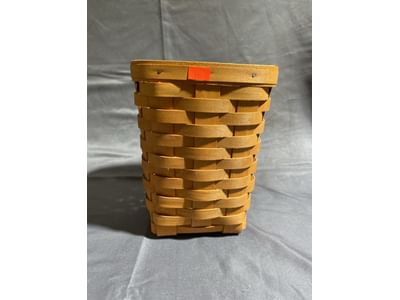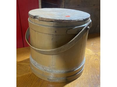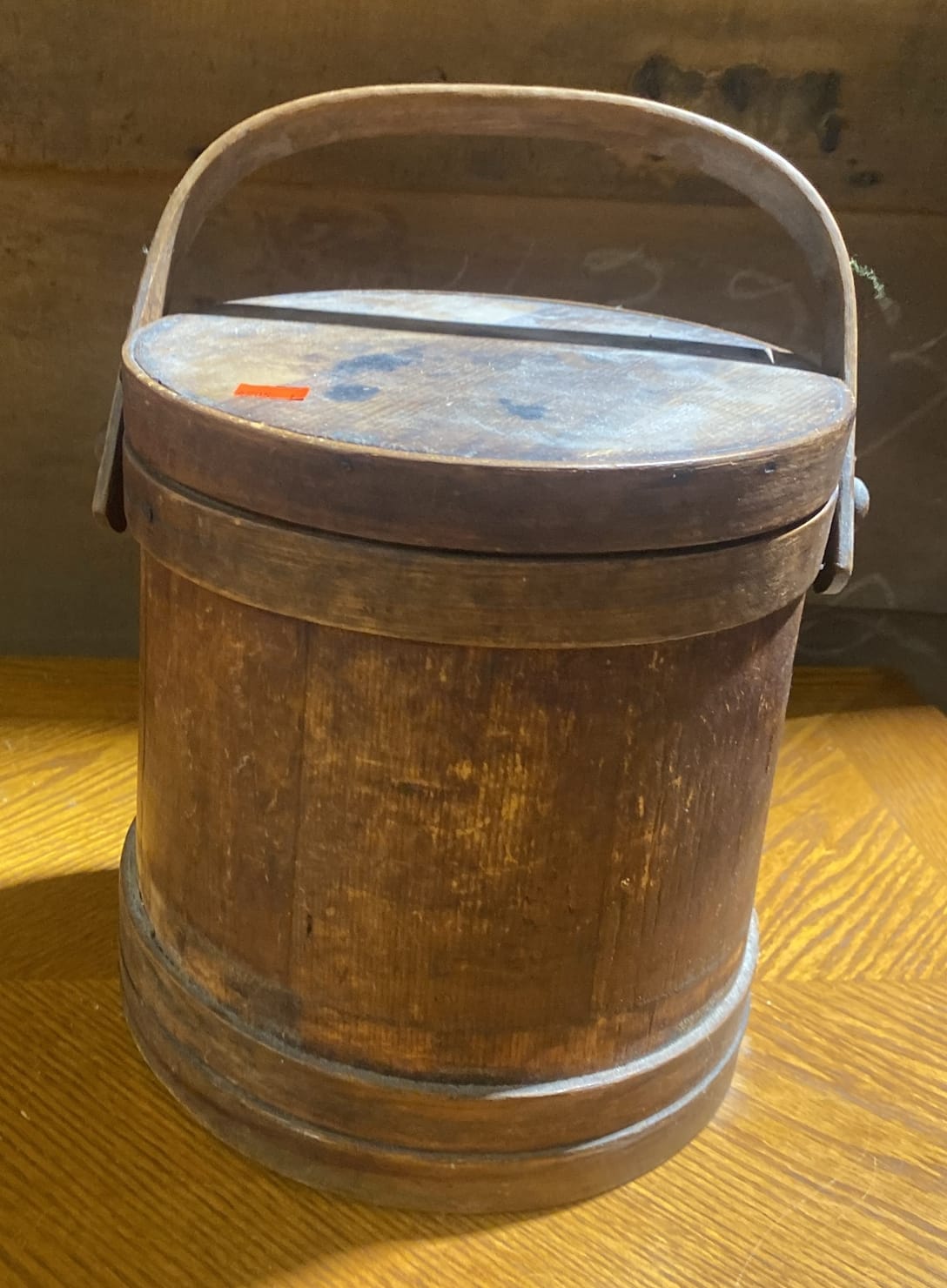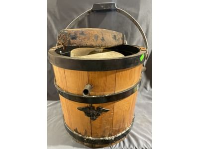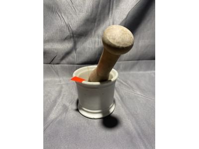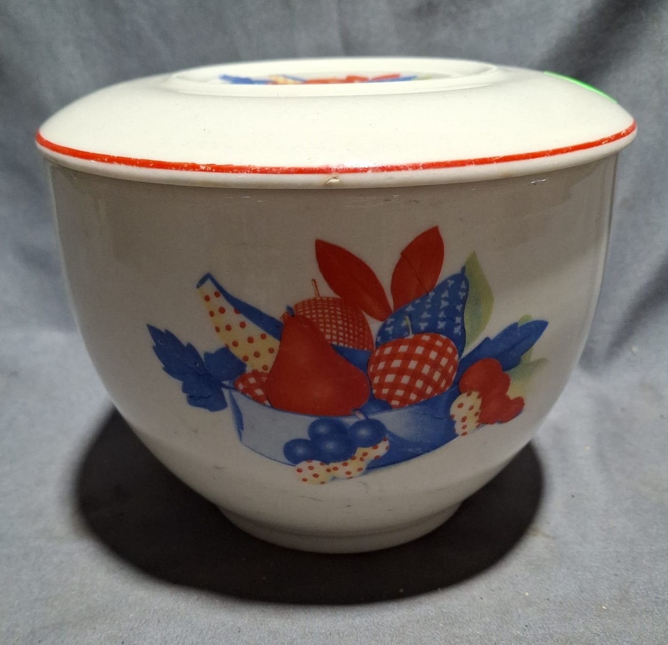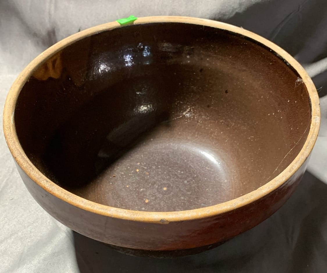 2006 Stoneware Crock W/ Wood Utensil damaged rim 8”