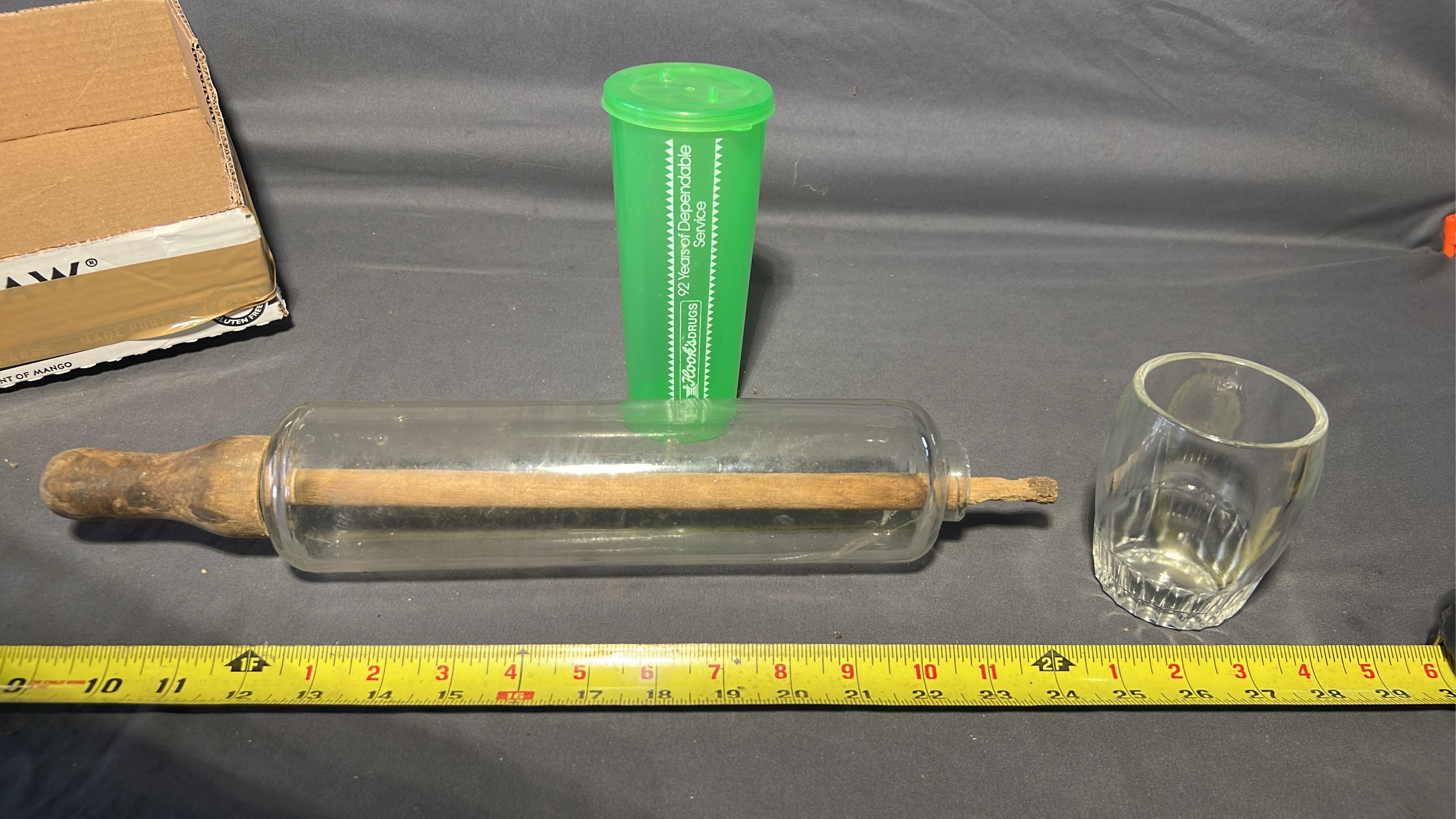 33 Glass Roller with wood handle ,handle needs repair , Hooks Drugs Advertising Cup , glass cup