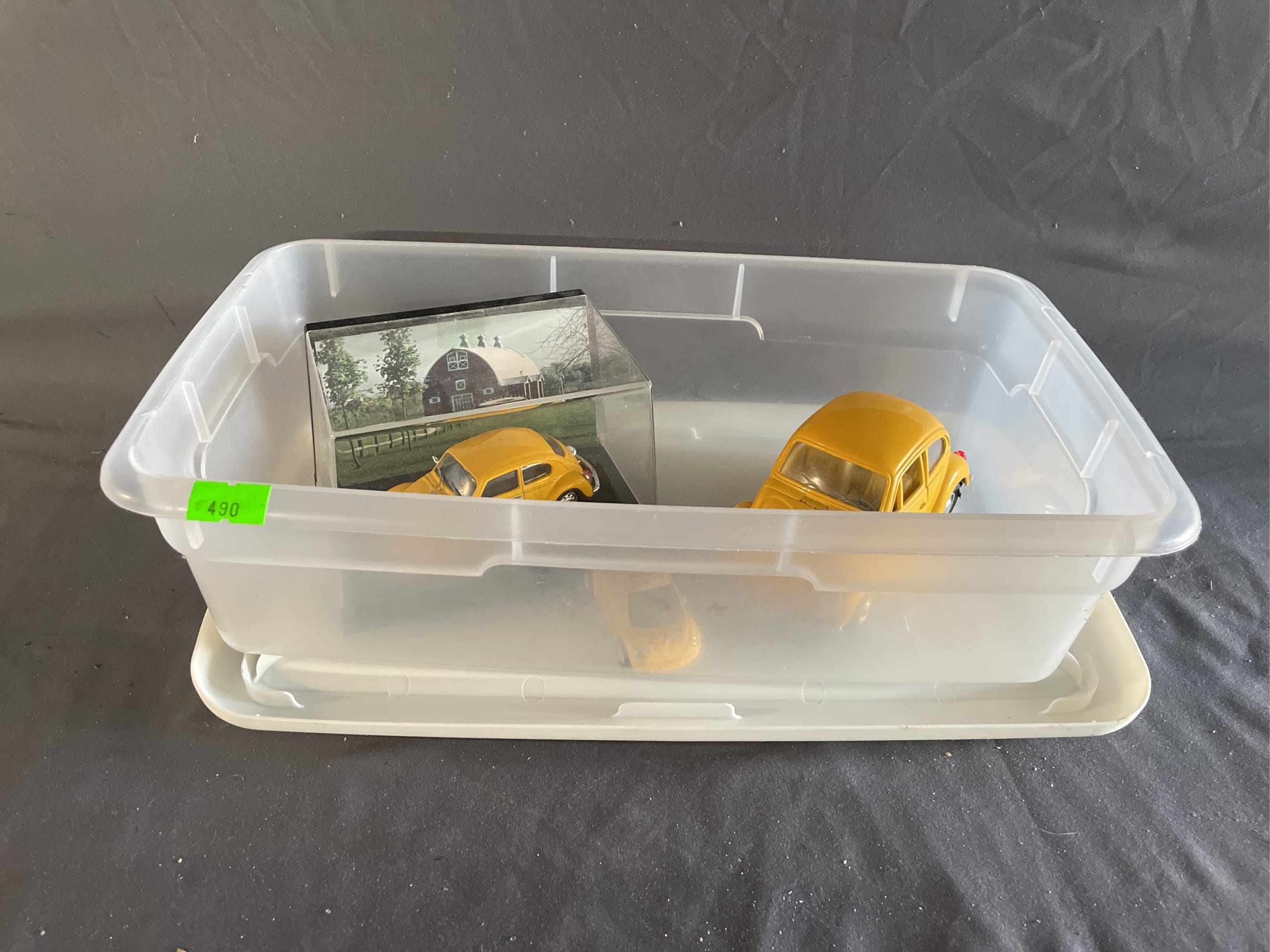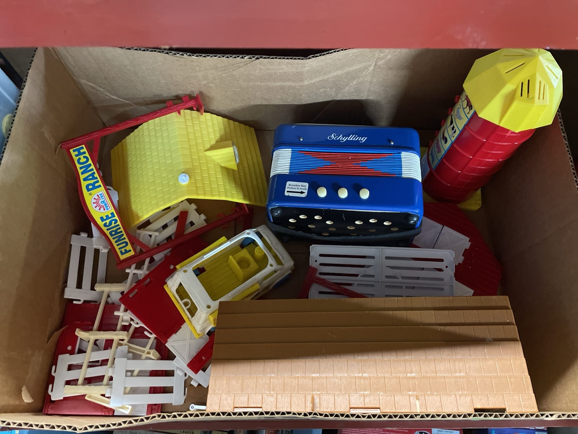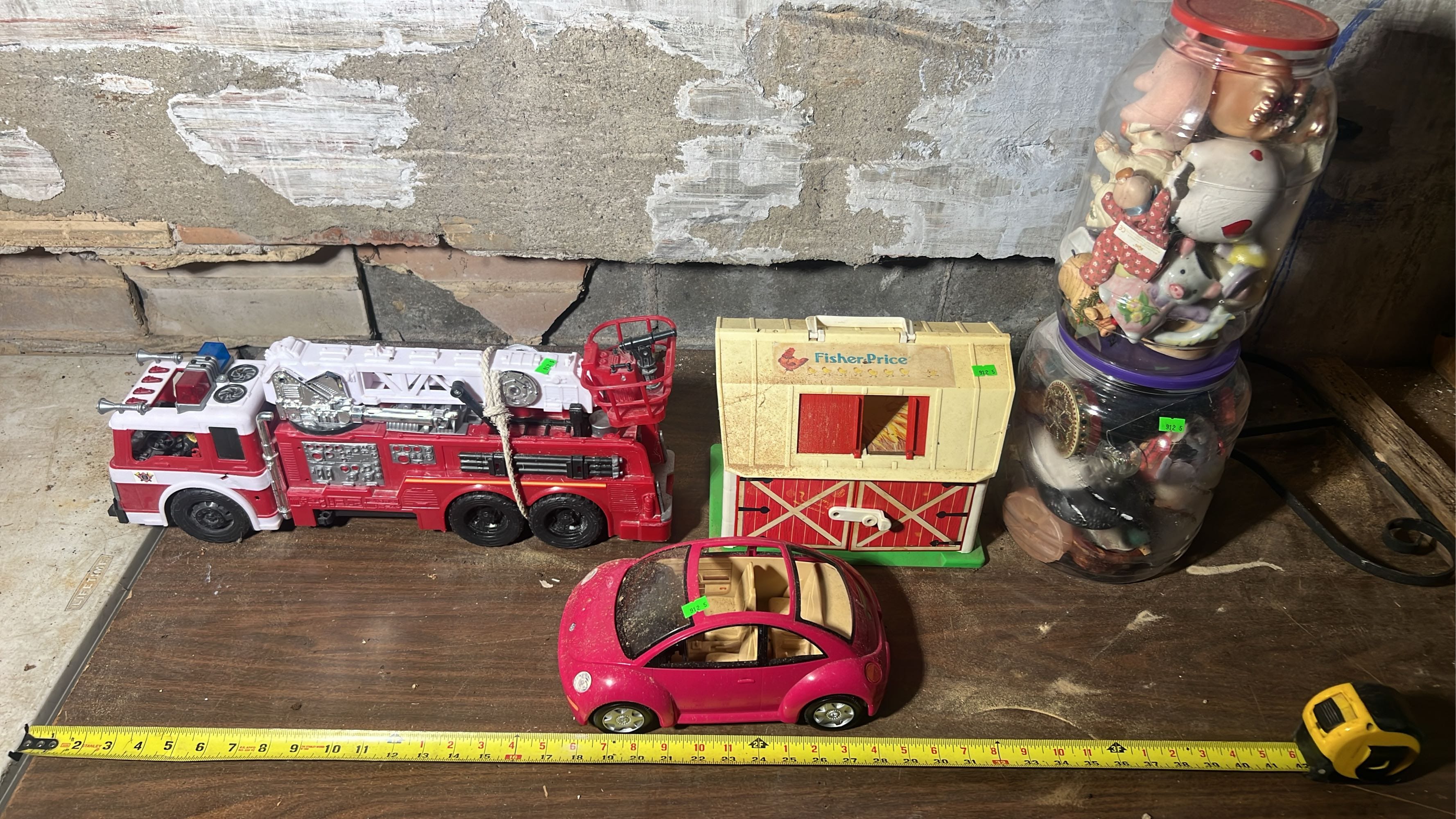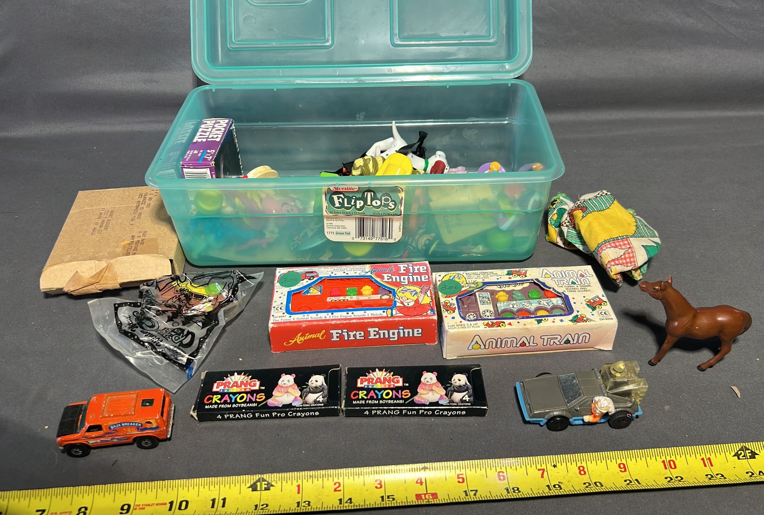 911 Toy assortment , firetruck , VW , Fisher Price barn , toys and miscellaneous in plastic containers