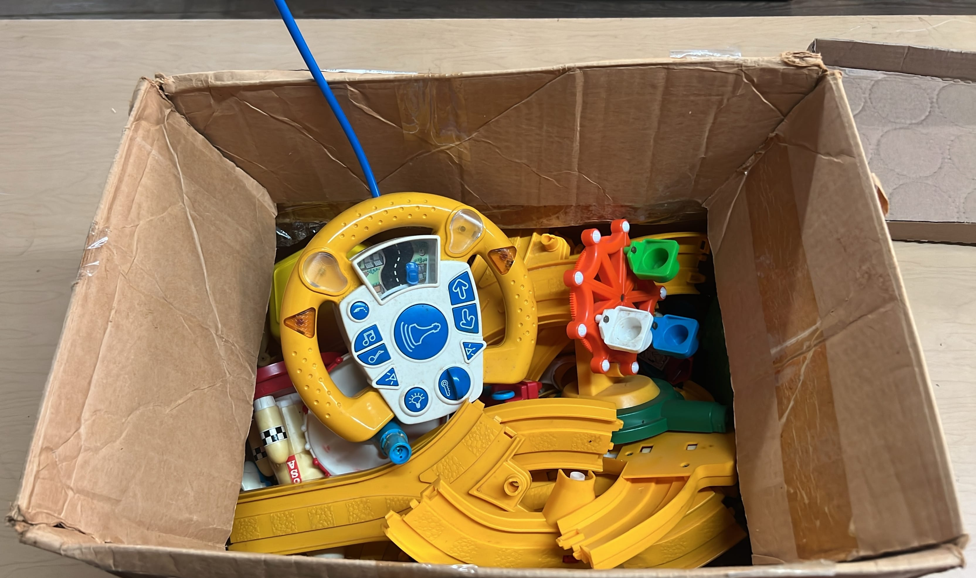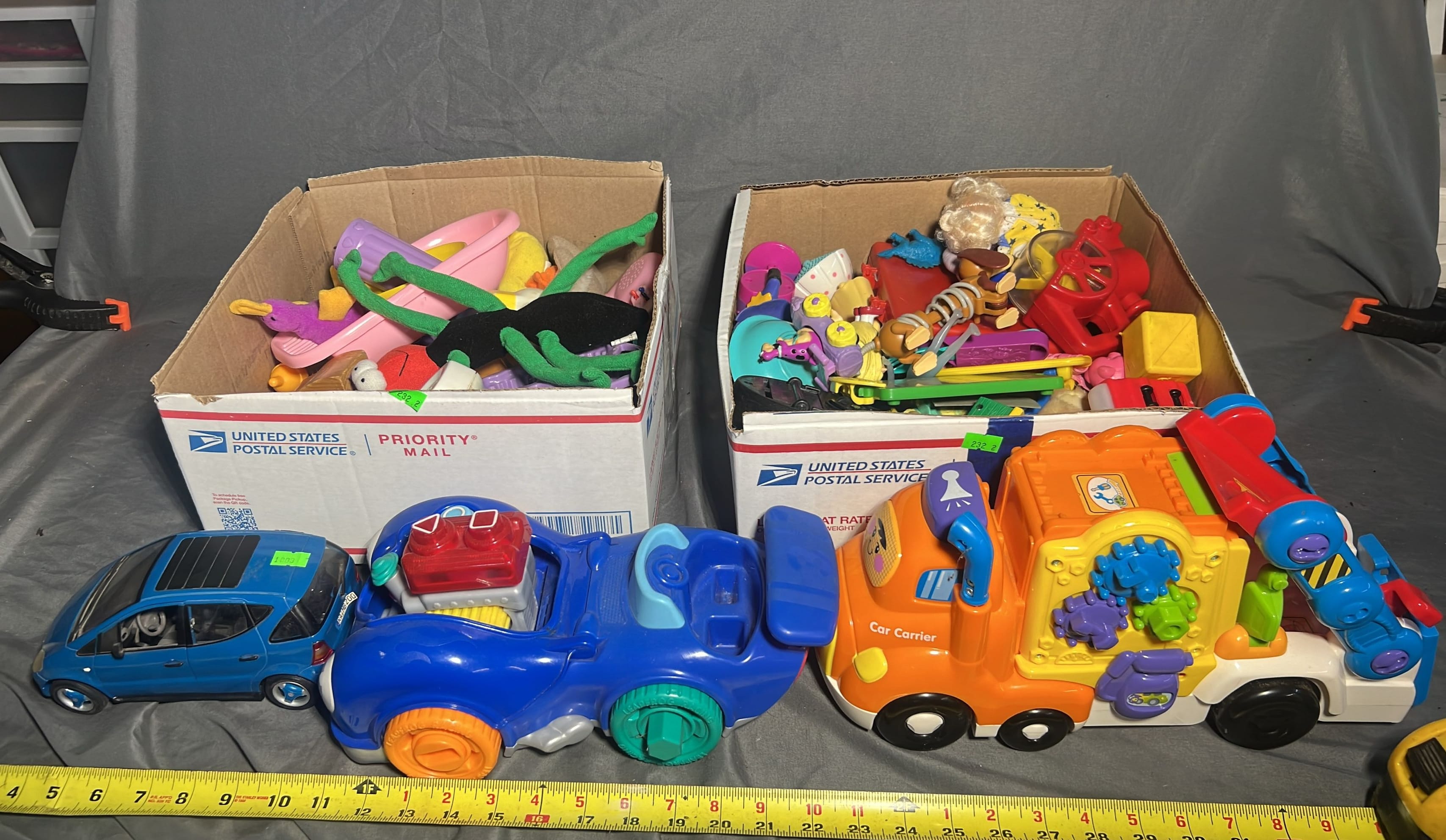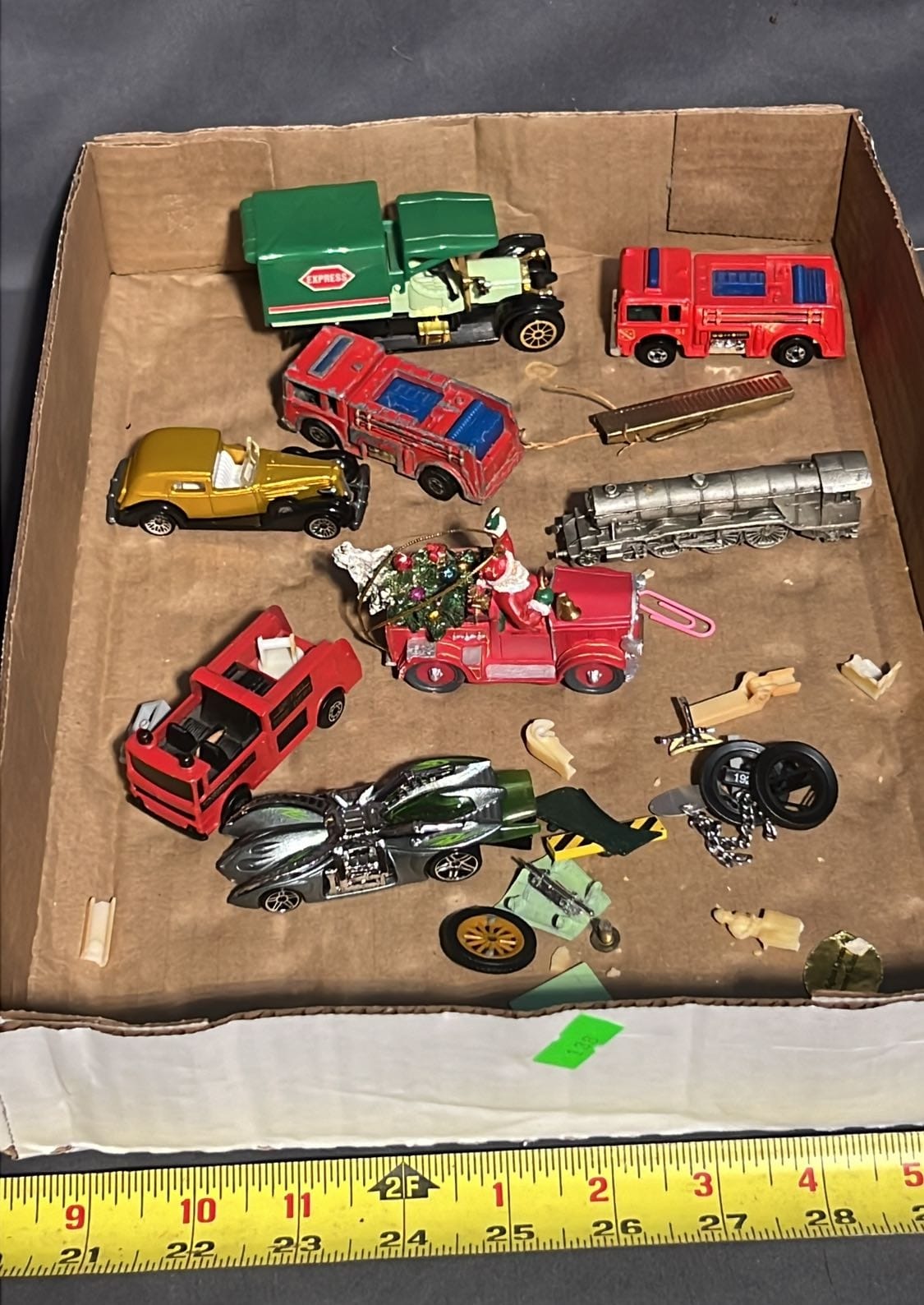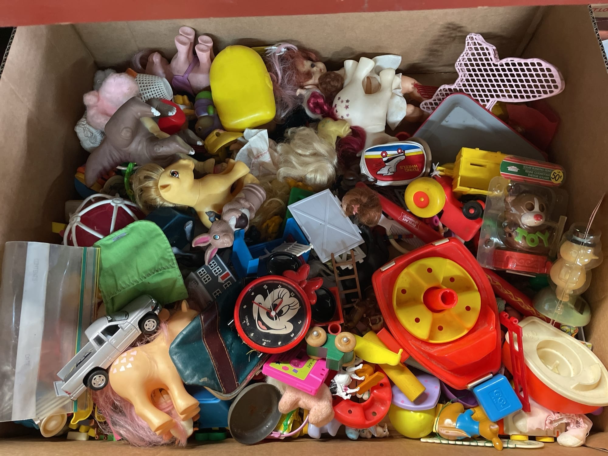 911 Toy assortment , firetruck , VW , Fisher Price barn , toys and miscellaneous in plastic containers