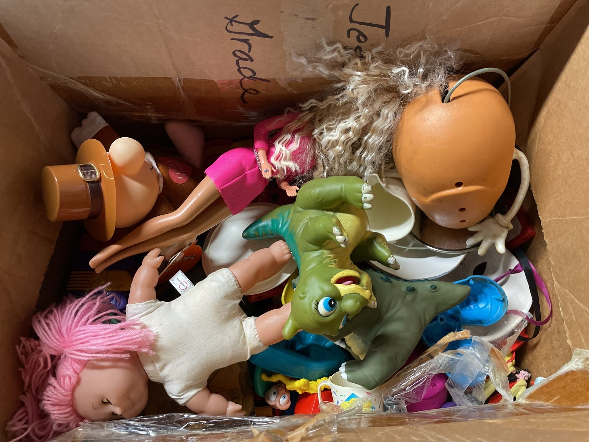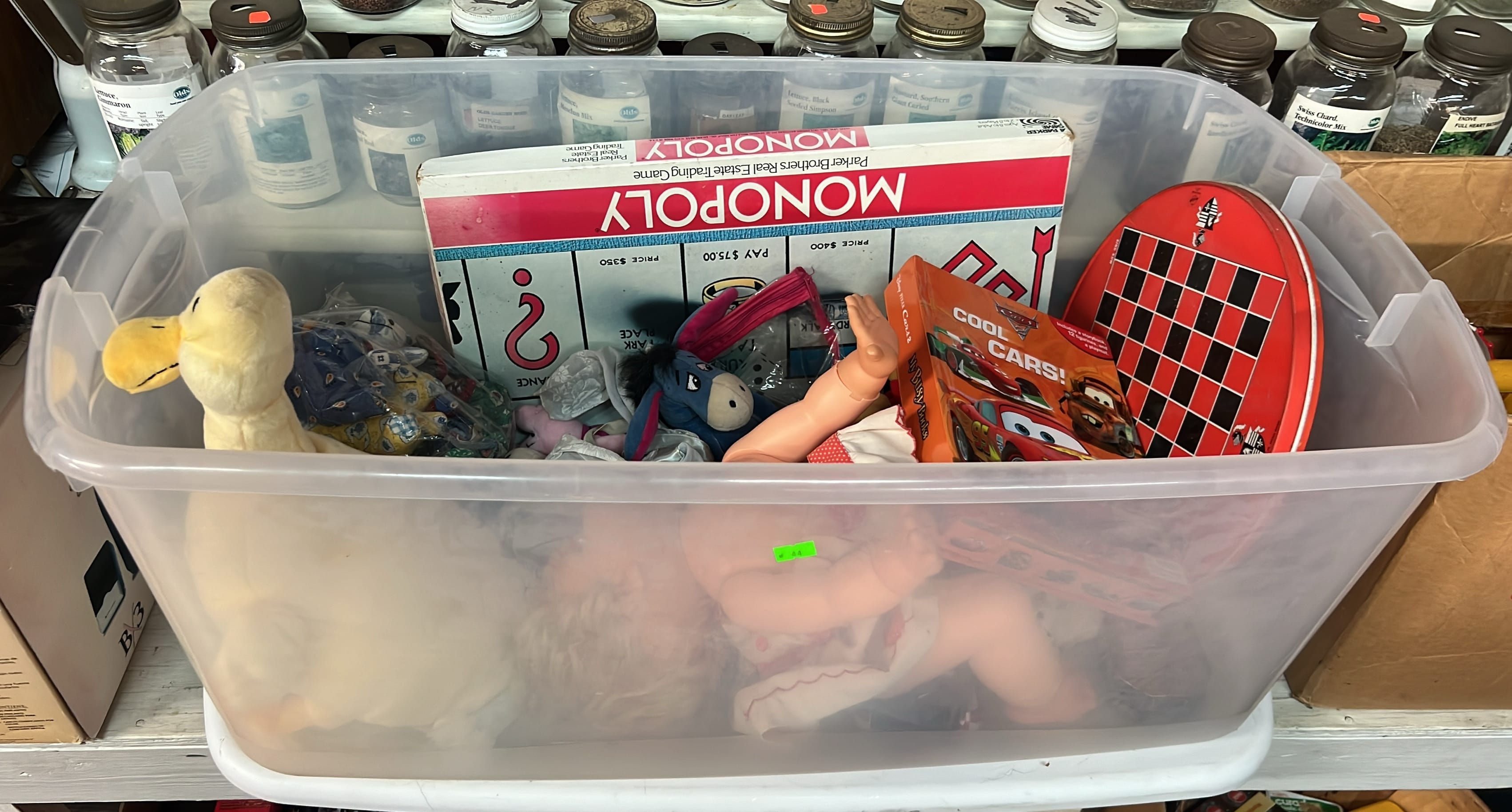 44 Monopoly , Dolls, stuffed Animals , Cool Cars Set , miscellaneous in large tote with lid