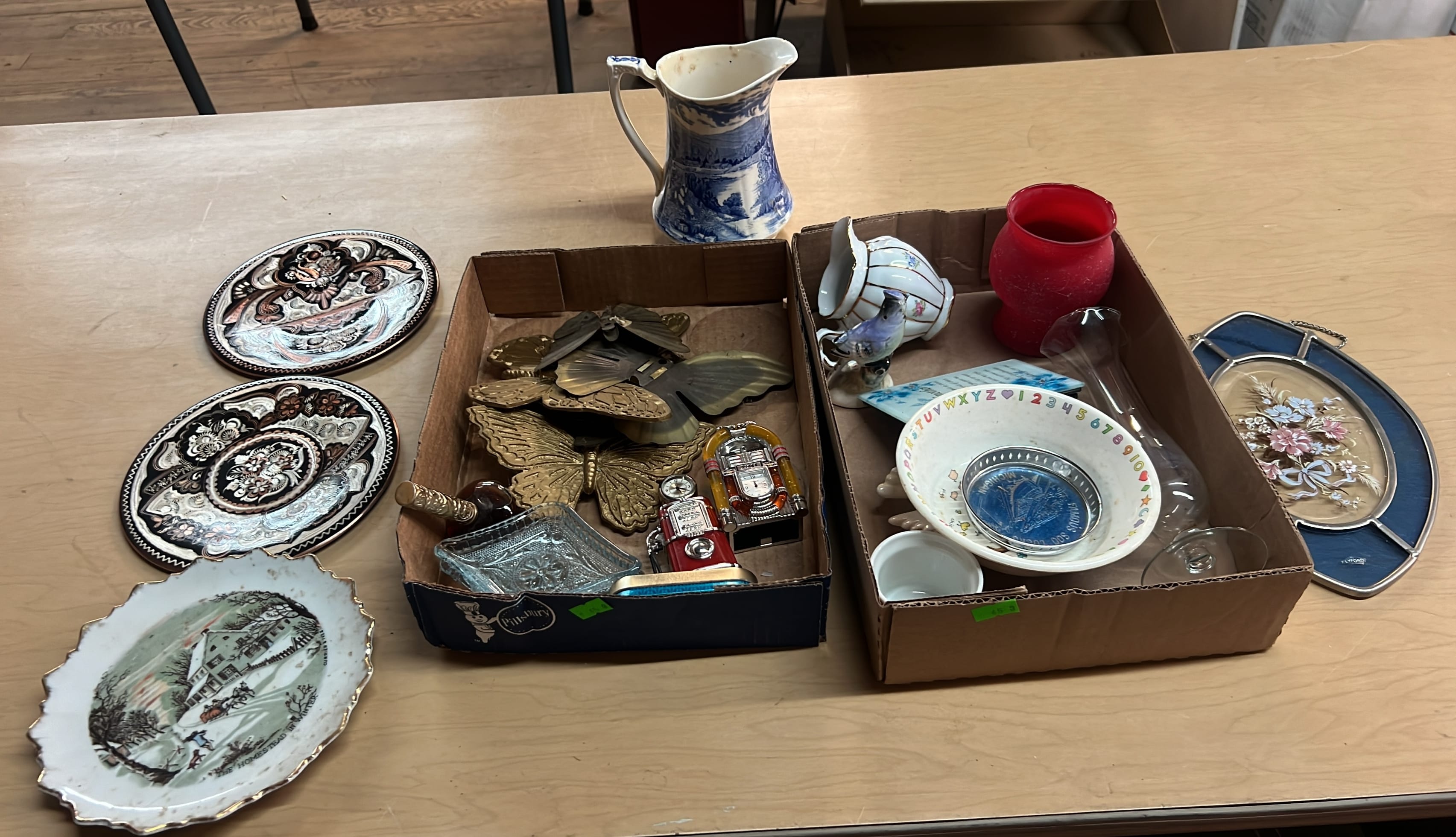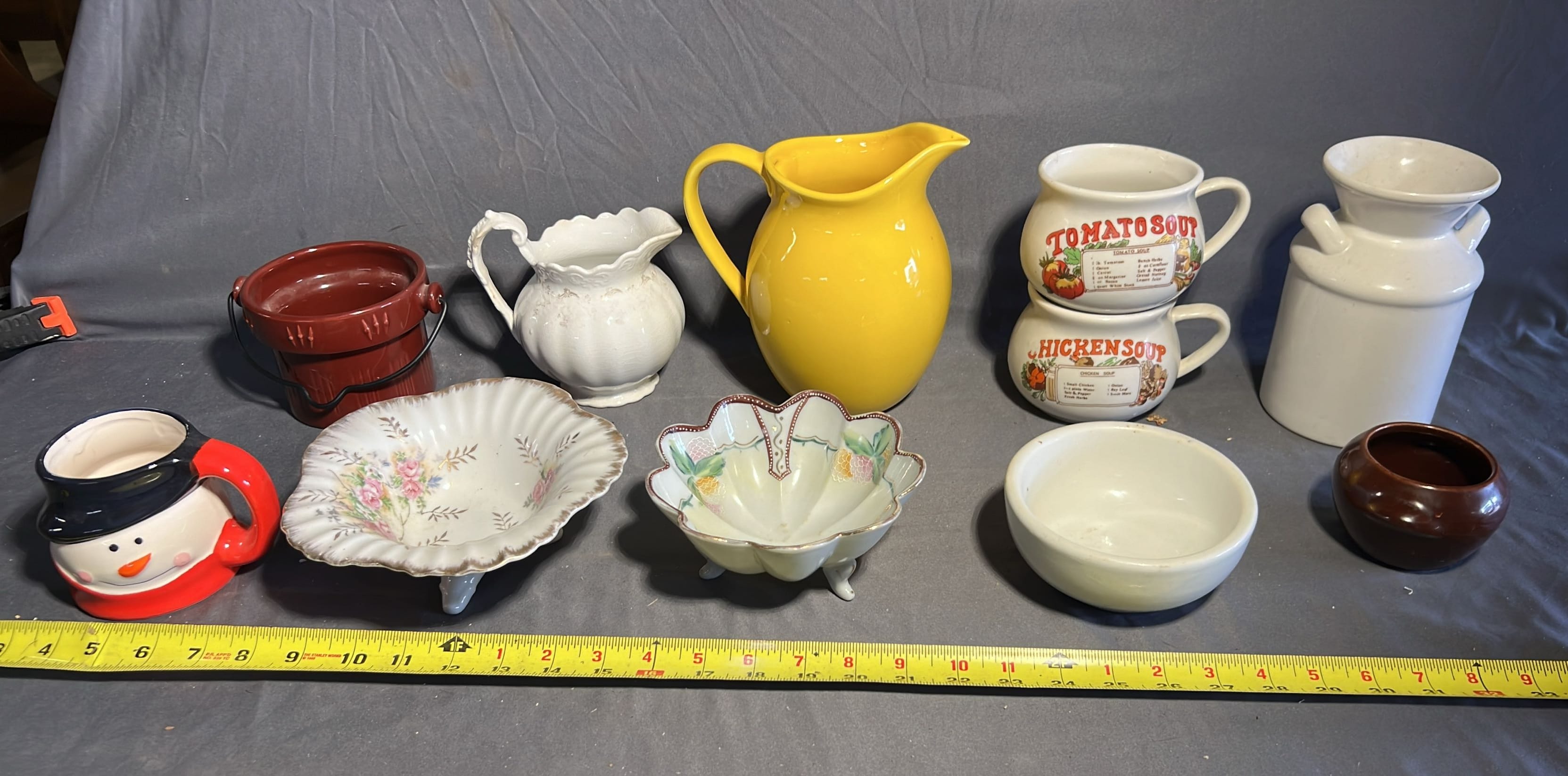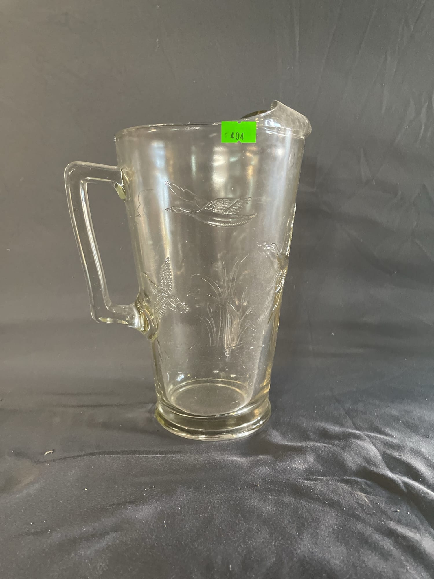 46 Tintern Pitcher 6”,has some chips , sun catcher ,wall decorations , small juke box clock , gas pump clock ,miscellaneous