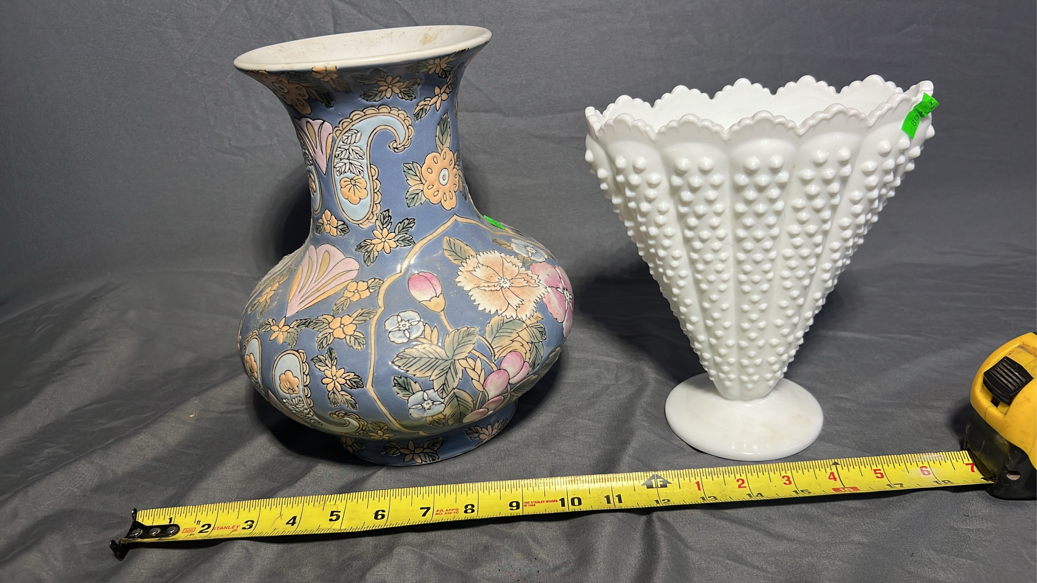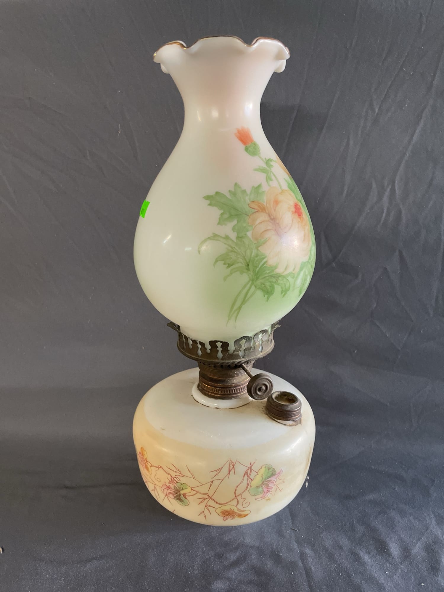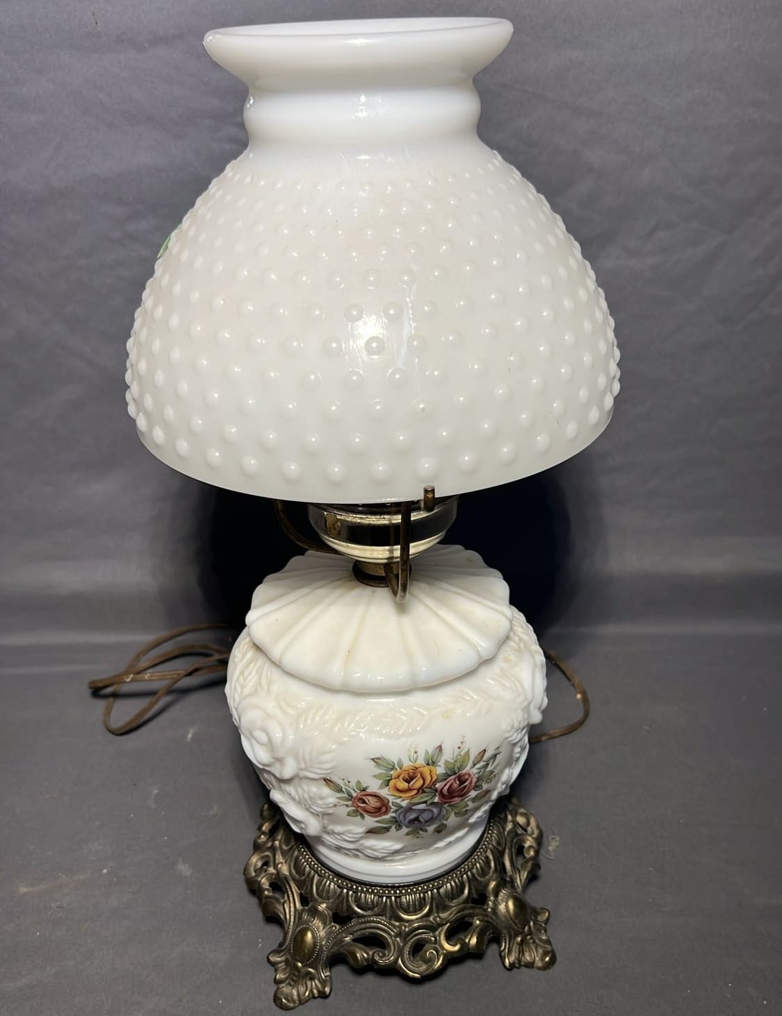 51 Milk Glass Painted Lamp with hobnail shade , 17” ,electric