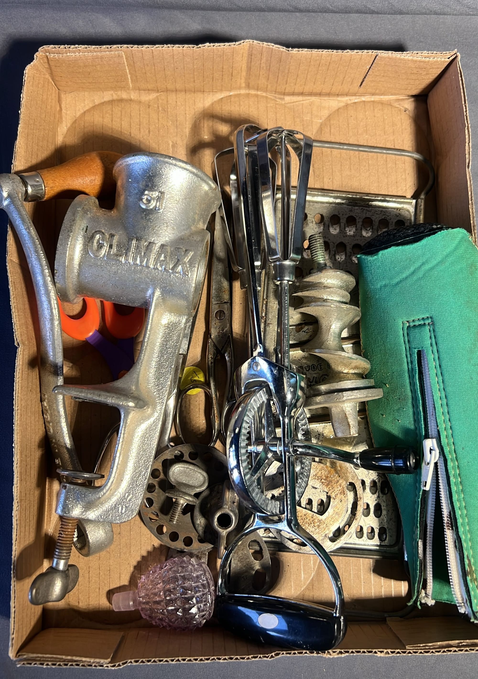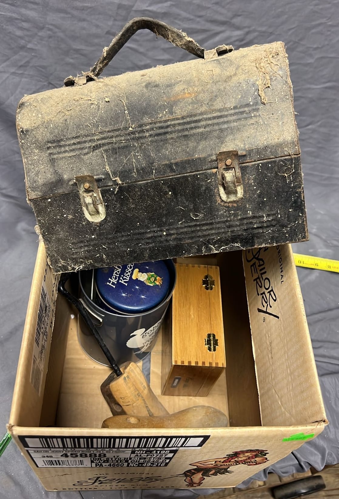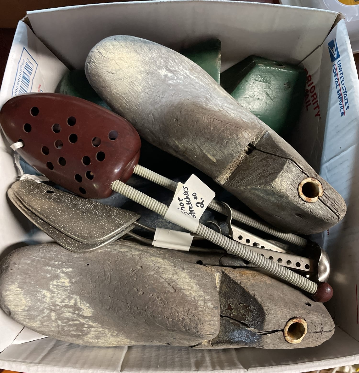 897 3- Hole punch , shoe stretchers , tins , metal lunch box