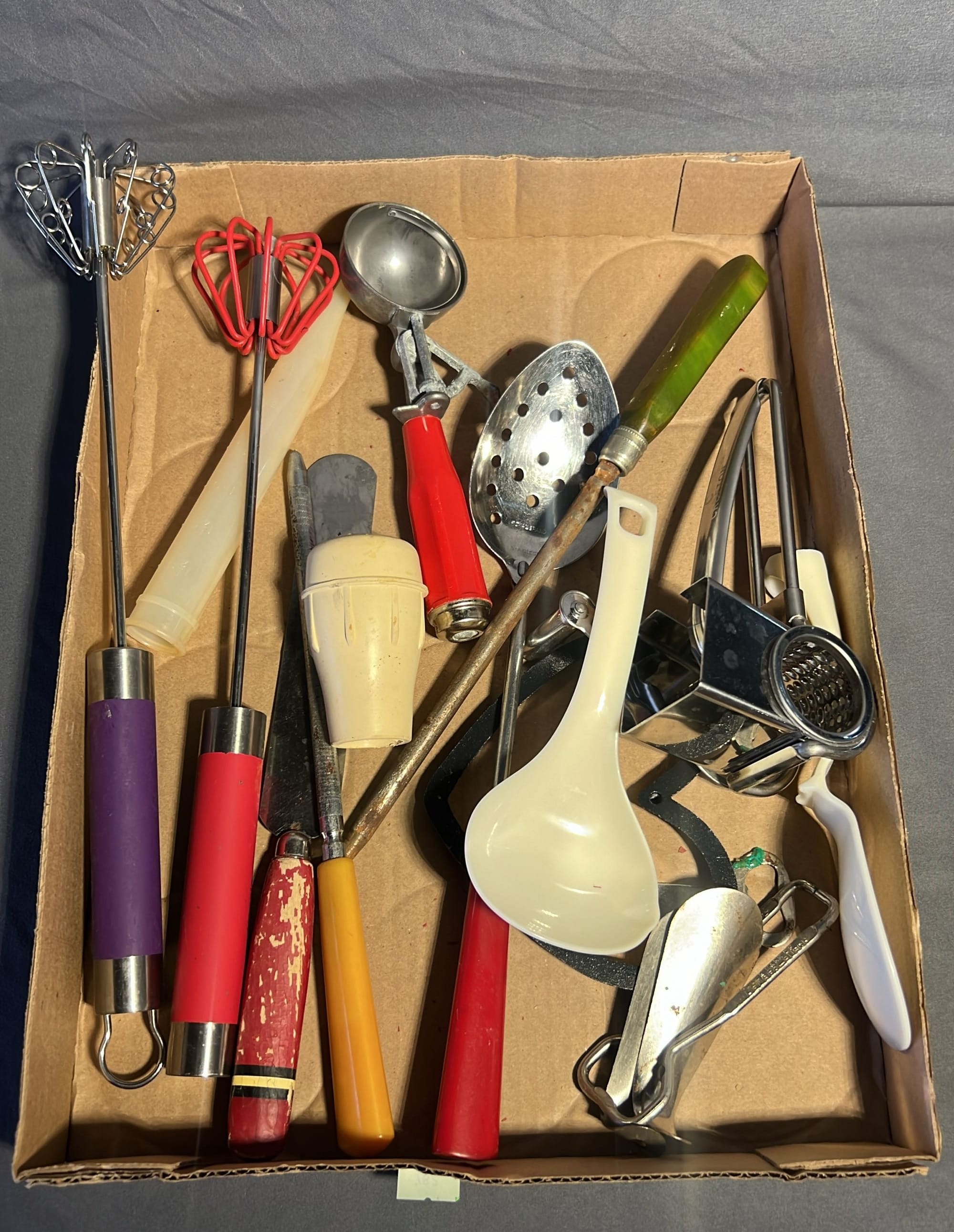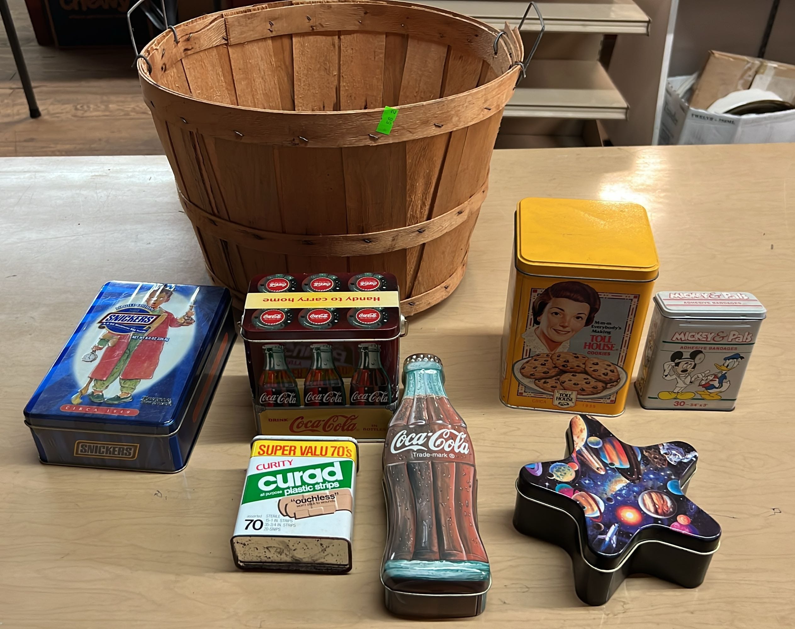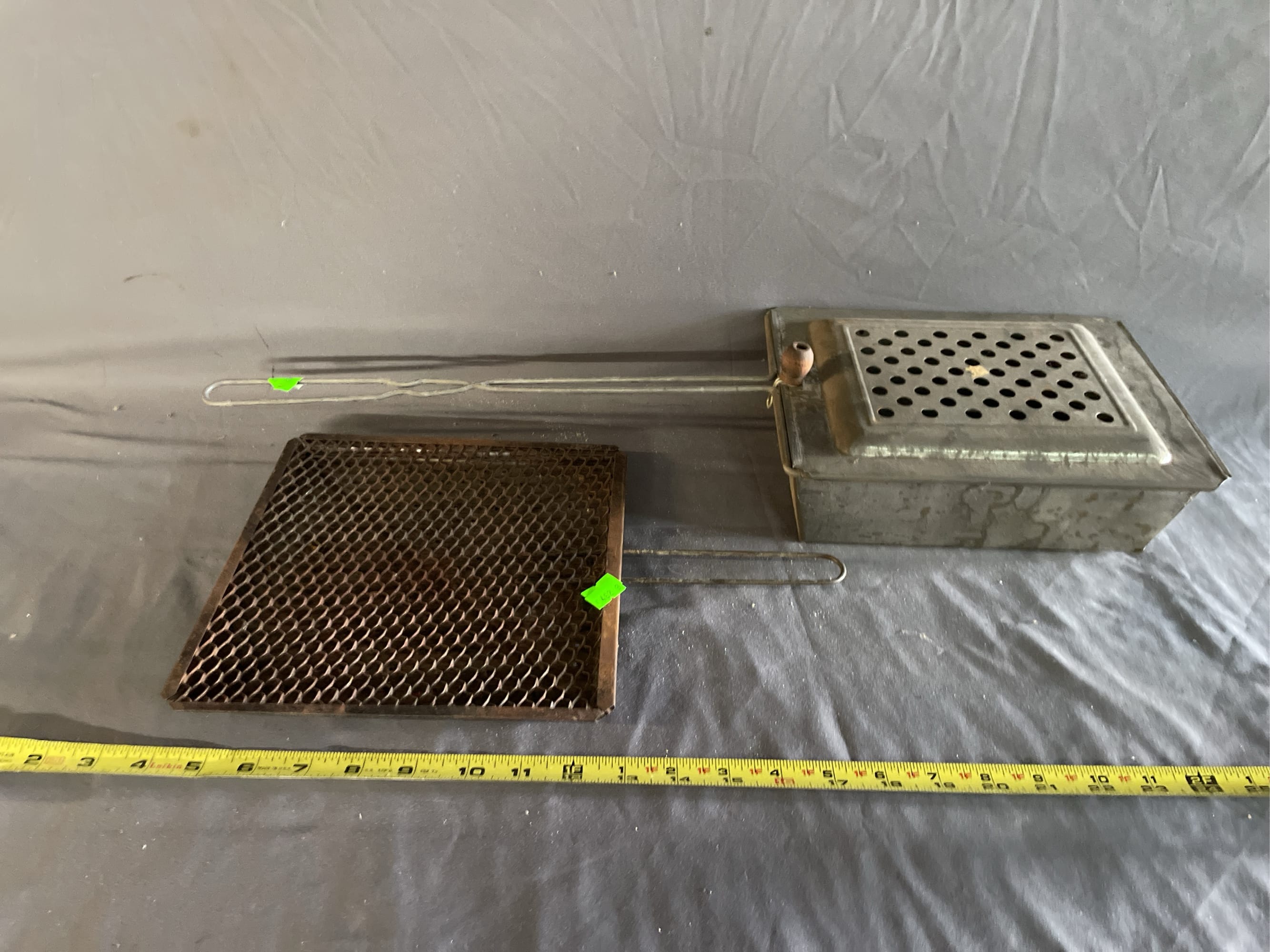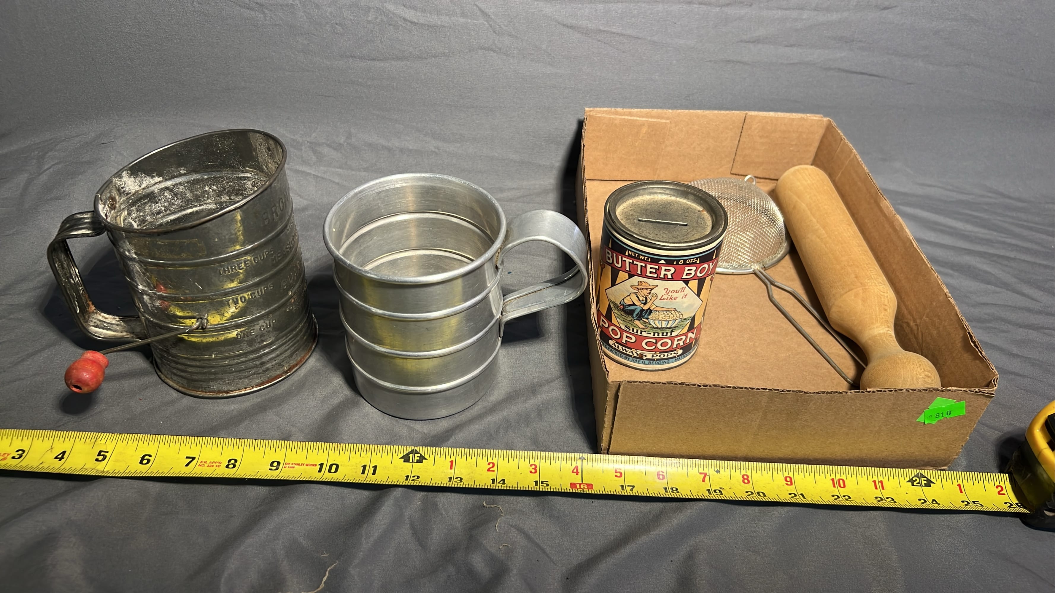 897 3- Hole punch , shoe stretchers , tins , metal lunch box