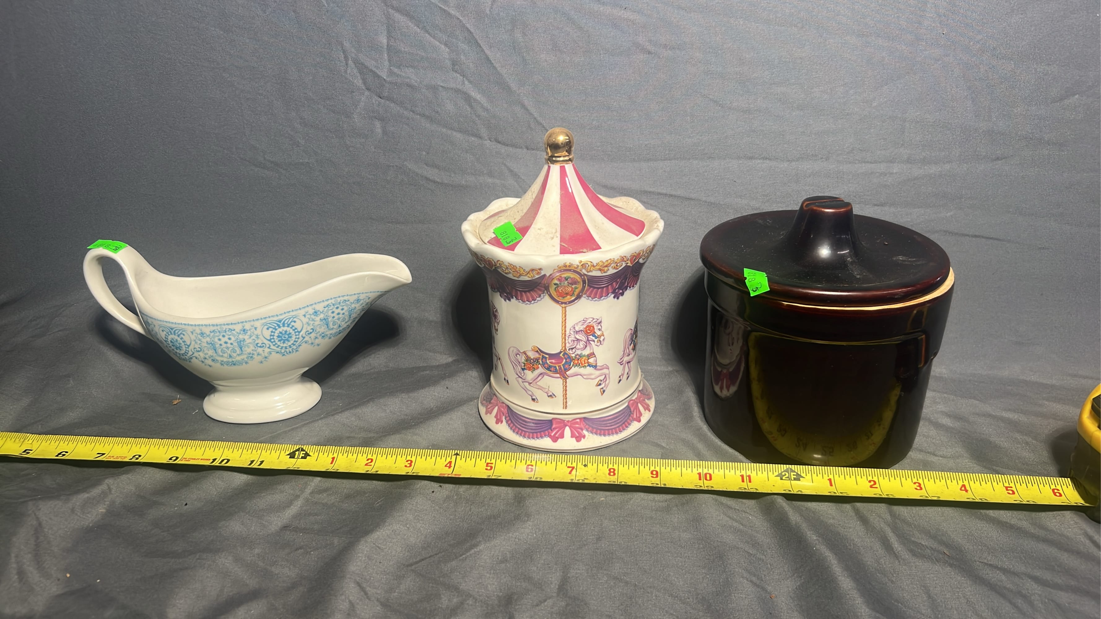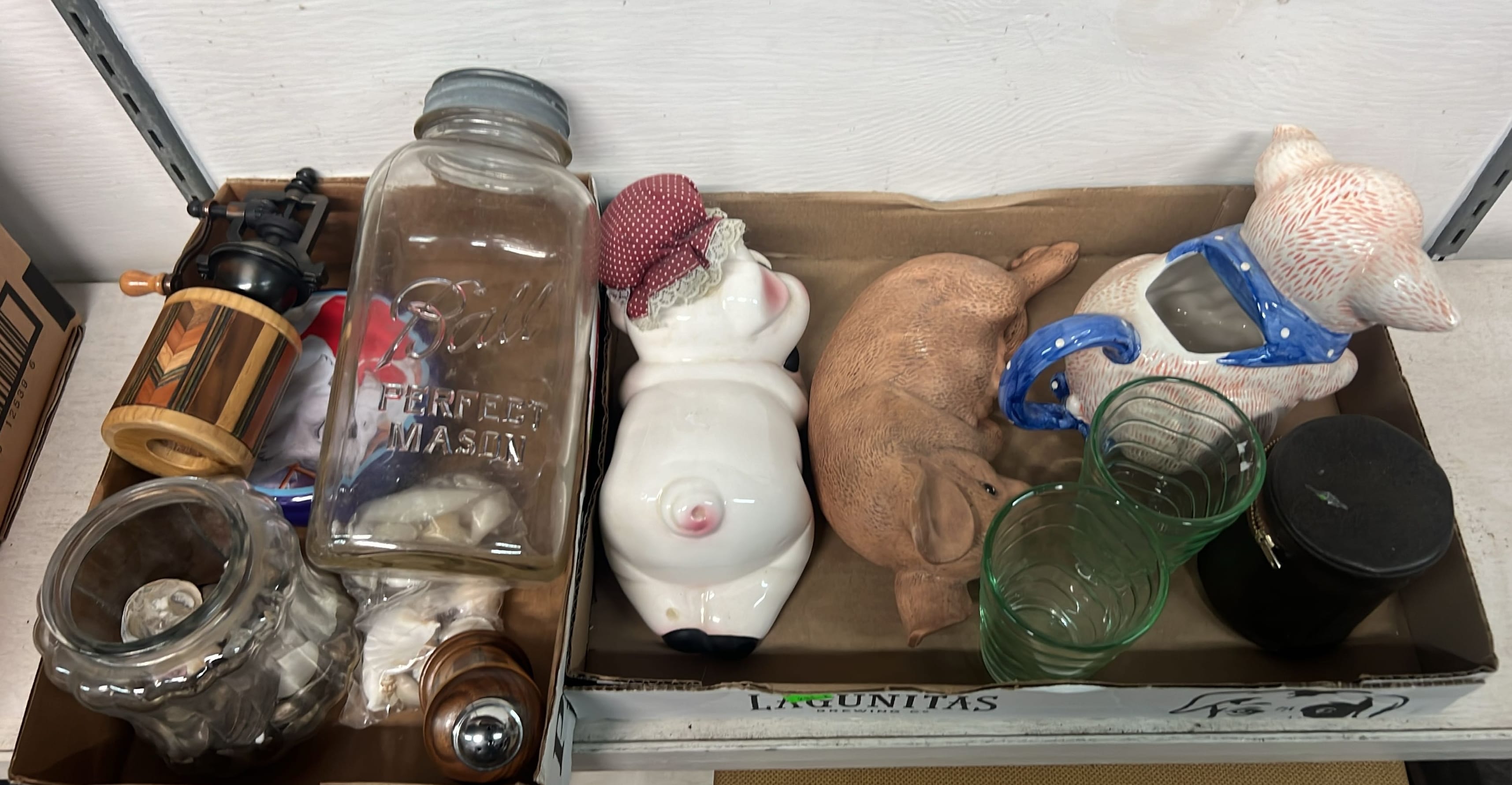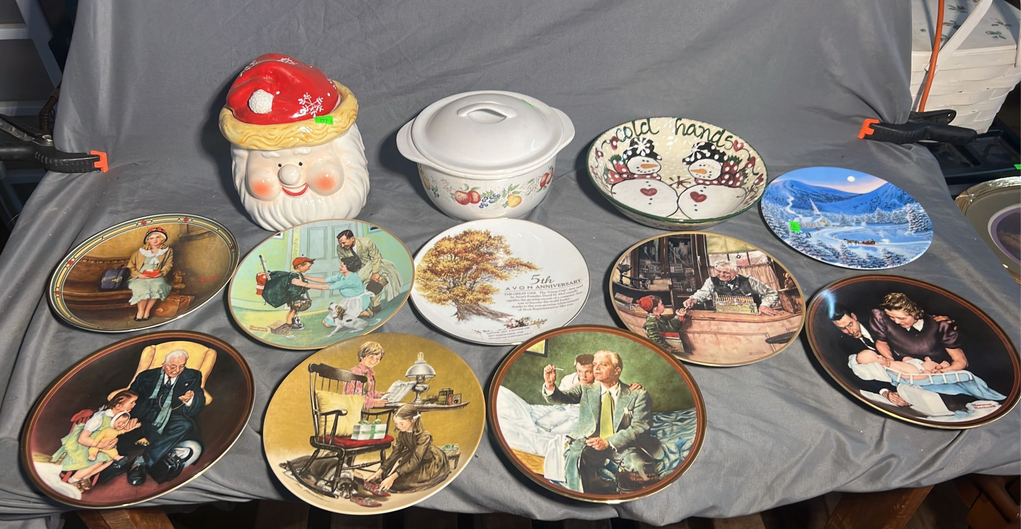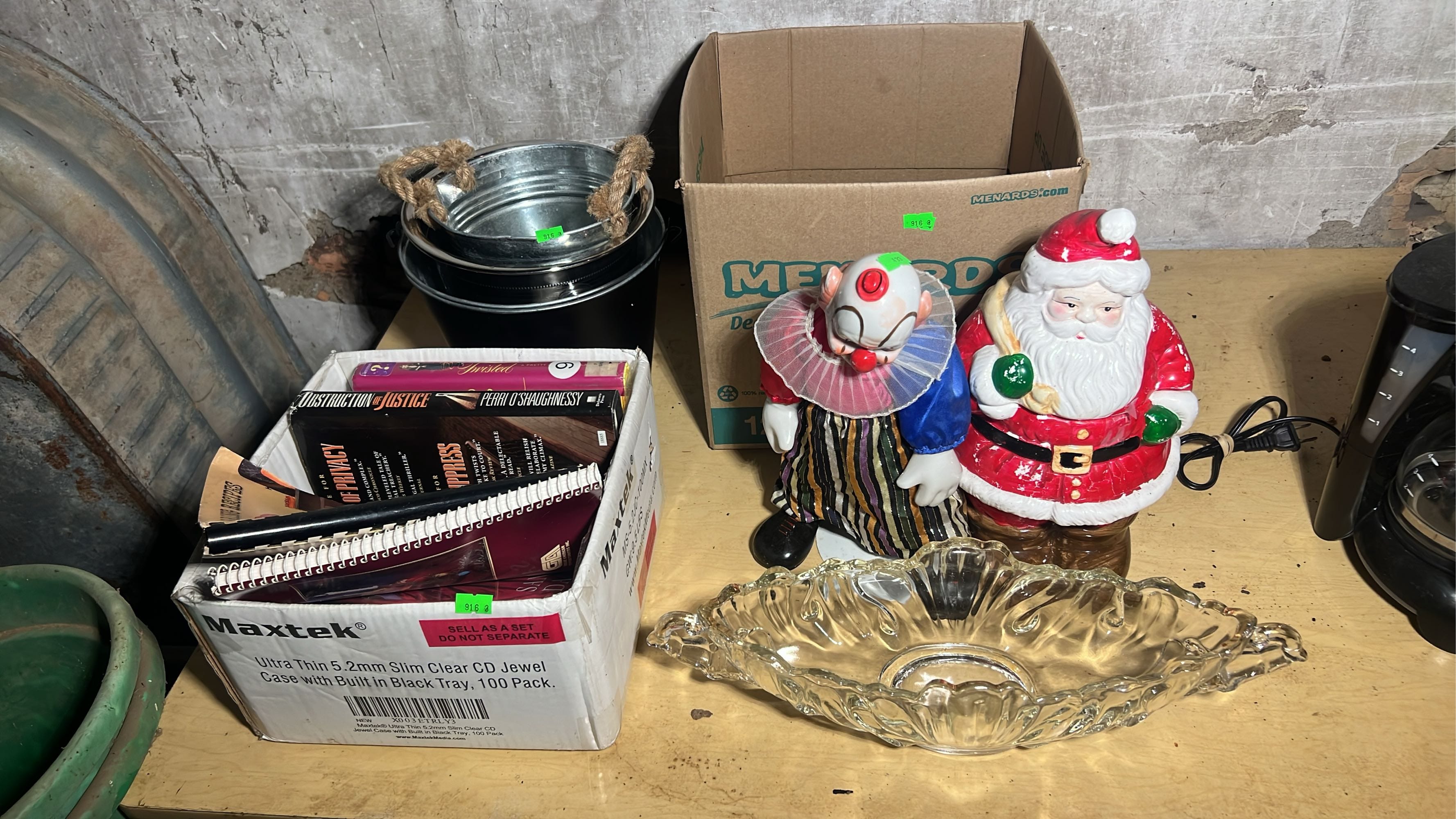 916 Porcelain Clown , books , Santa cookie jar , glass dish , small metal buckets , miscellaneous