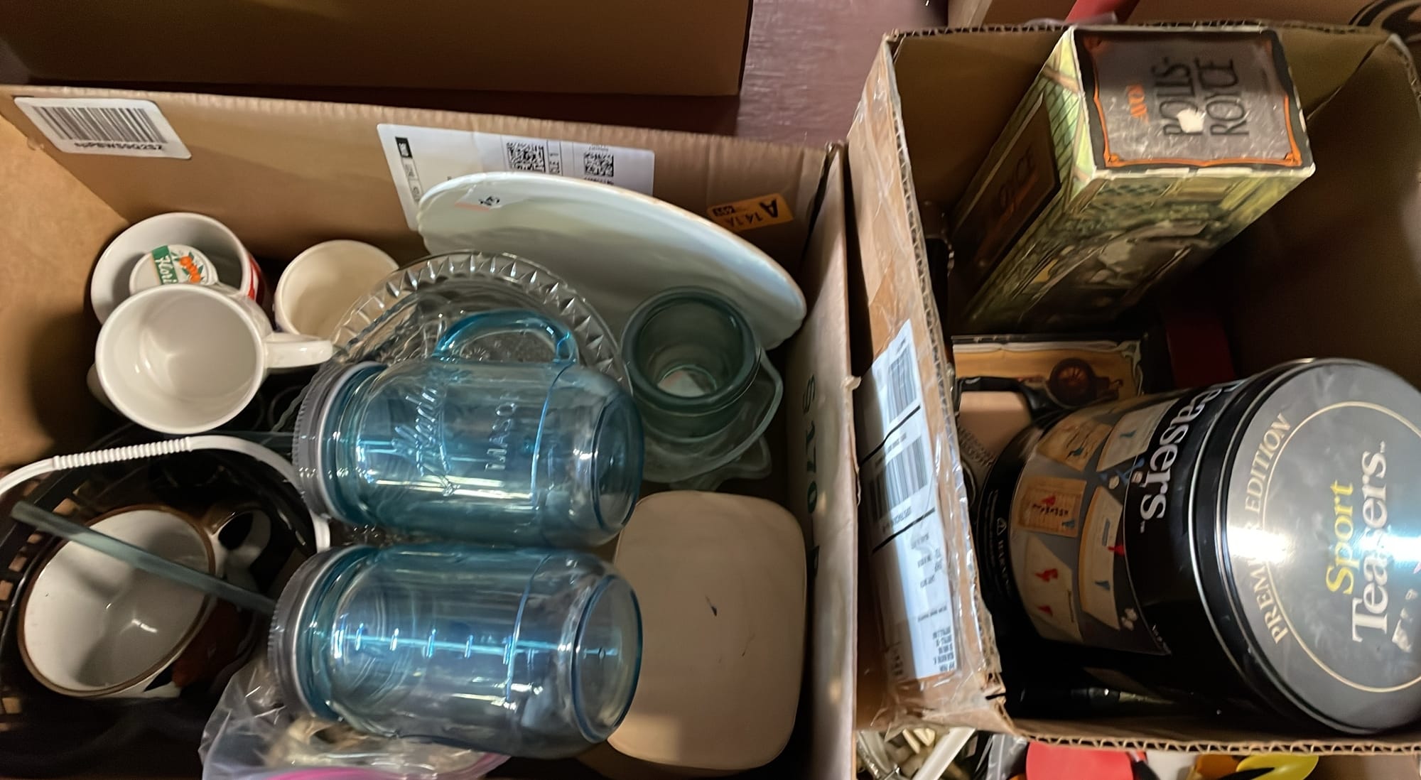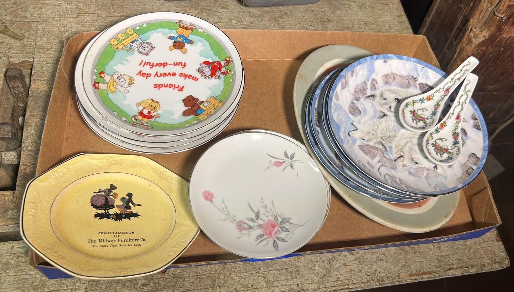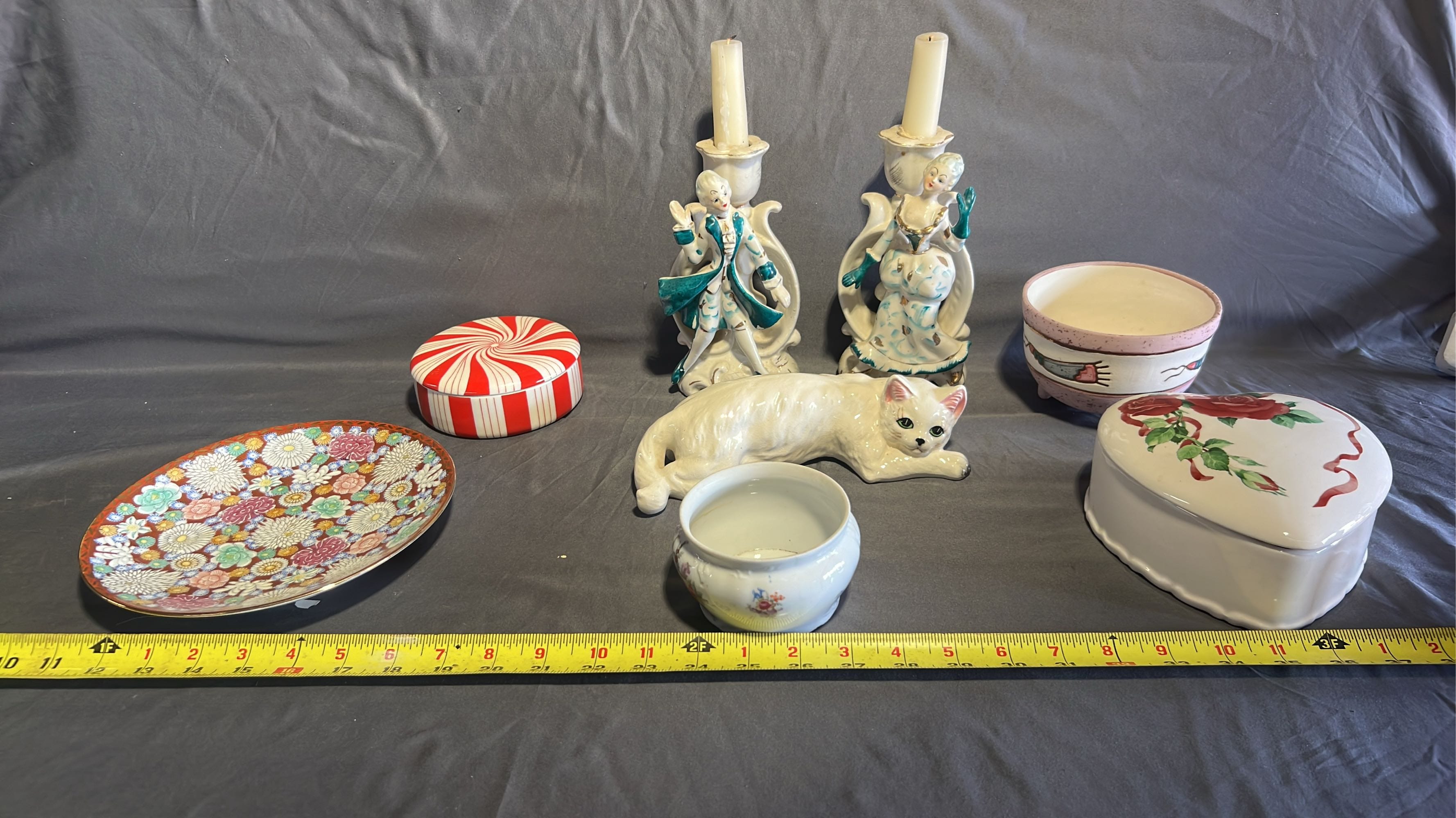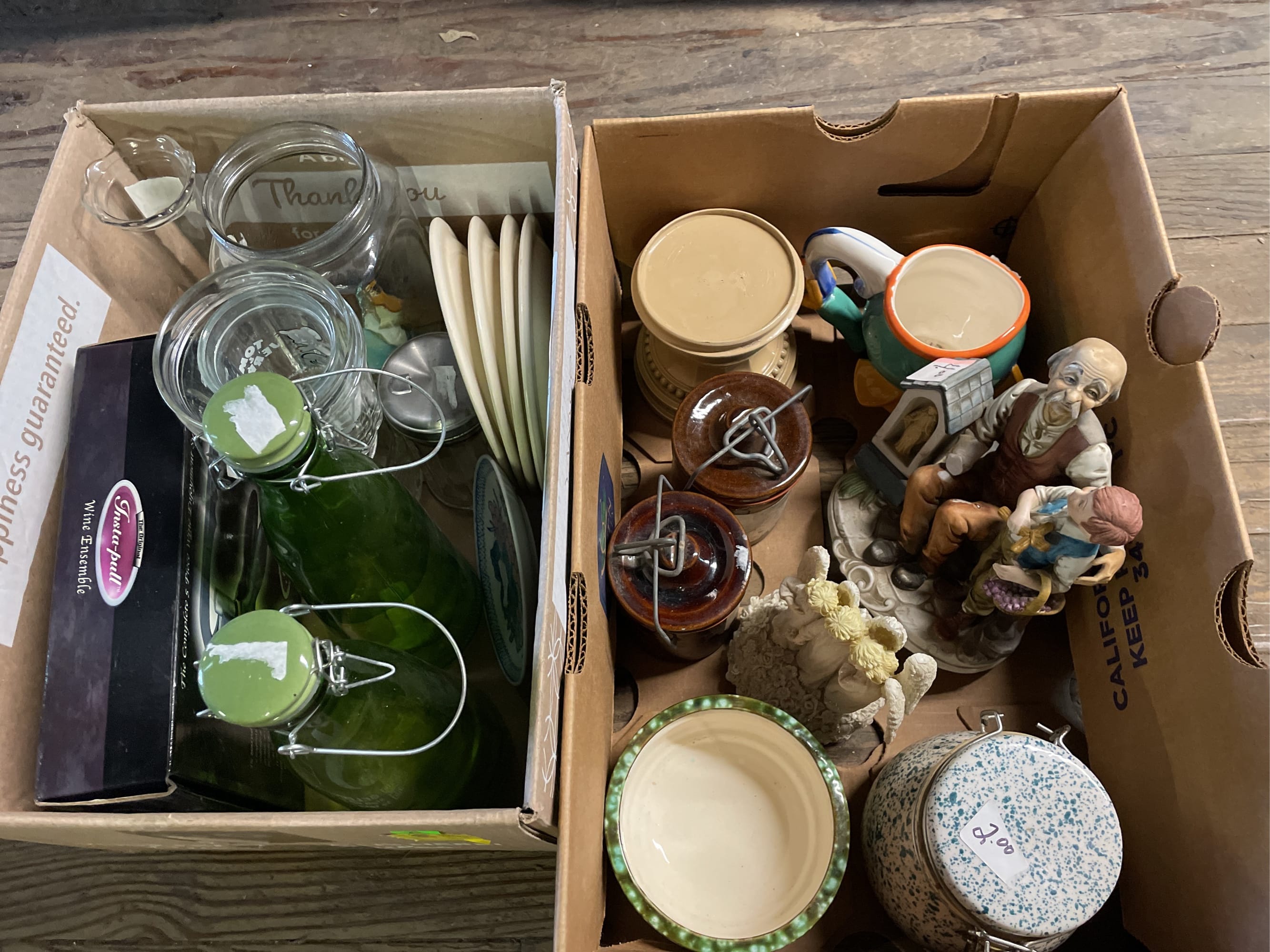 916 Porcelain Clown , books , Santa cookie jar , glass dish , small metal buckets , miscellaneous