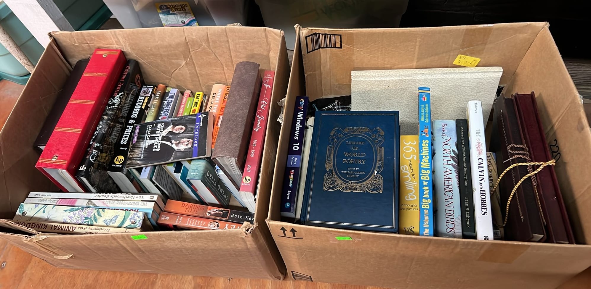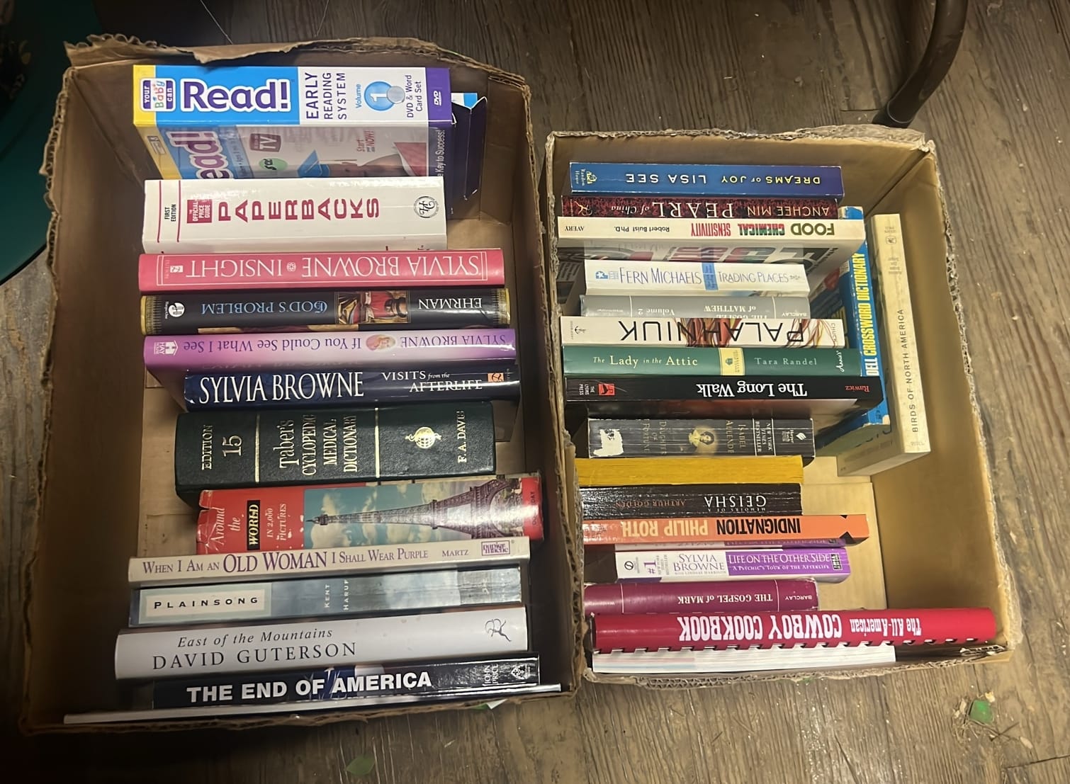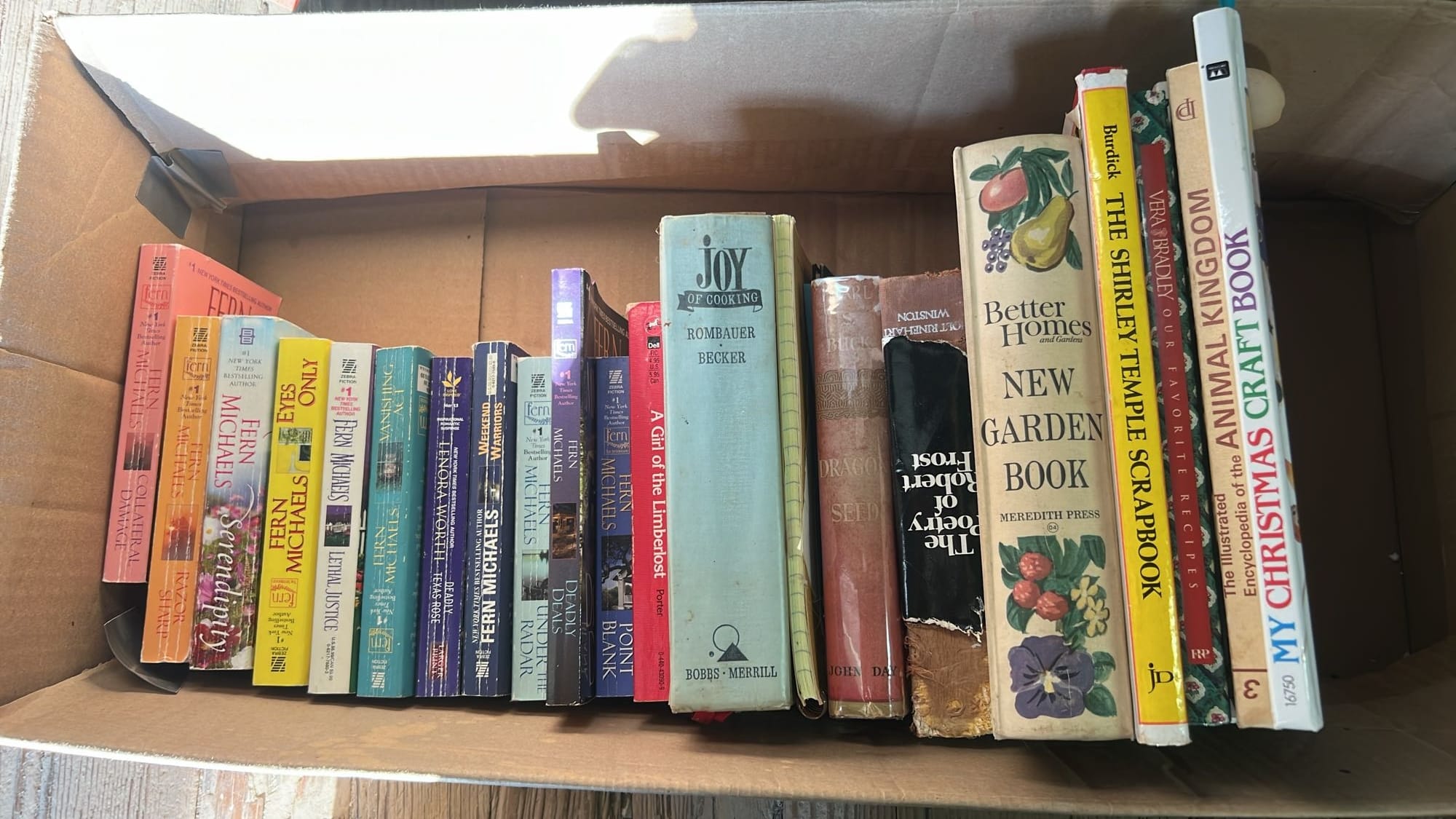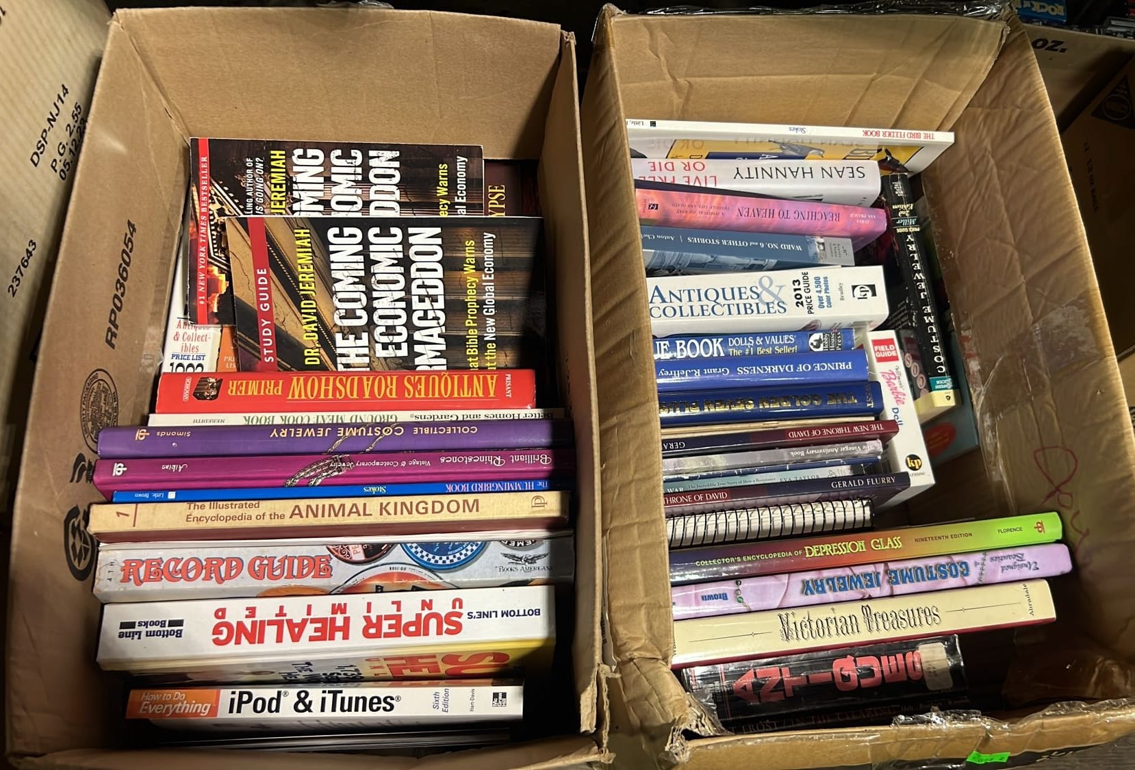 916 Porcelain Clown , books , Santa cookie jar , glass dish , small metal buckets , miscellaneous