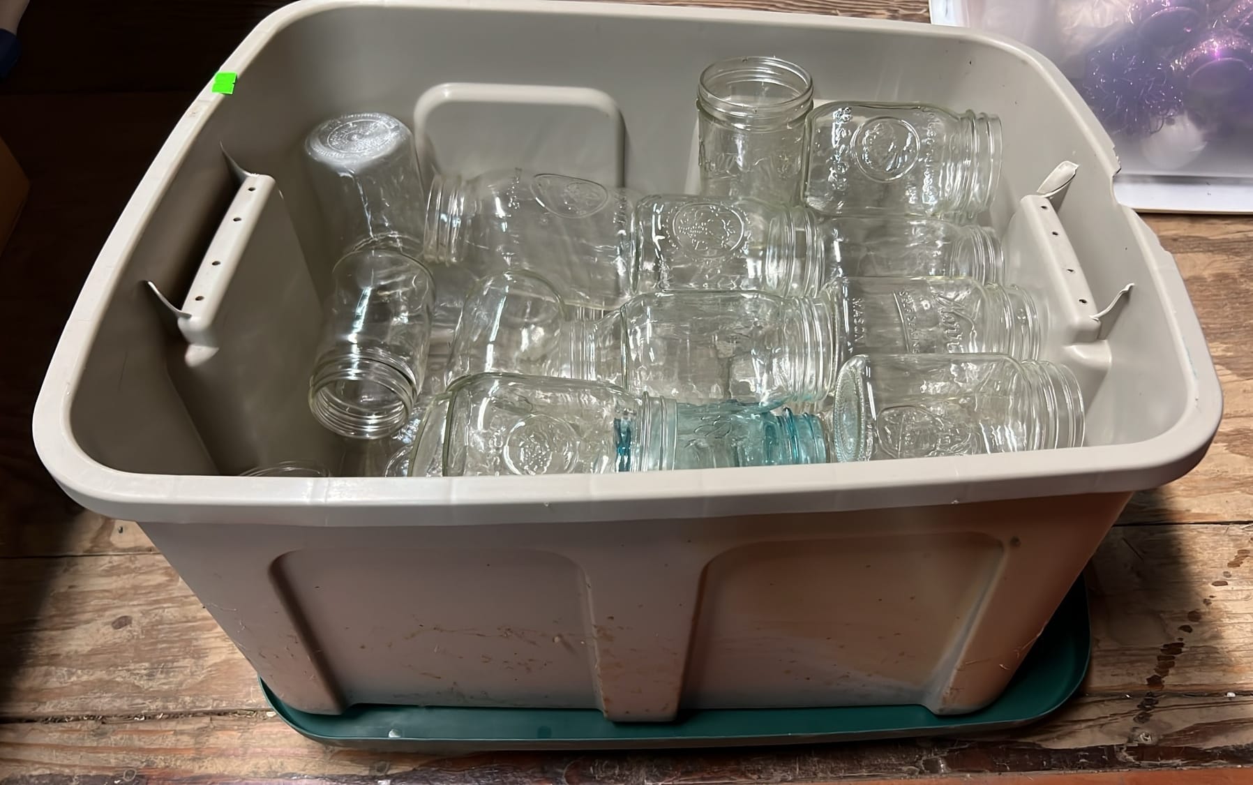 63 Canning Jar Assortment,mostly pts with some qts in tote with Lid