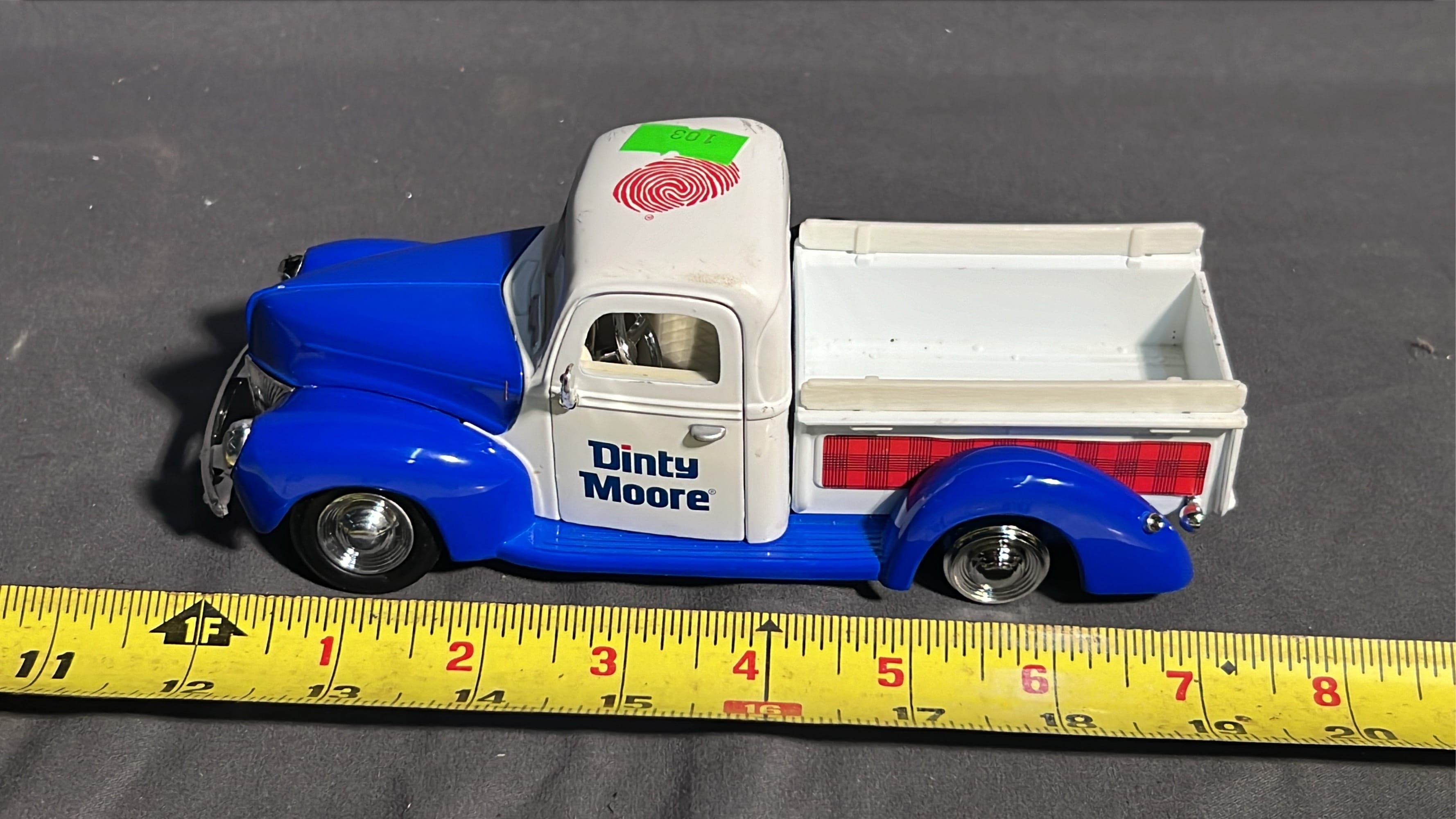 103 1940 Ford Dinty Moore Truck ,1:24 Scale die cast ,missing Rubber tire on left rear