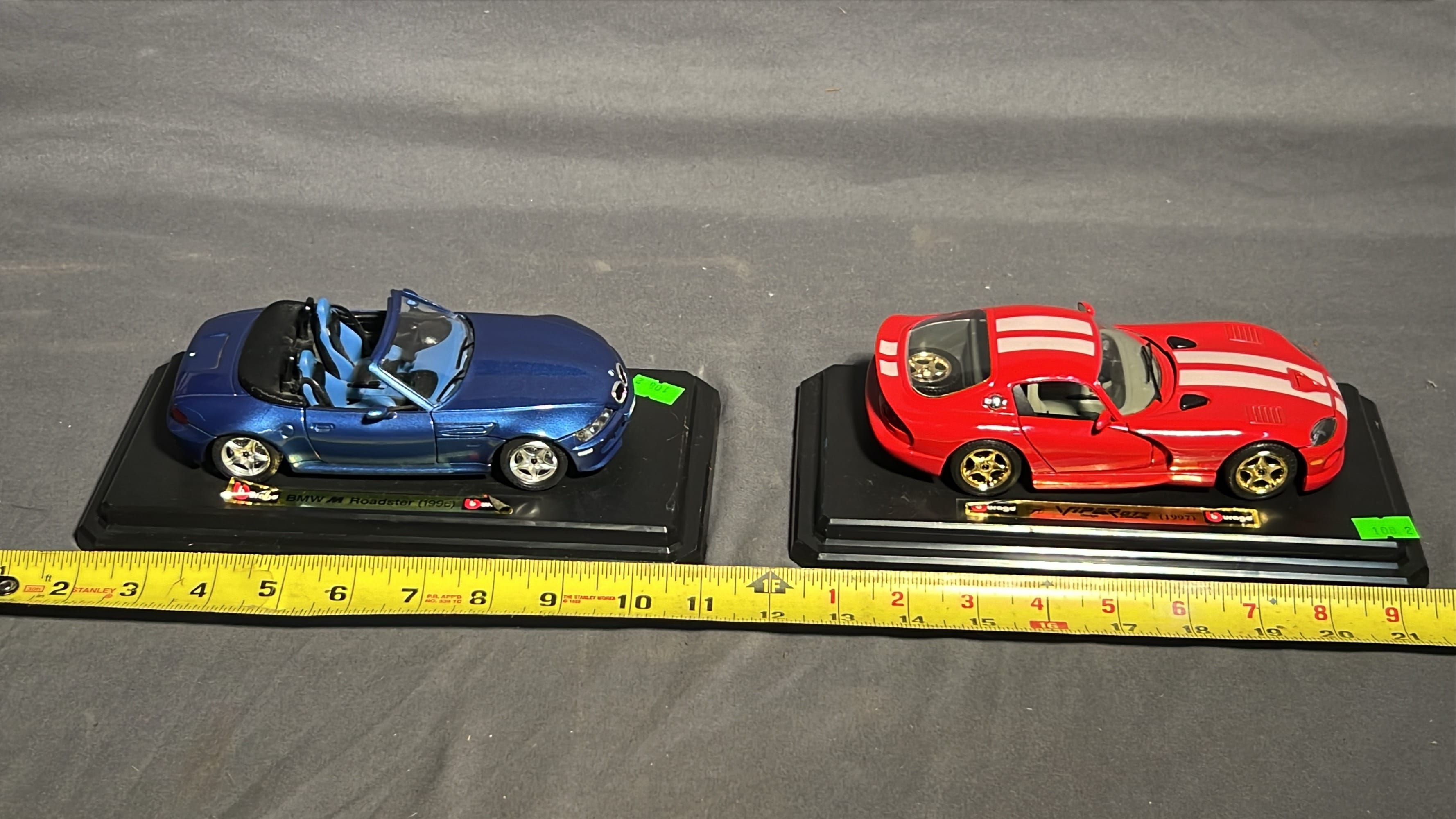 108 Burago 1996 BMW M Roadster ,6.5”, 1997 Dodge Viper GTS coupe 7”