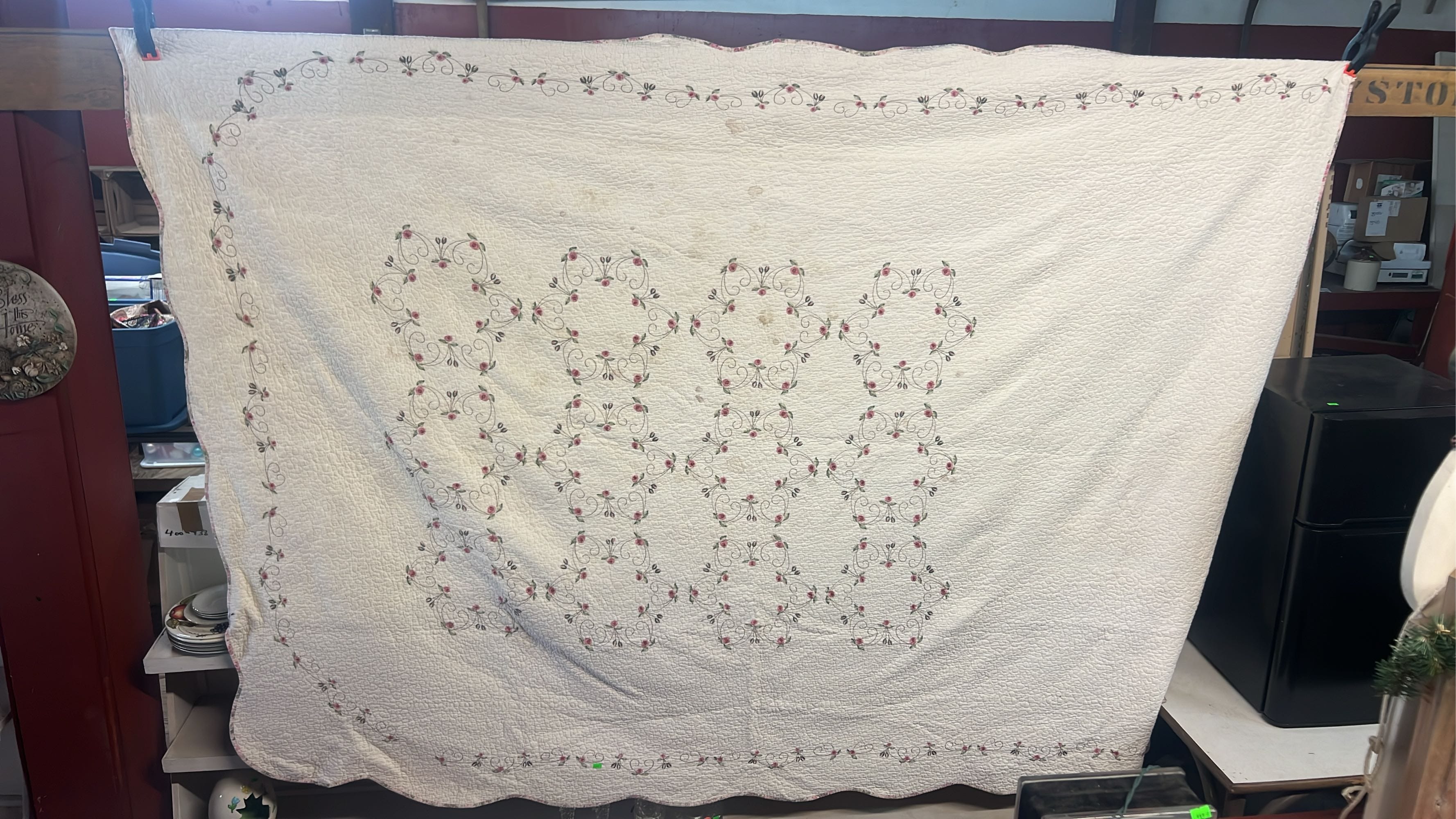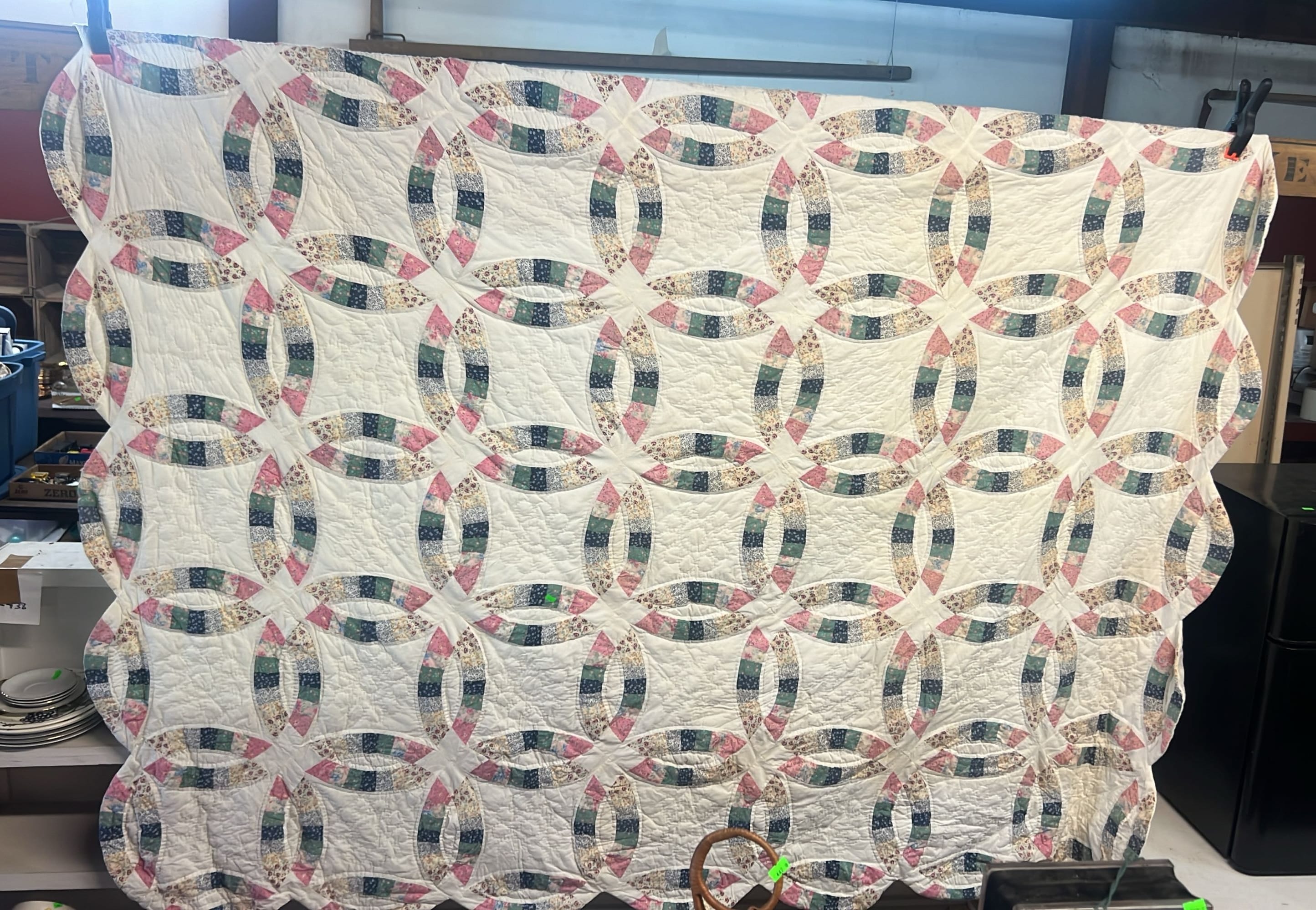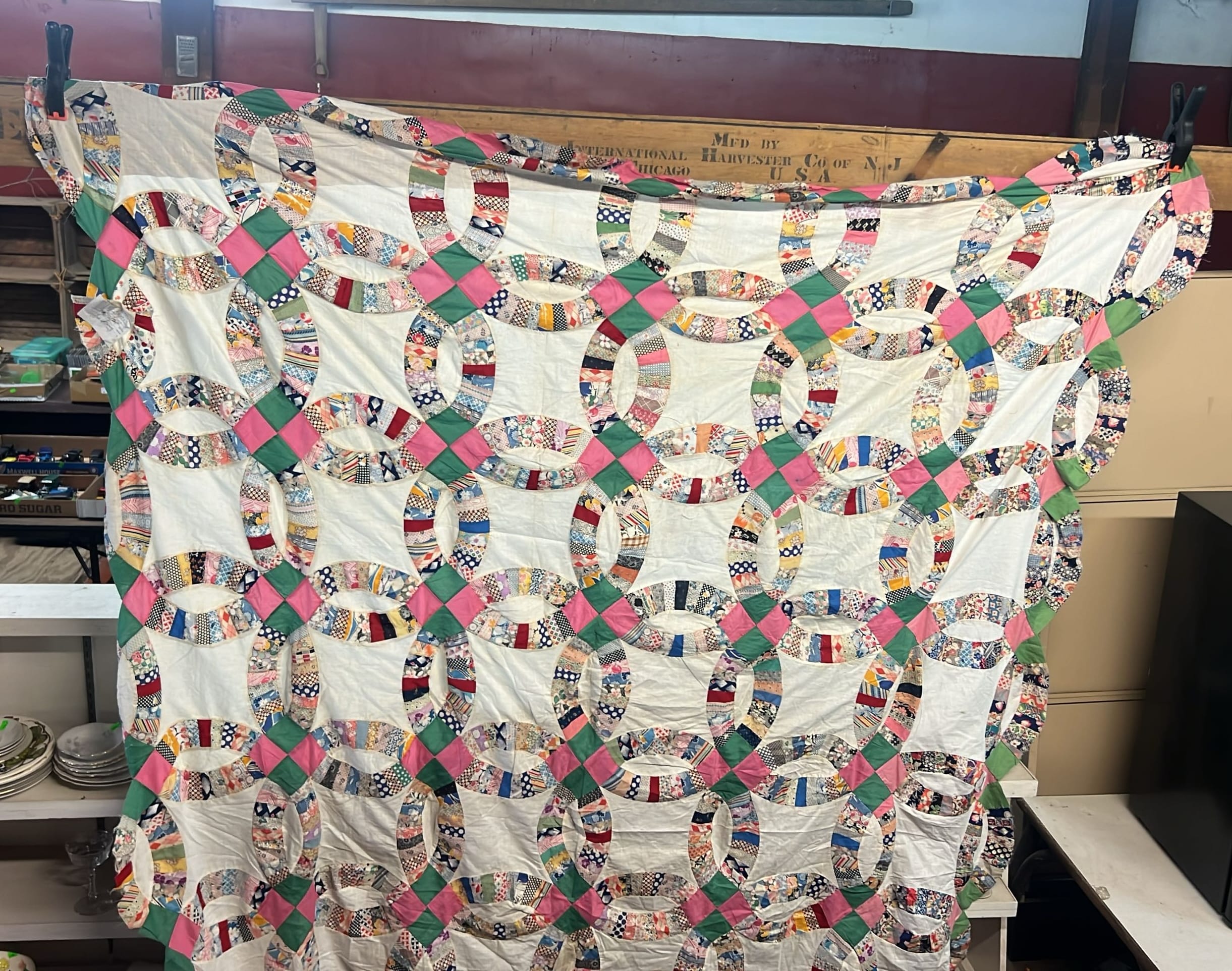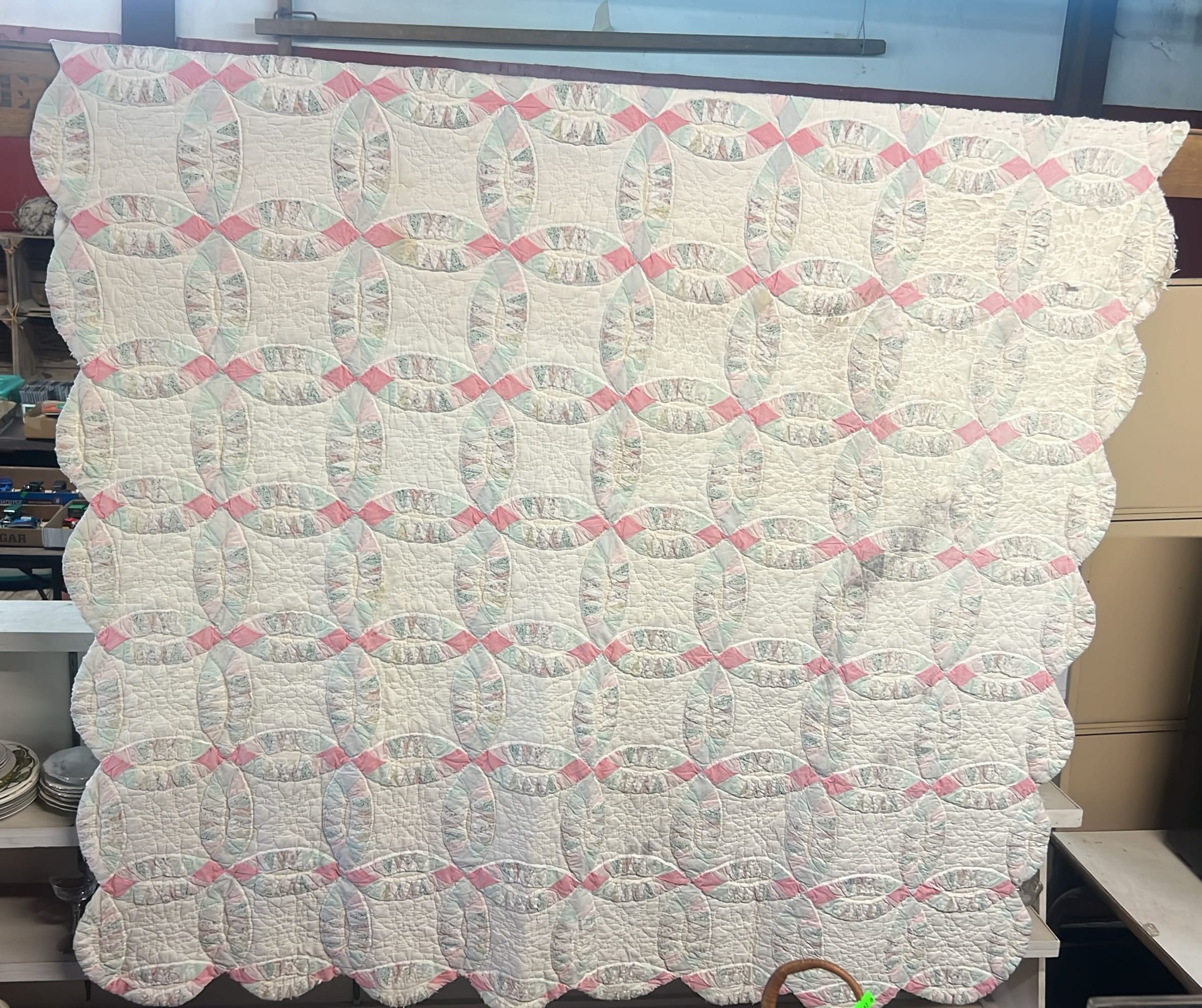 127 Double Wedding Ring Quilt , 80”x88”,has a lot of wear